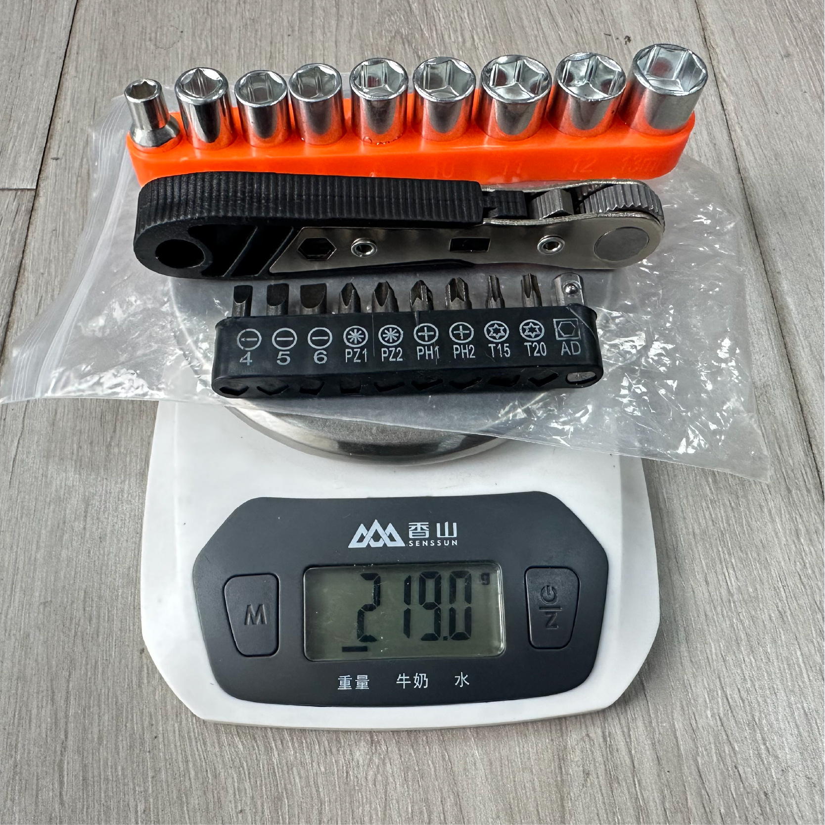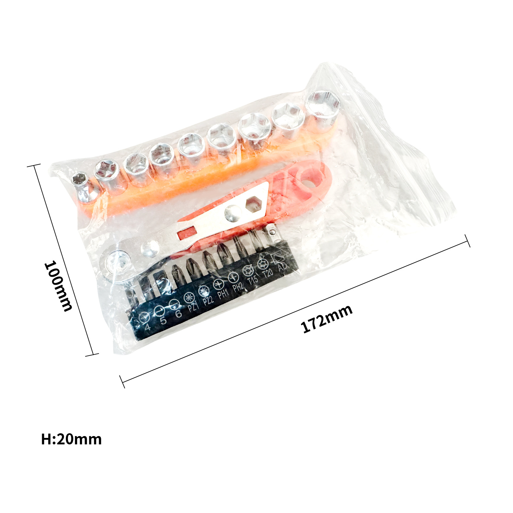 产品名称:   套装:棘轮扳手+12pcs空心批头50mm 包装方式:   塑袋装