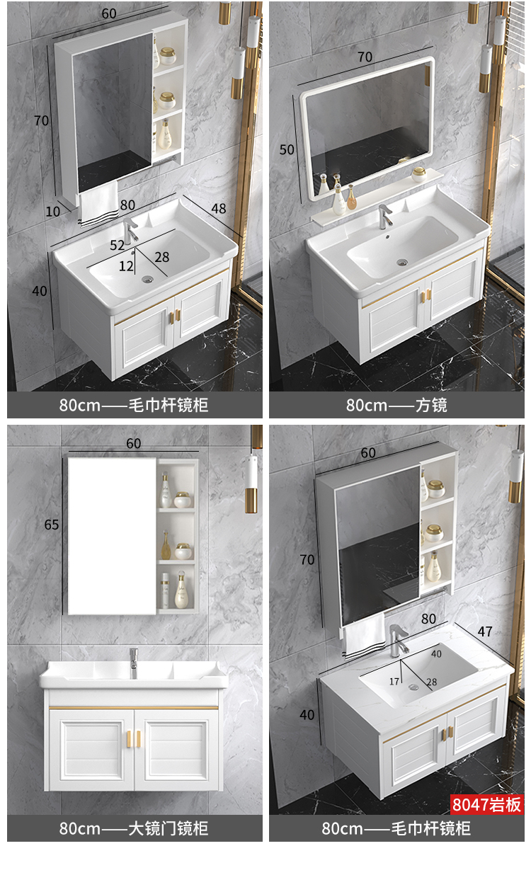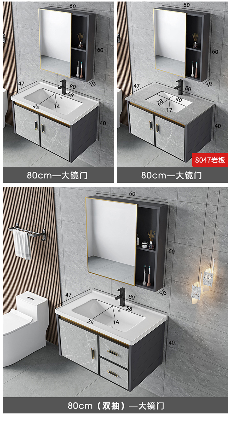 • 스톤 그레인 그레이 교수형 캐비닛 80x48cm 락 플레이트 분지 전체 세트 + [미러 도어 미러 캐비닛]]
