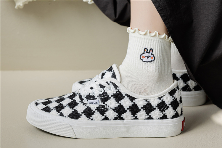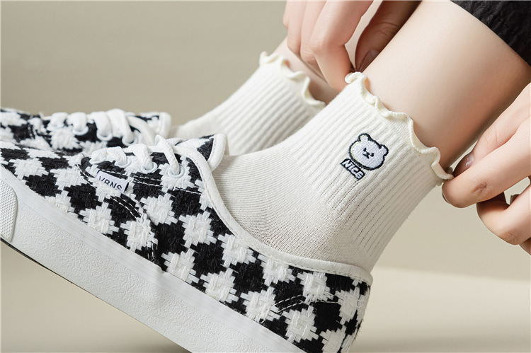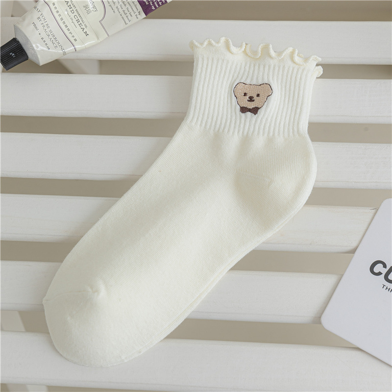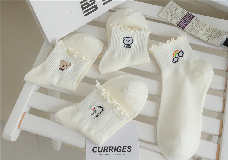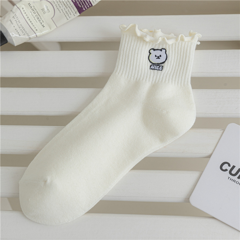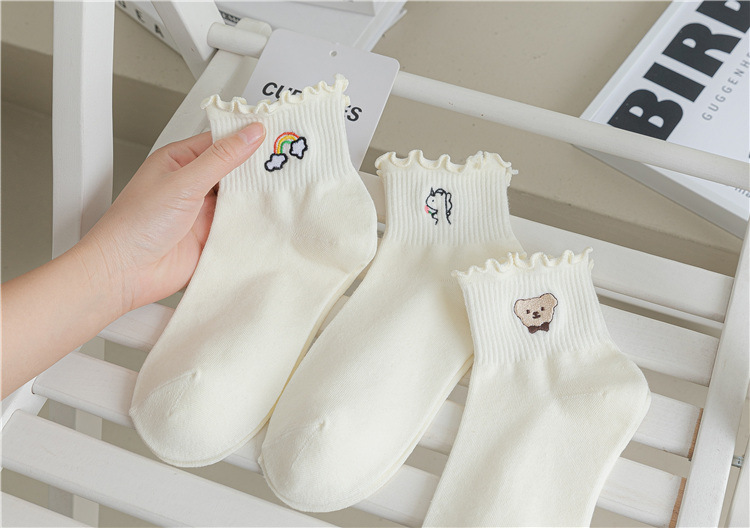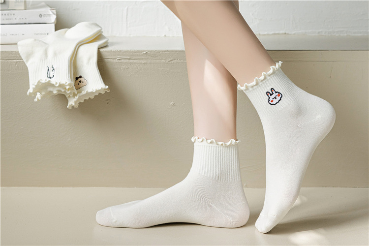 레이스 양말 여성용 봄과 여름 얇은 일본식 귀여운 만화 수 놓은 중간 길이 양말 여성용 밀크 화이트 통기성 면 양말스토어 가기