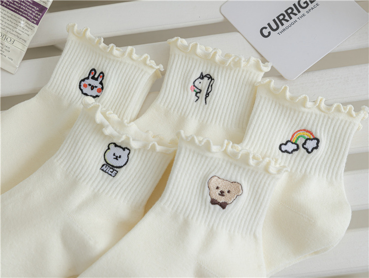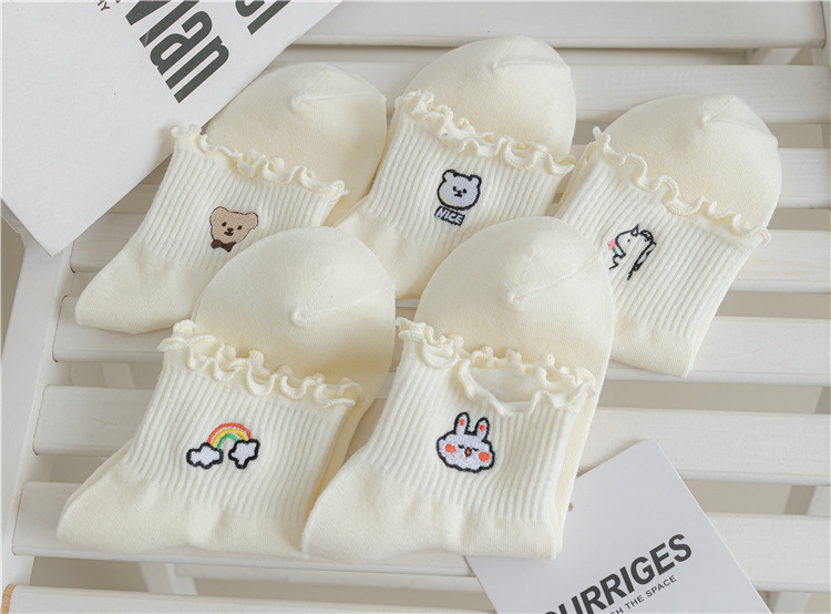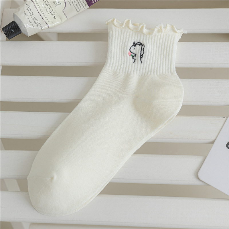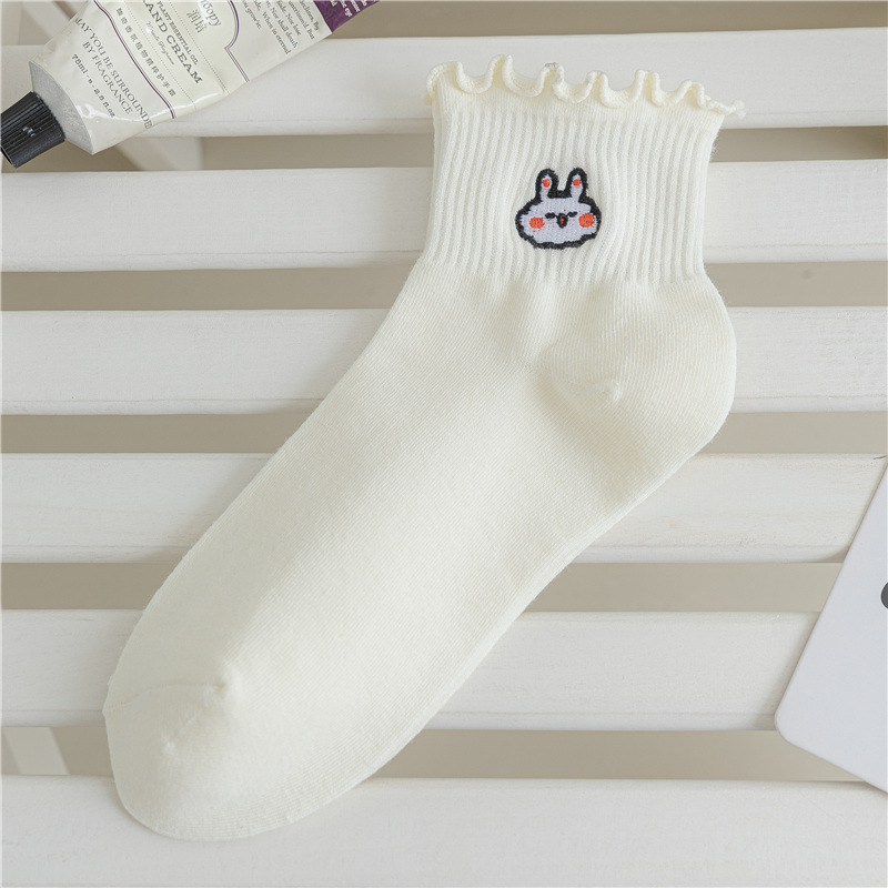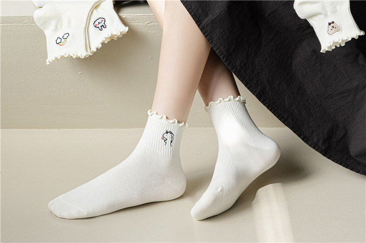 레이스 양말 여성용 봄과 여름 얇은 일본식 귀여운 만화 수 놓은 중간 길이 양말 여성용 밀크 화이트 통기성 면 양말