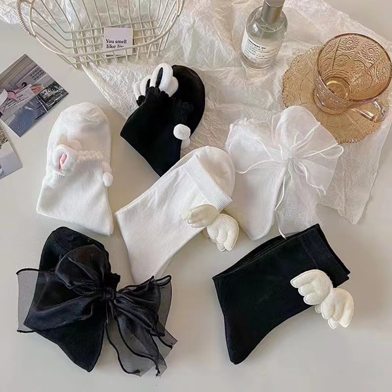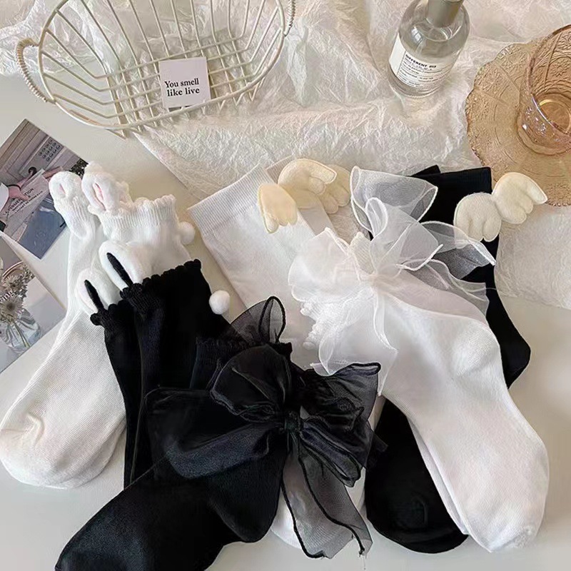 2023 새로운 흑백 양말 여성용 귀여운 날개 jk 양말 일본식 레이스 유행 중간 길이 면 얇은 양말