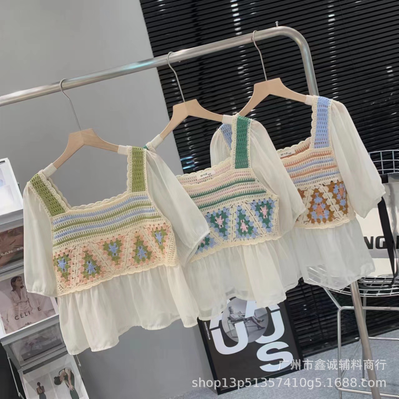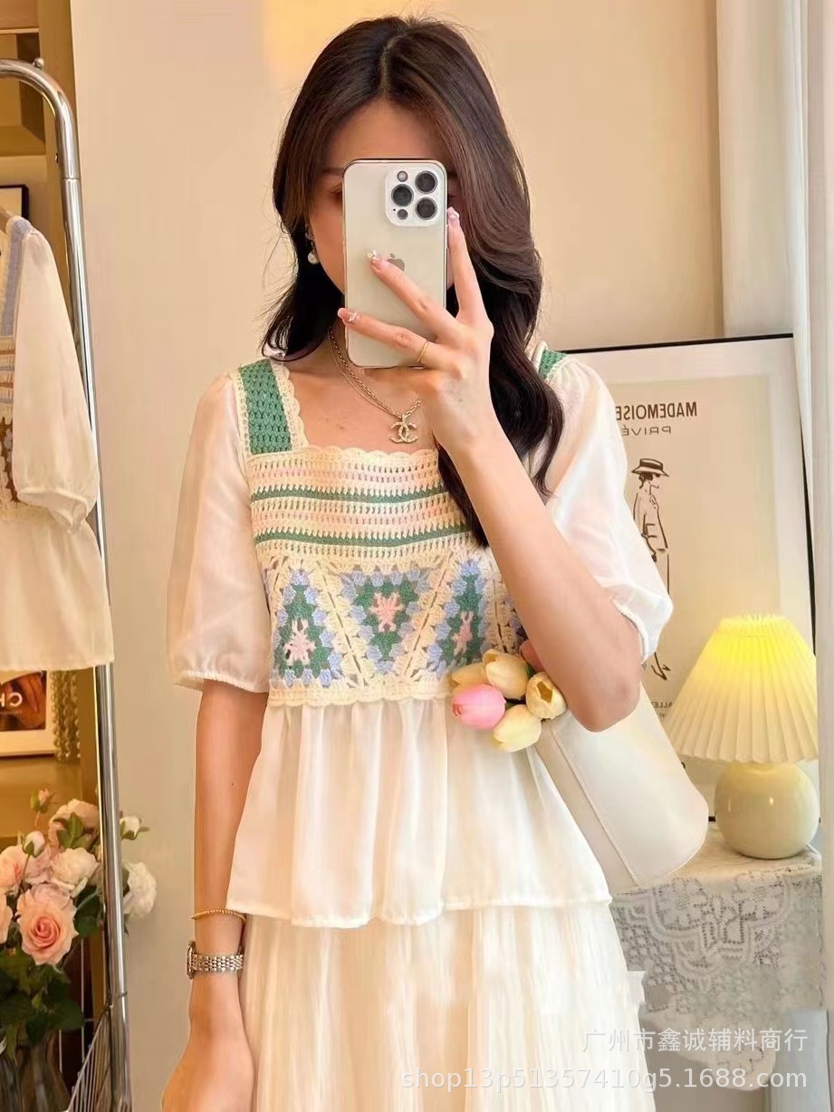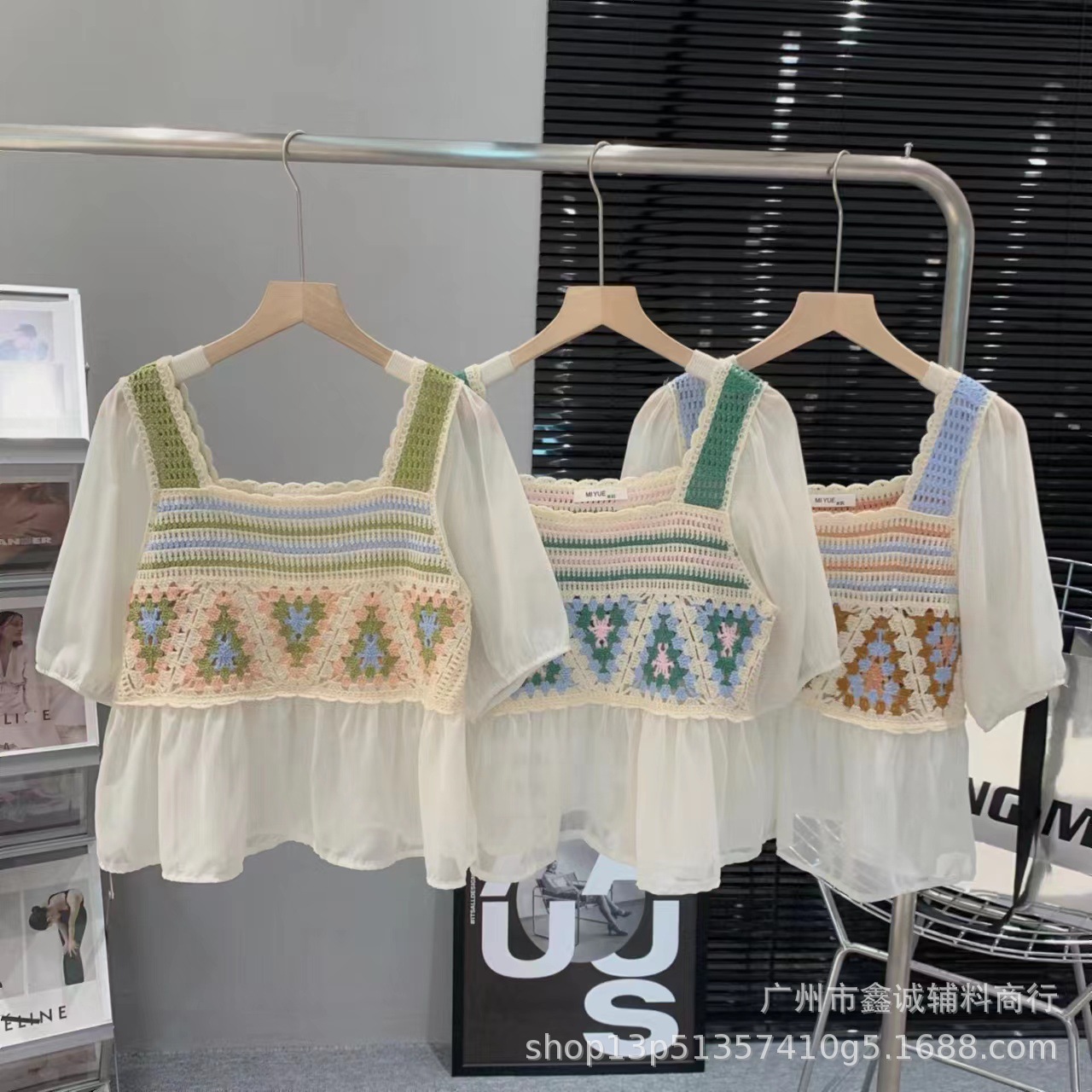 프랑스식 중공 대비 스티칭 스퀘어 칼라 반팔 쉬폰 셔츠 여성용 여름 우아한 연령 감소 서양식 트렌디 쇼트 탑