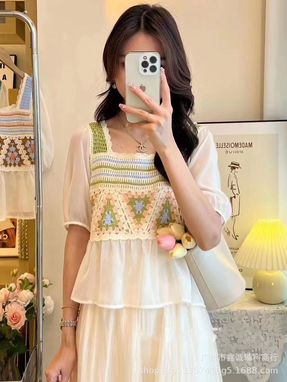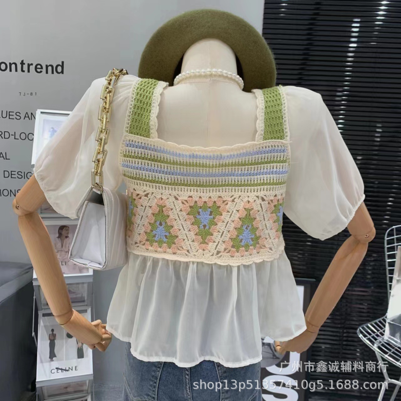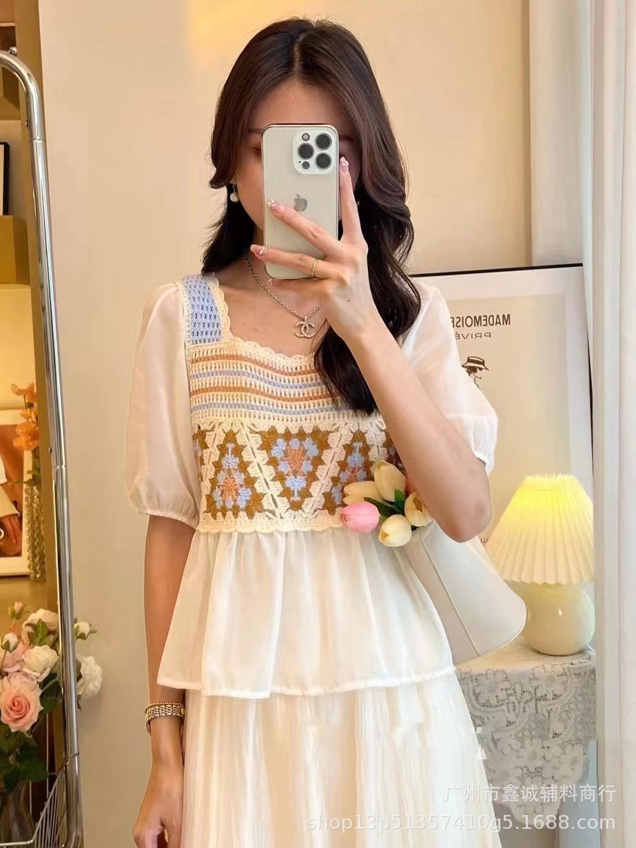 프랑스식 중공 대비 스티칭 스퀘어 칼라 반팔 쉬폰 셔츠 여성용 여름 우아한 연령 감소 서양식 트렌디 쇼트 탑