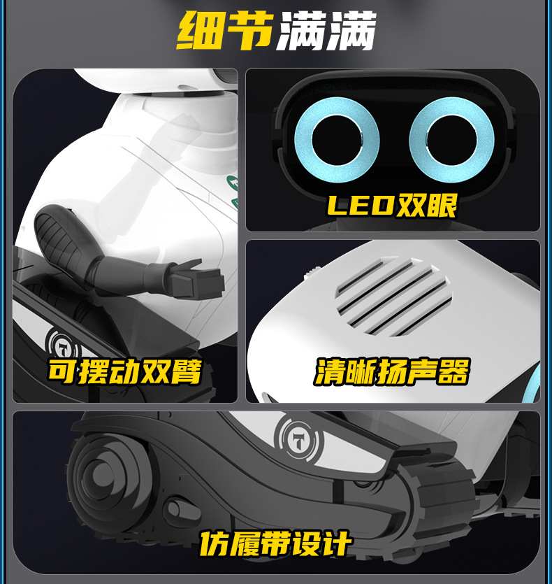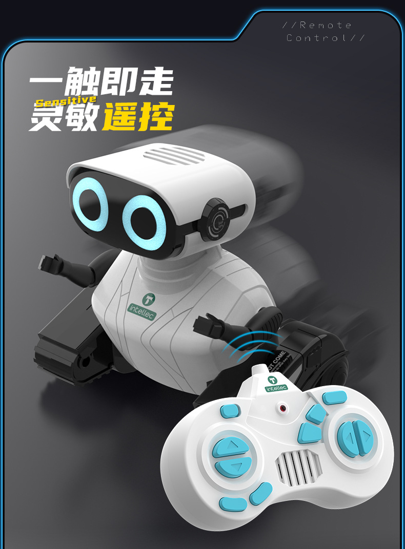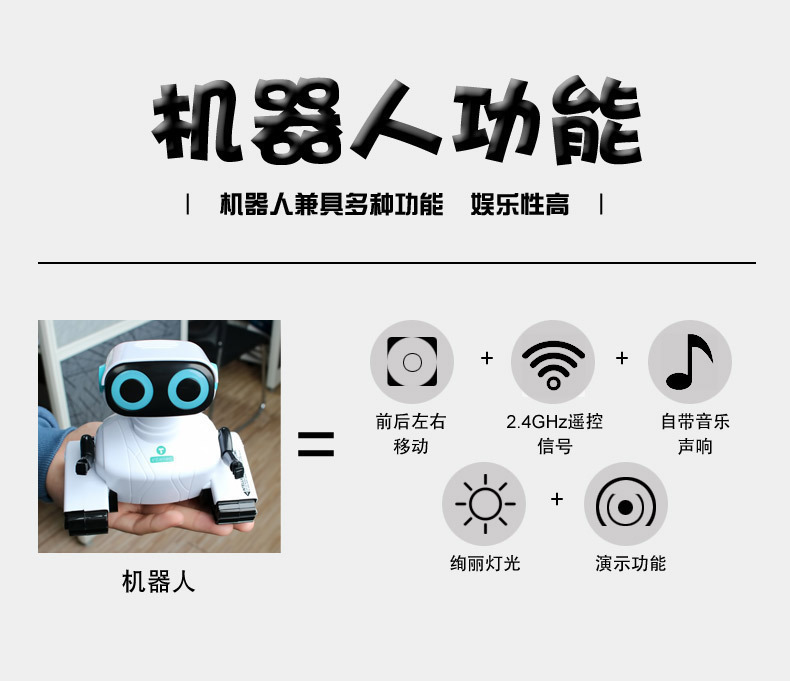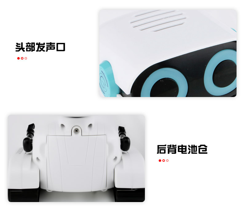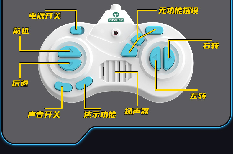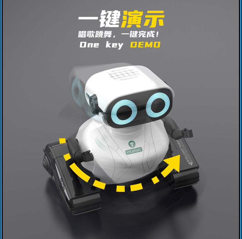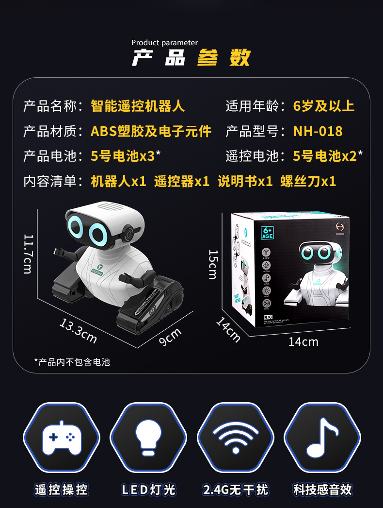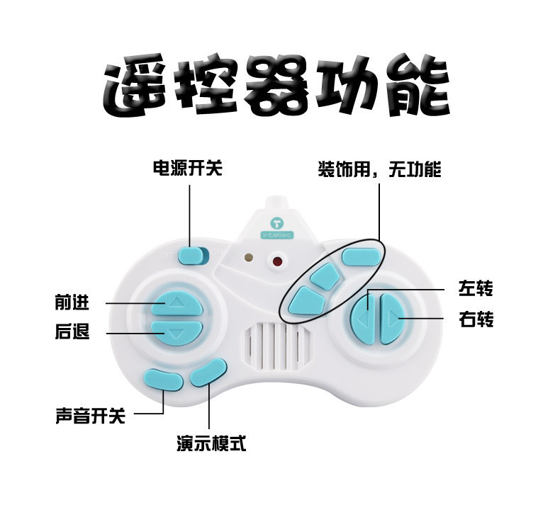 功能:前进、后退、左转、右转、声音开关、自动演示、产品重量:256g