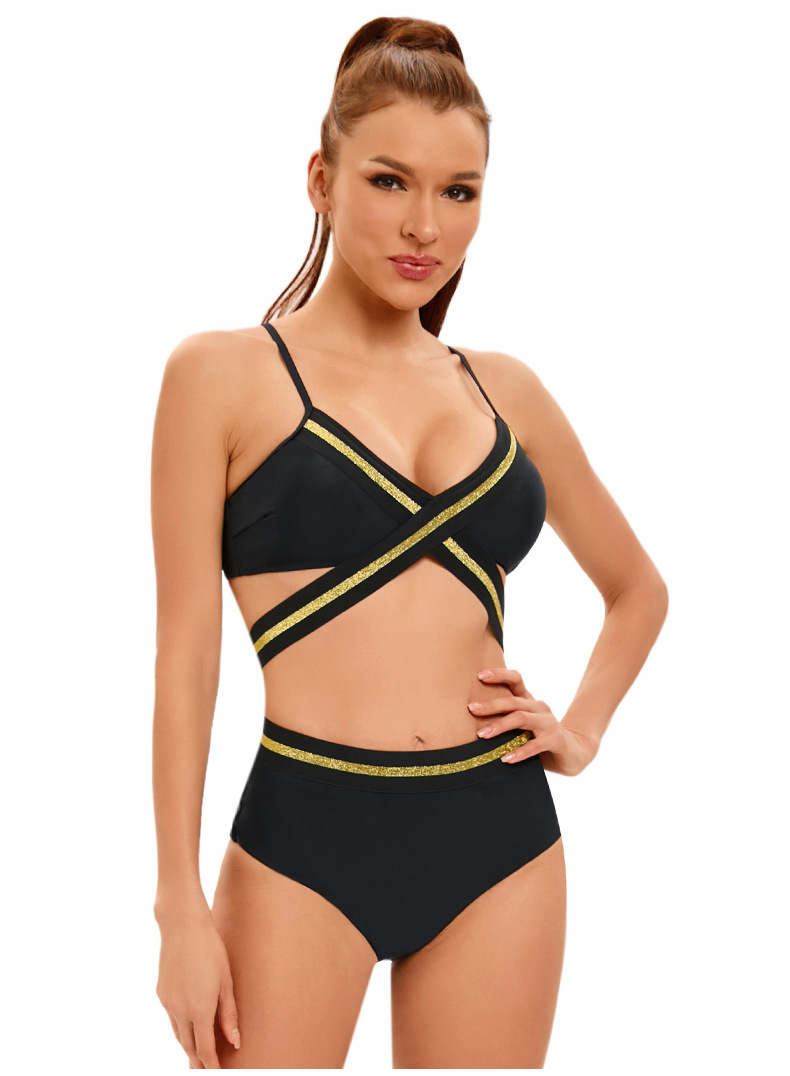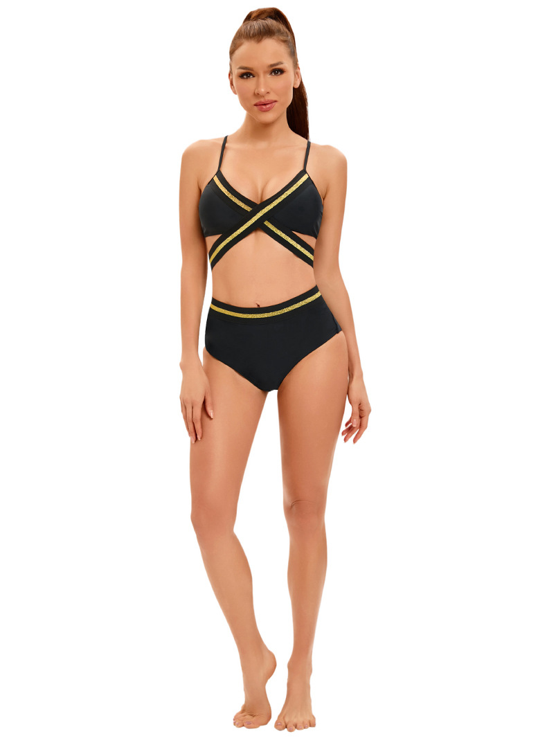 2023 크로스 보더 새로운 단색 하이 웨이스트 스플릿 수영복 여성용 유럽과 미국 섹시한 비키니 크로스 스트랩 중공 수영복