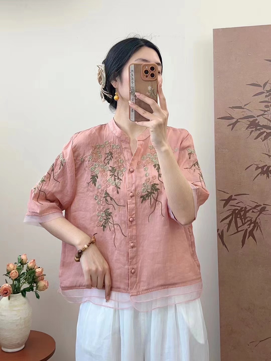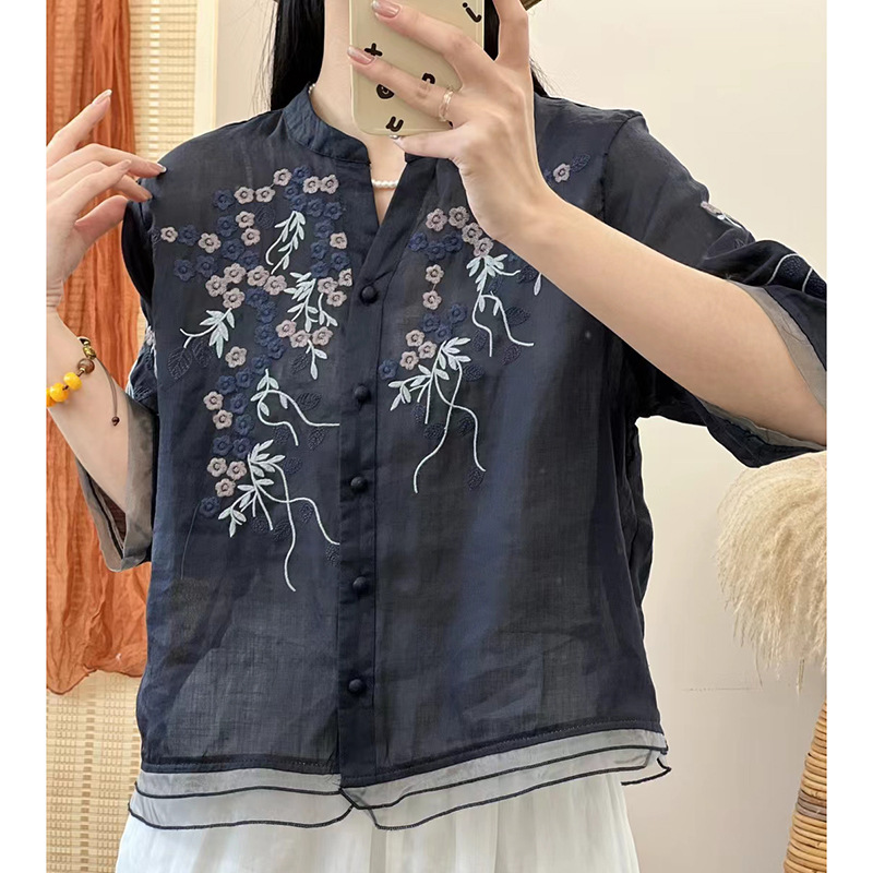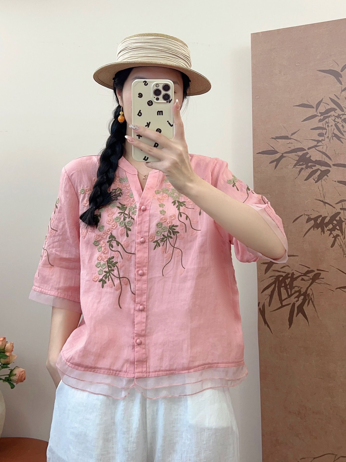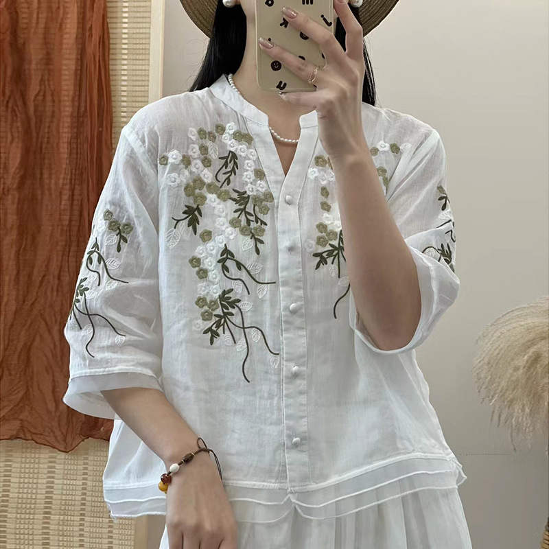 2025 년 여름 새로운 V 넥 싱글 브레스트 7 소매 셔츠 단색 예술적 자수 루즈 라미 셔츠