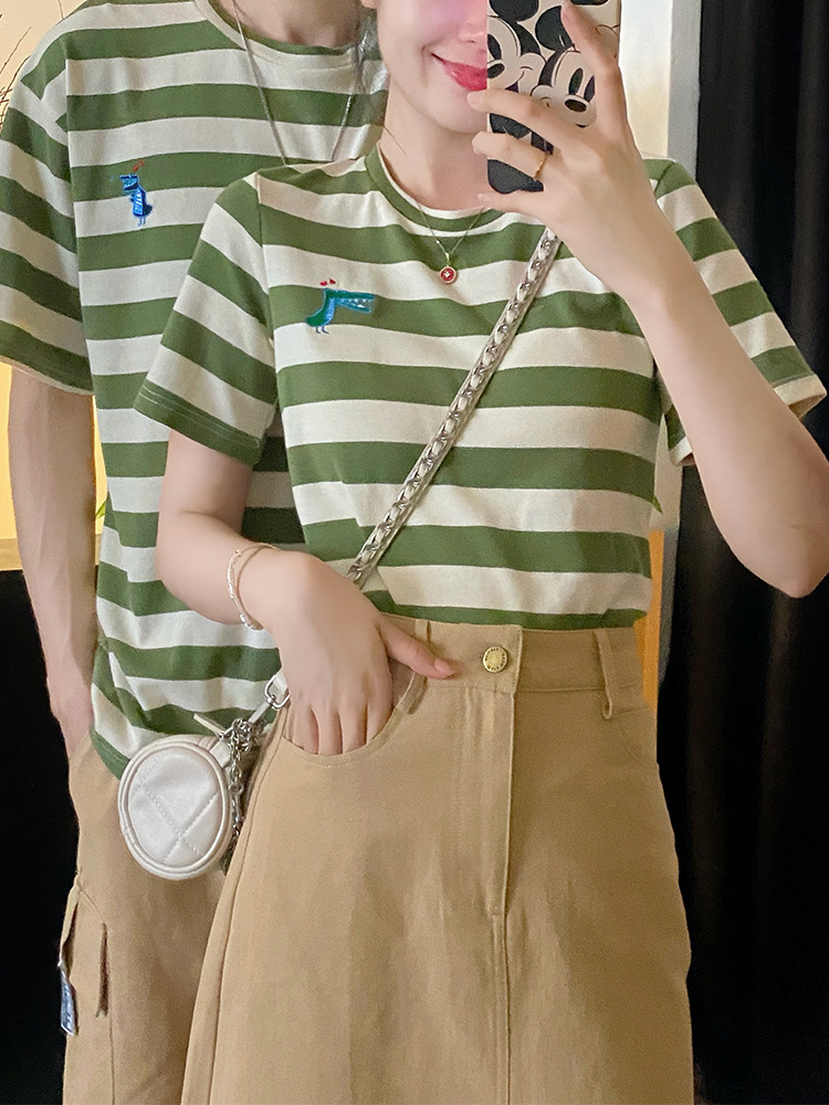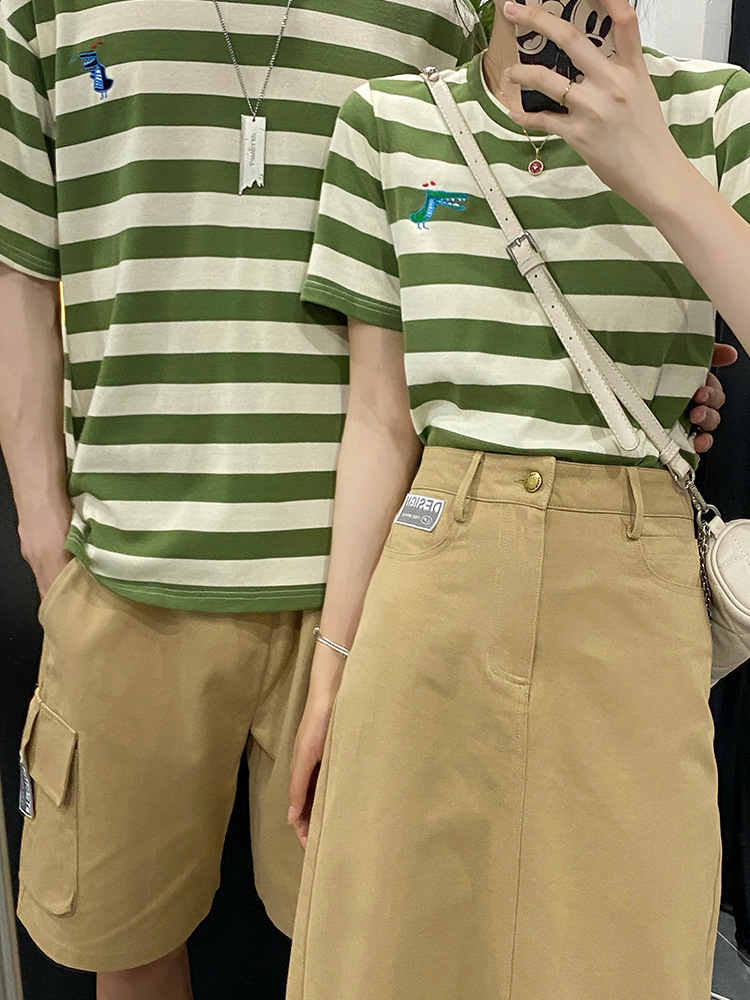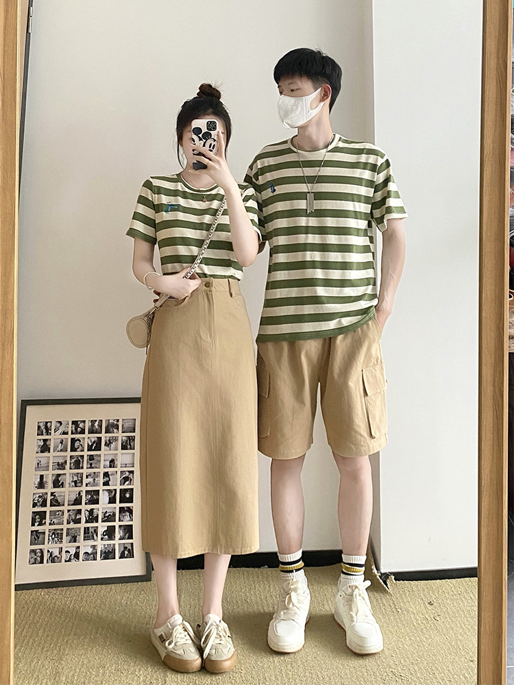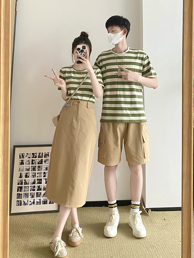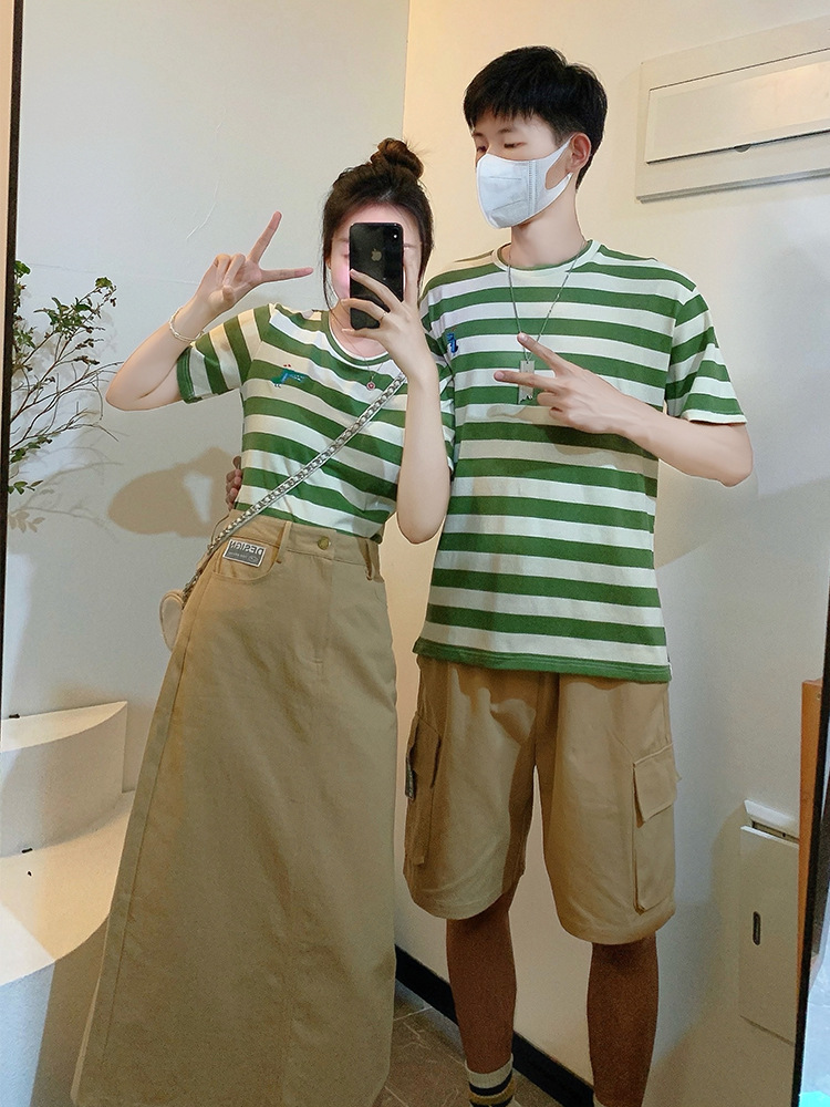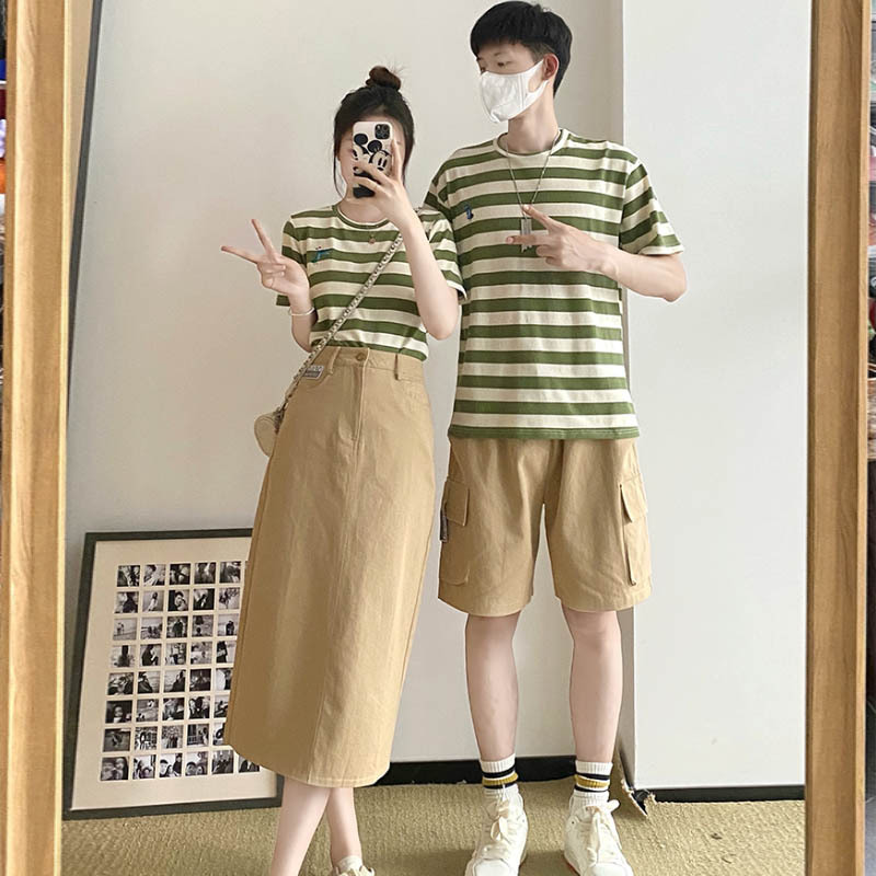 커플 원피스 2023 여름 신상품 홍콩 스타일 캠퍼스 스타일 한국 스타일 디자인 감각 스트라이프 반팔 티셔츠 스커트 세트스토어 가기