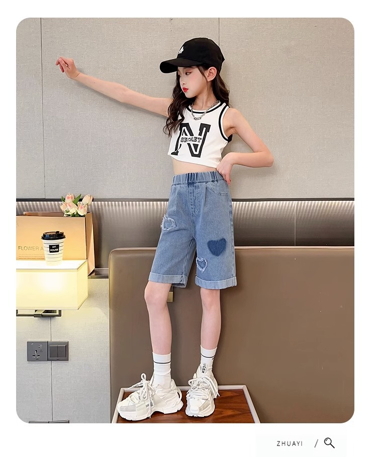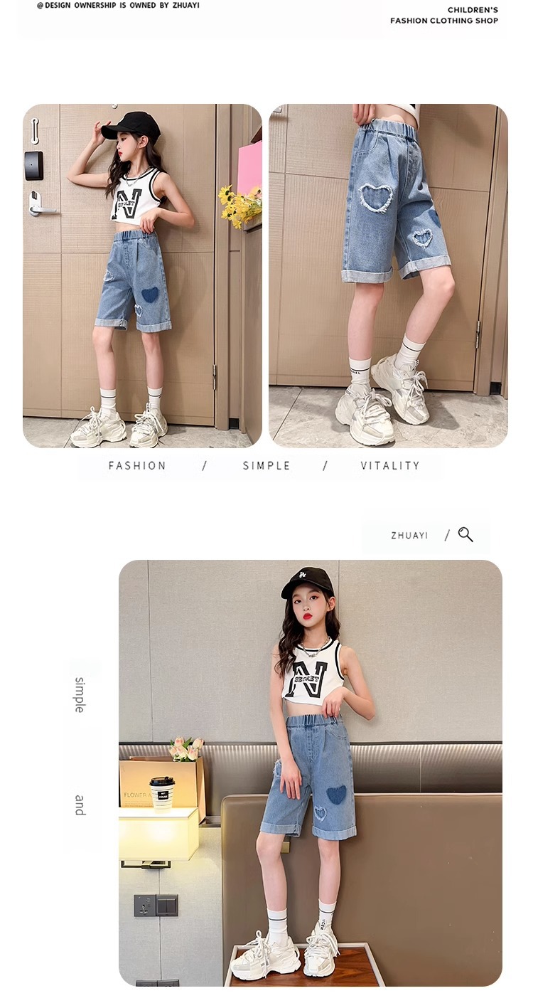 여아 데님 중간 길이 바지 2023 신상 여름 착용 모든 매치 크고 작은 아동 캐주얼 5,6 바지 리틀 여아 반바지스토어 가기
