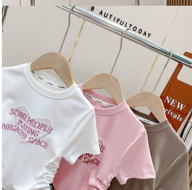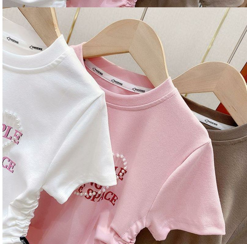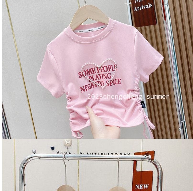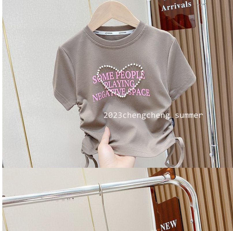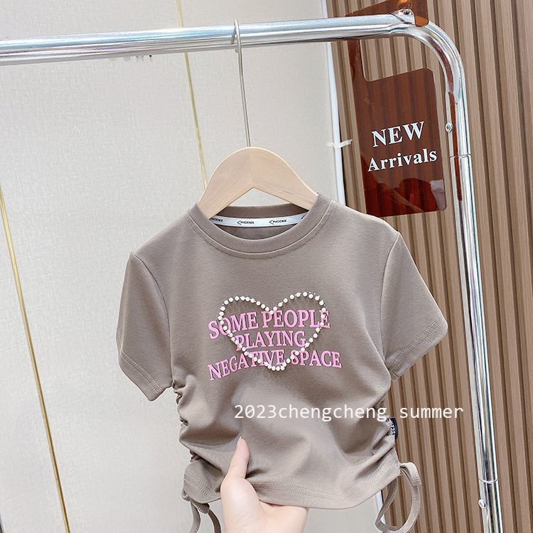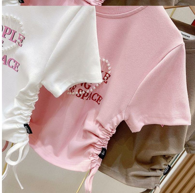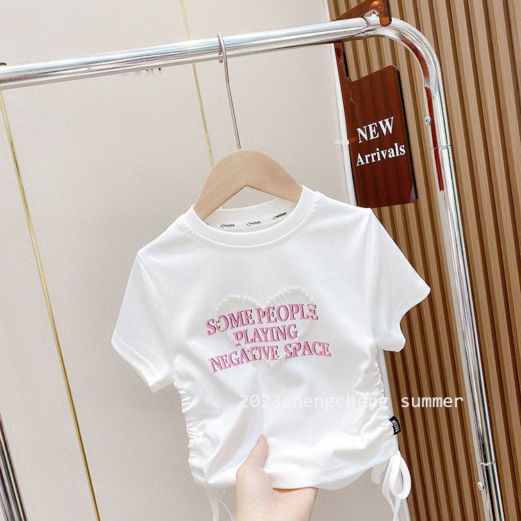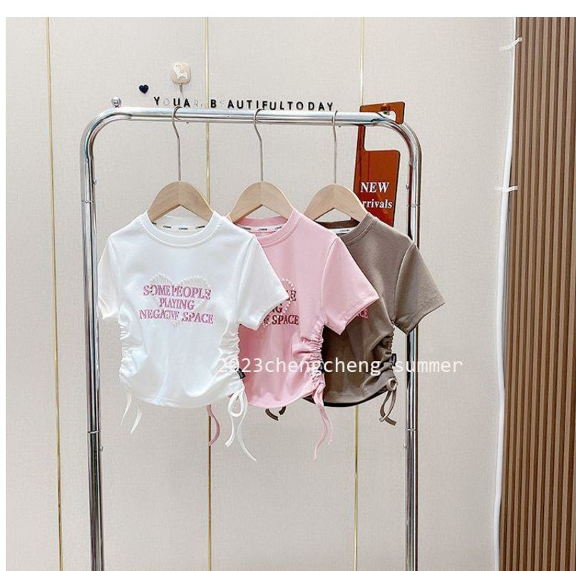 한국 스타일 아동복 2025 소녀 여름 패션 간단한 편지 짧은 티셔츠 어린이 얼음 실크 졸라 매는 끈 반팔 탑스토어 가기