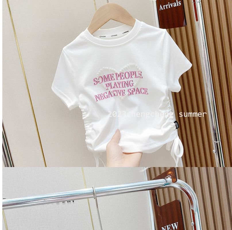 한국 스타일 아동복 2025 소녀 여름 패션 간단한 편지 짧은 티셔츠 어린이 얼음 실크 졸라 매는 끈 반팔 탑