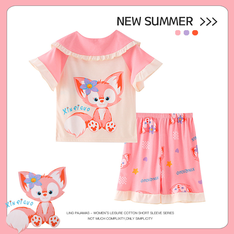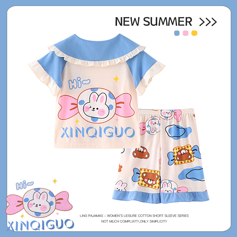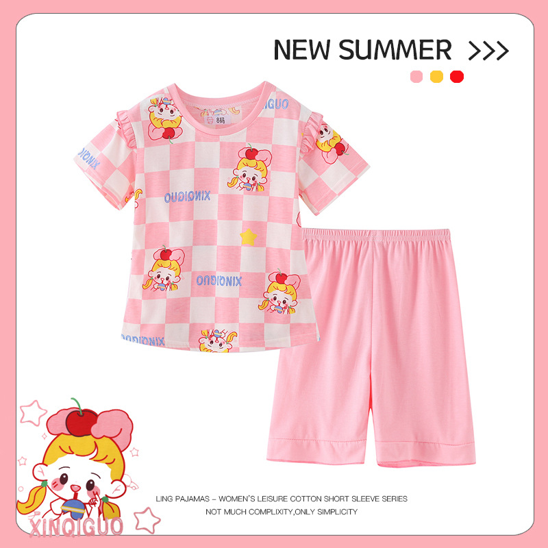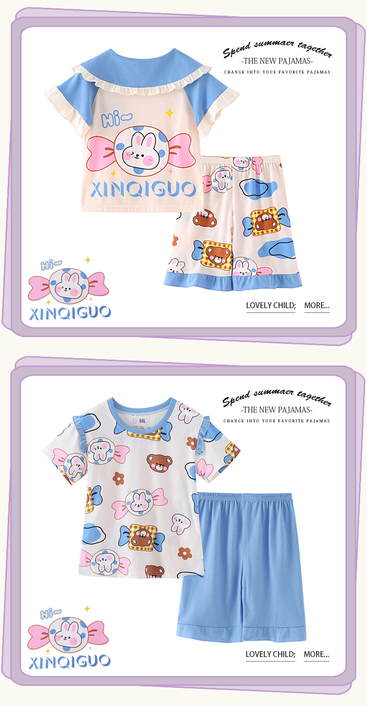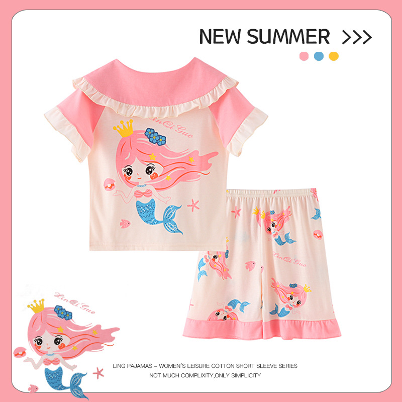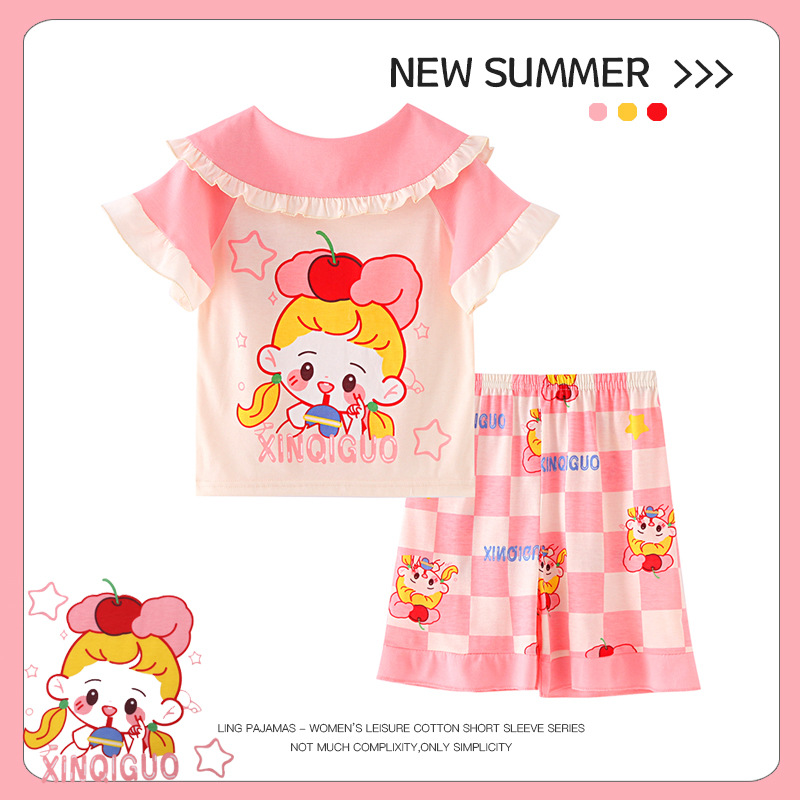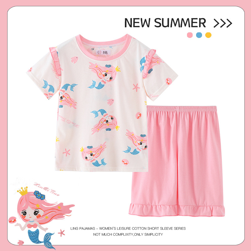 여자 잠옷 여름 얇은 빗질 면 짧은 소매 세트 어린이 어린 소녀의 귀여운 중간 큰 어린이 서양 스타일 가정 옷