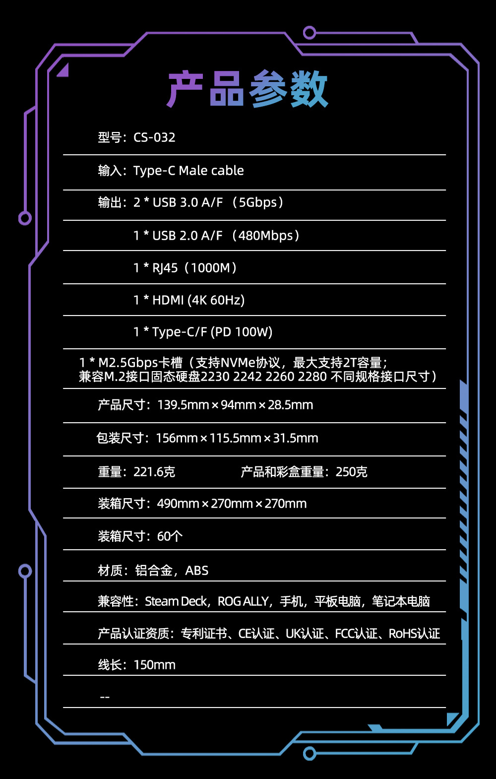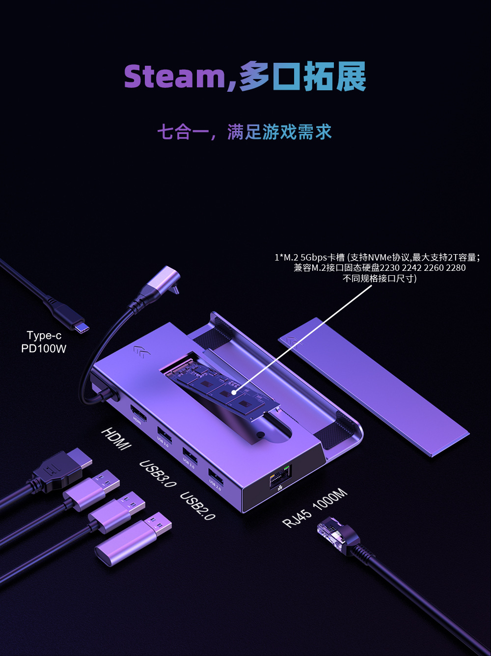 7-in-1 스팀 덱 M.2 휴대용 알루미늄 합금 베이스 타입-C 허브 다중 인터페이스