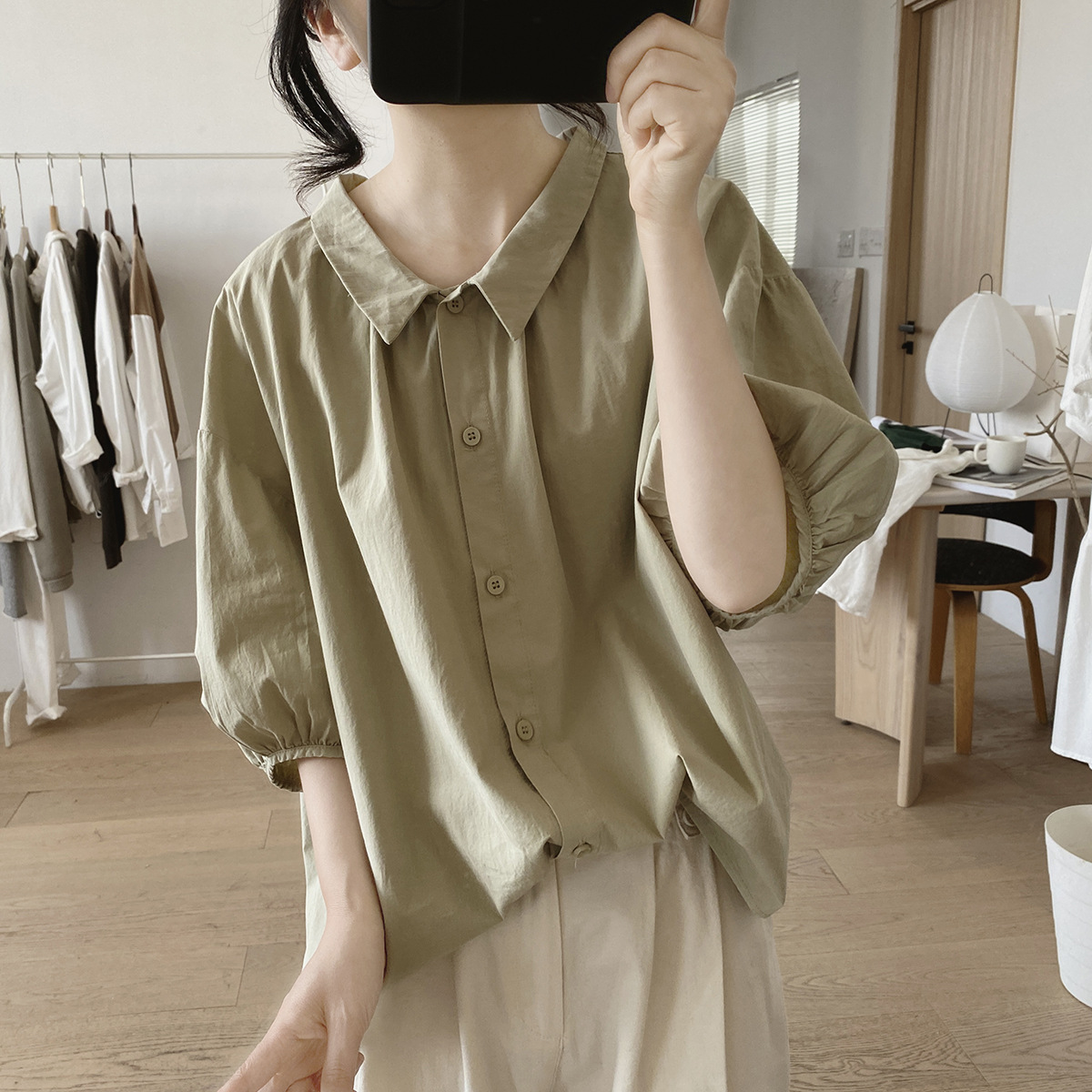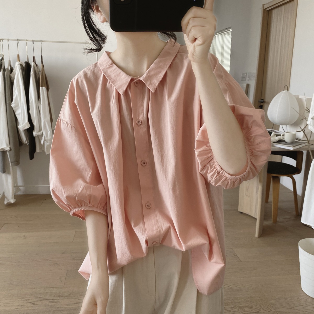 여름 새로운 인형 칼라 셔츠 여자의 느슨한 플러스 사이즈 슬리밍 틈새 디자인 감각 랜턴 슬리브 코튼 탑스토어 가기