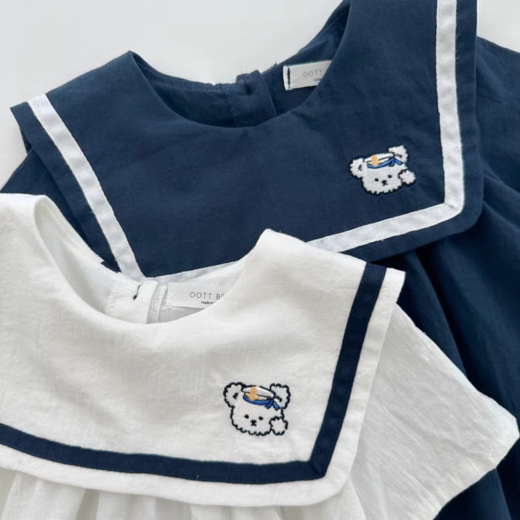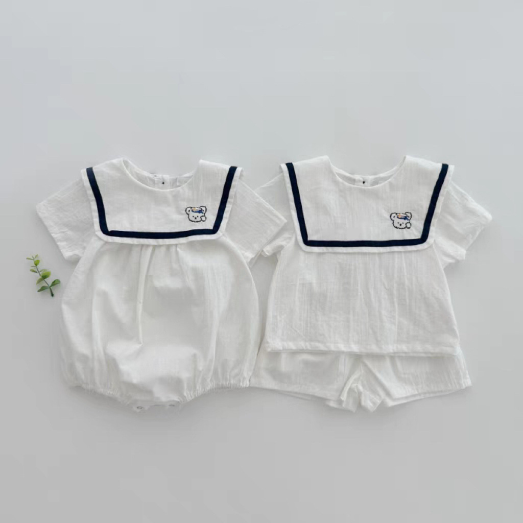 한국 스타일 인스 타 그램 스타일 여름 파우치 아기와 어린 아이들을위한 반팔 네이비 스타일 옷깃 토끼 옷 가정 및 아웃 모든 경기 부드러운 아동복