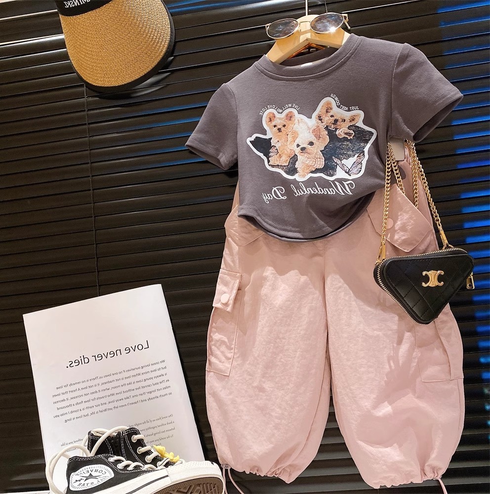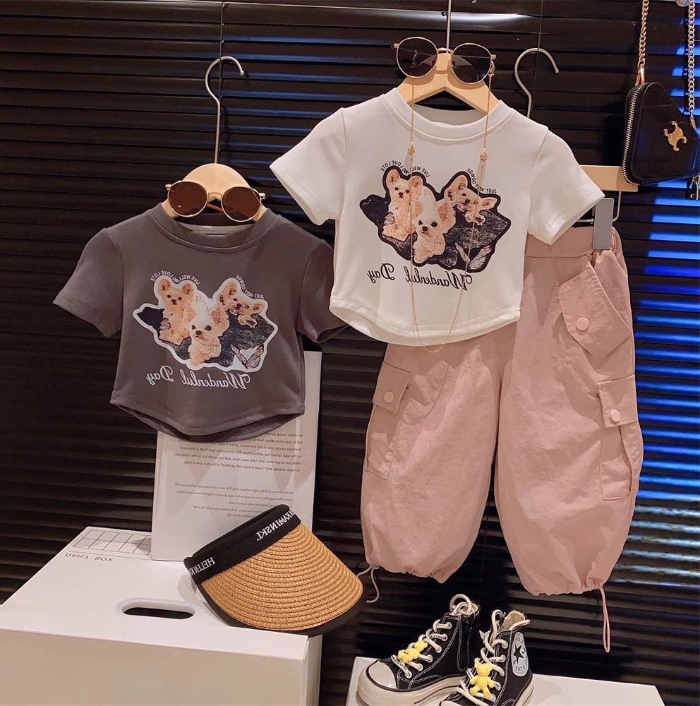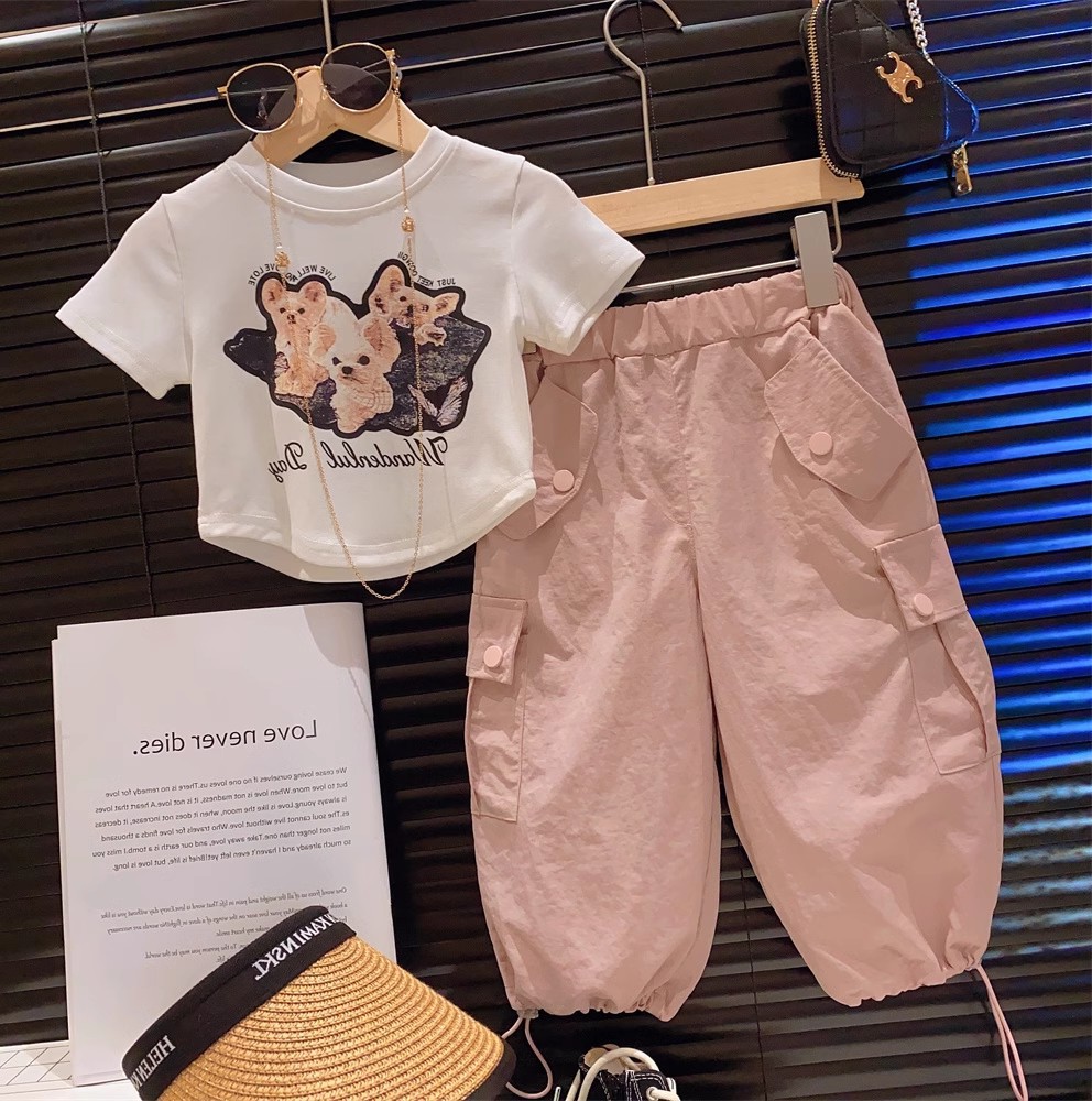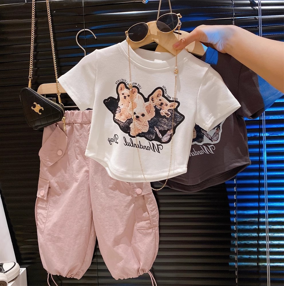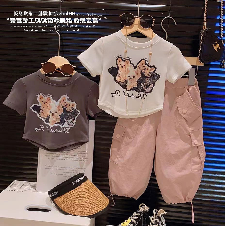 여아 정장, 만화 동물 반팔 티셔츠, 작업복 바지 25 여름 신상품, 대외 무역 아동복 직배송