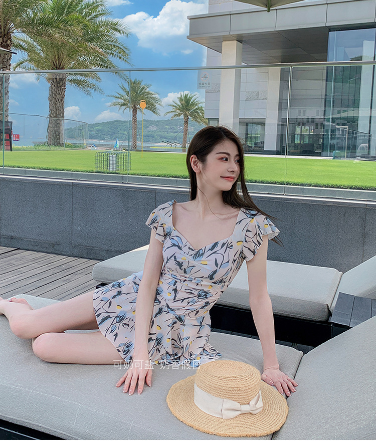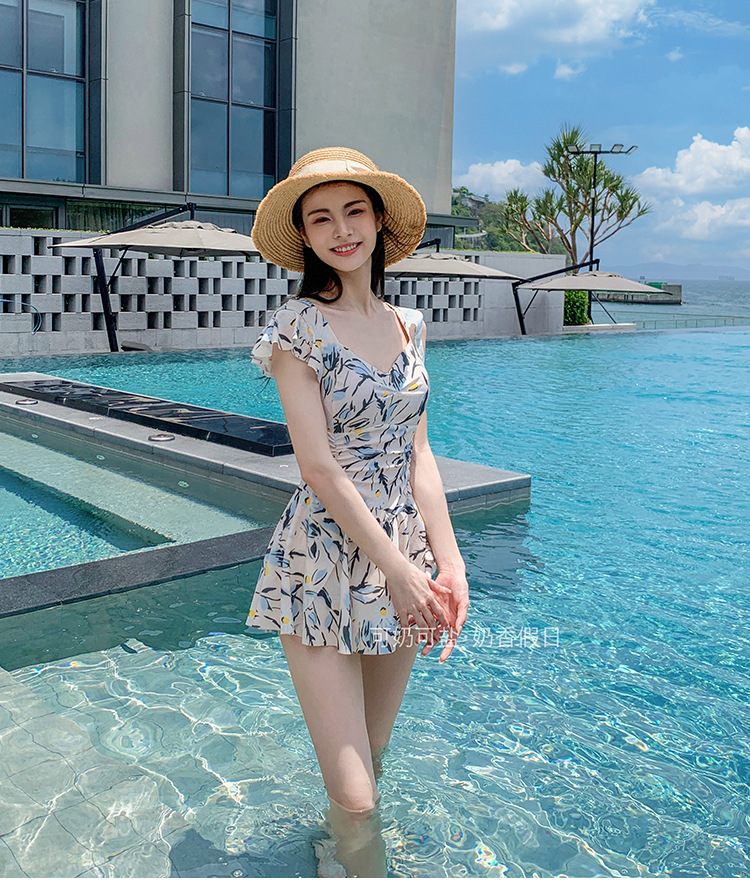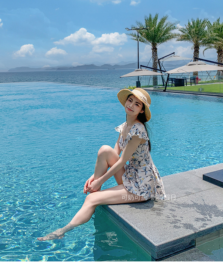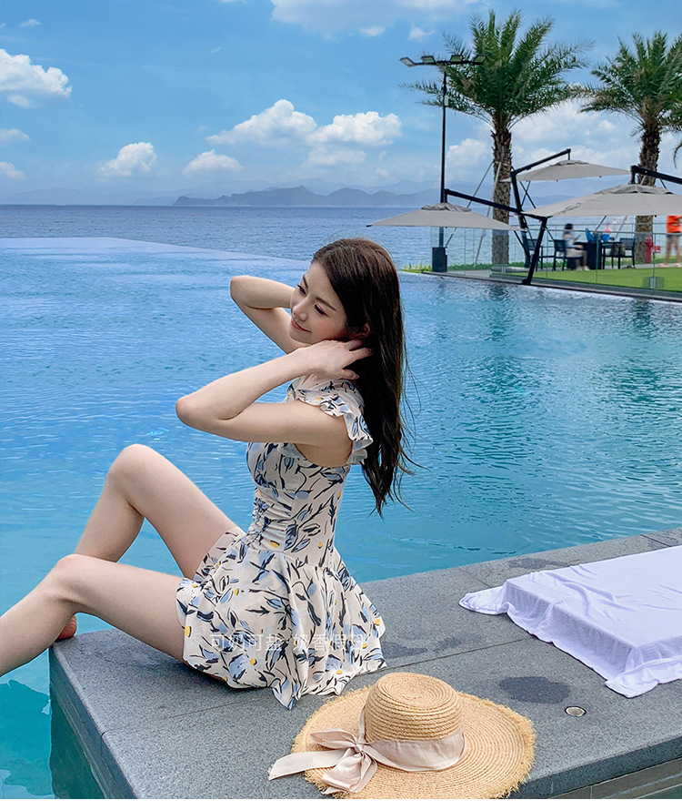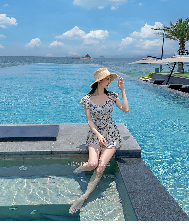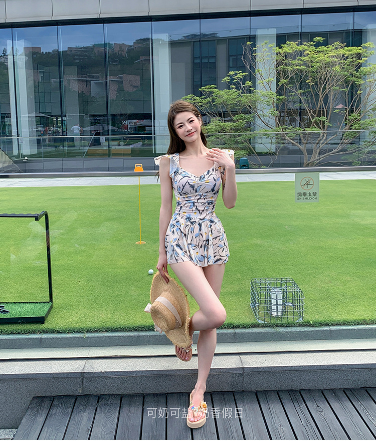 2025 새로운 꽃 무늬 원피스 수영복 여성 복서 프릴 보수적 인 소녀 스트랩 홀터 하이 웨이스트 배꼽 커버 온천스토어 가기