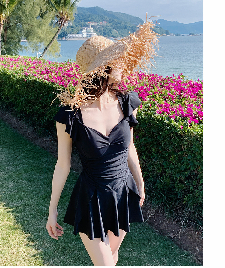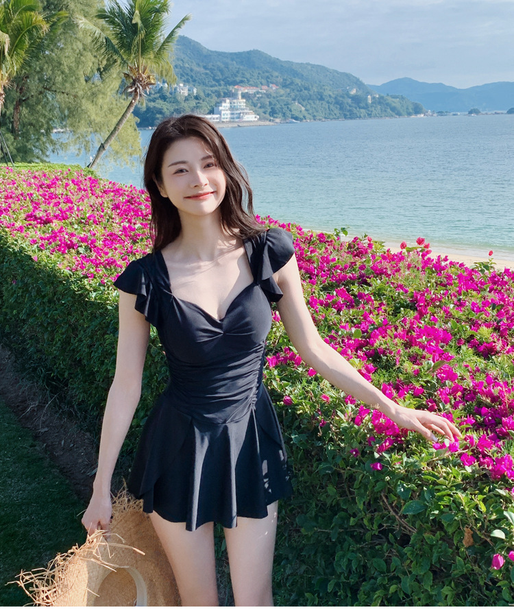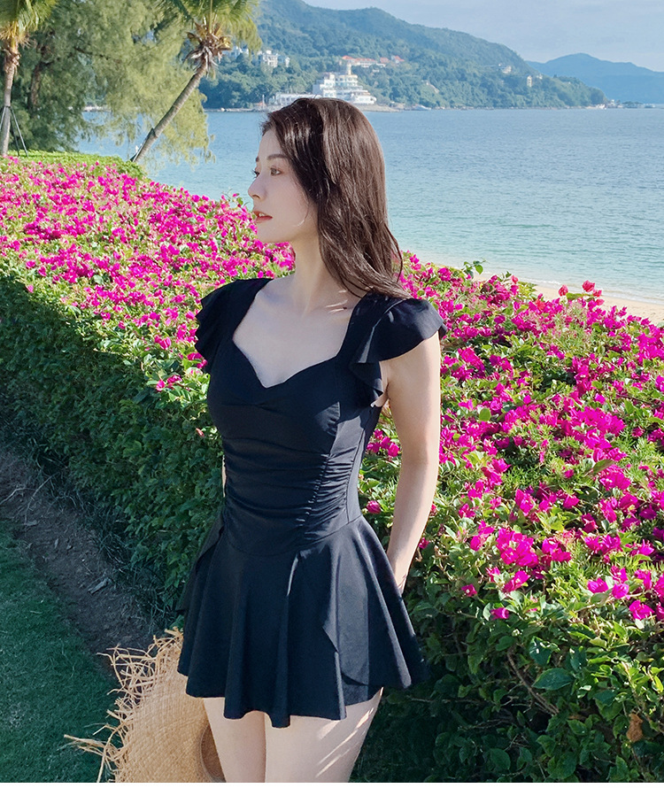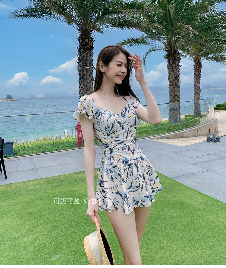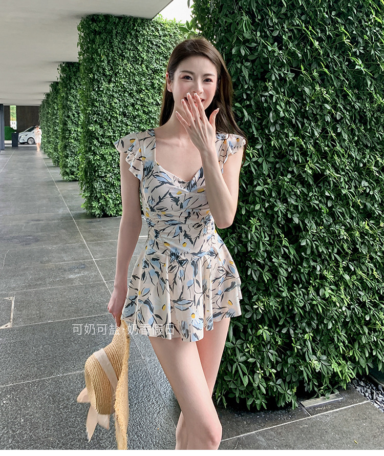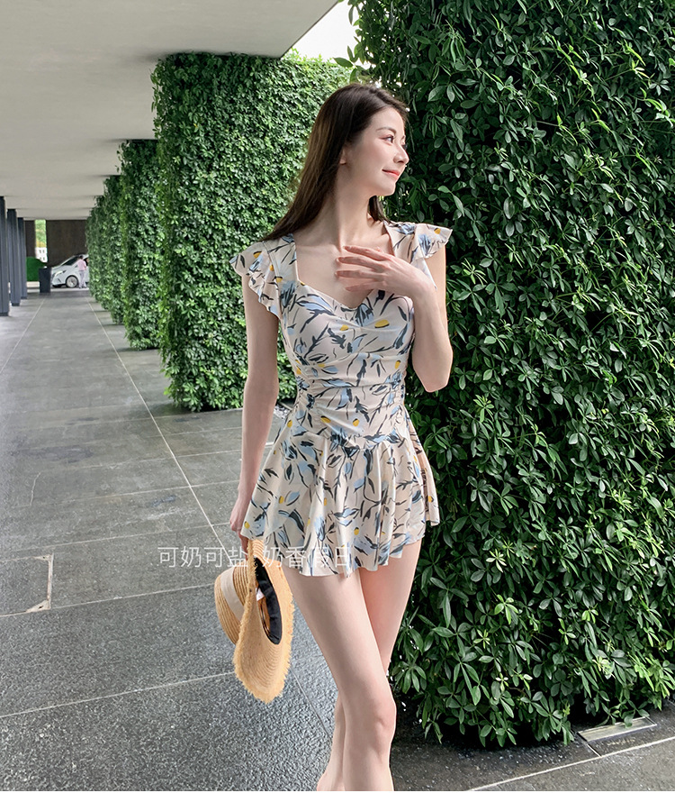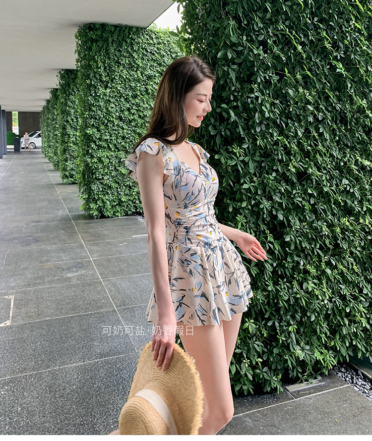 2025 새로운 꽃 무늬 원피스 수영복 여성 복서 프릴 보수적 인 소녀 스트랩 홀터 하이 웨이스트 배꼽 커버 온천