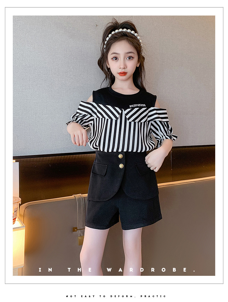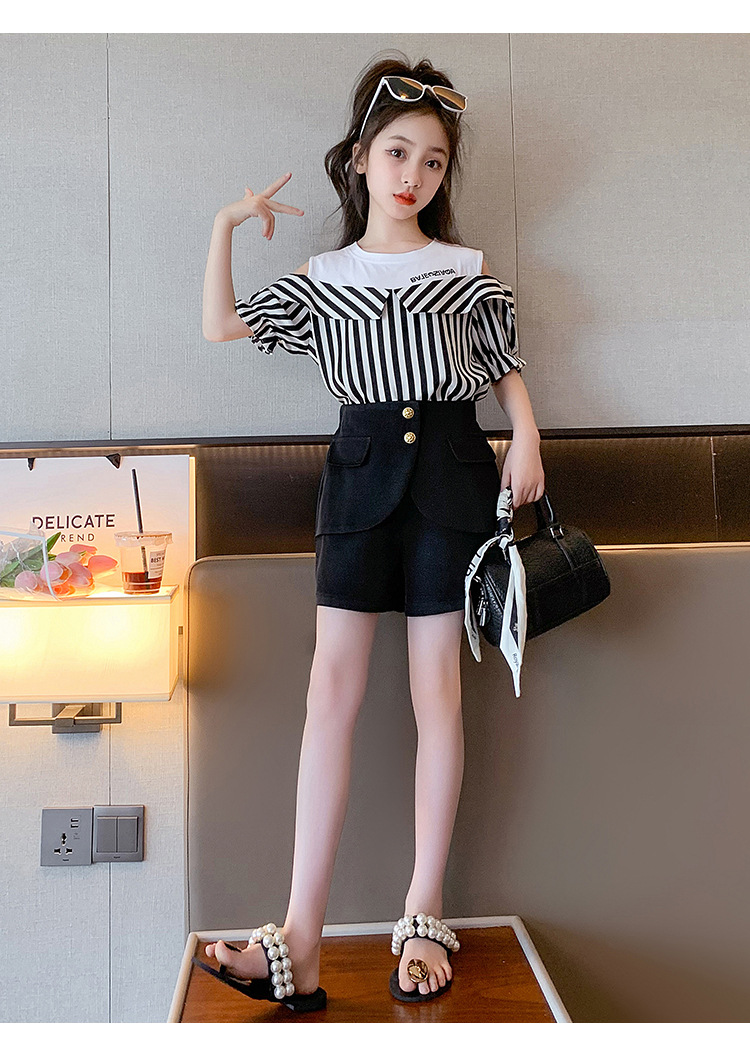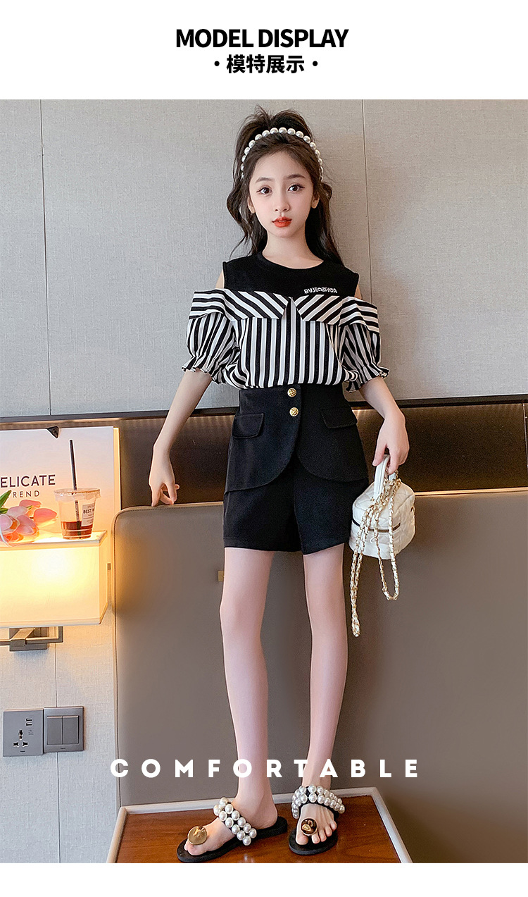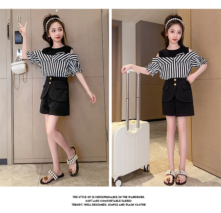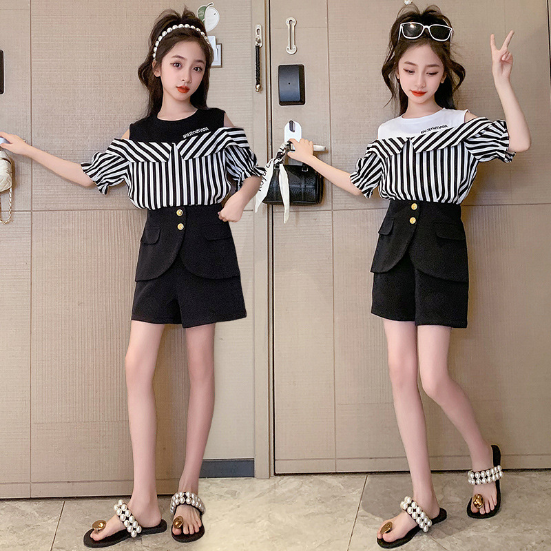 여아 여름 세트 2023 새로운 인터넷 연예인 아동 서양식 오프숄더 반팔 아동 여름 스커트 투피스 세트