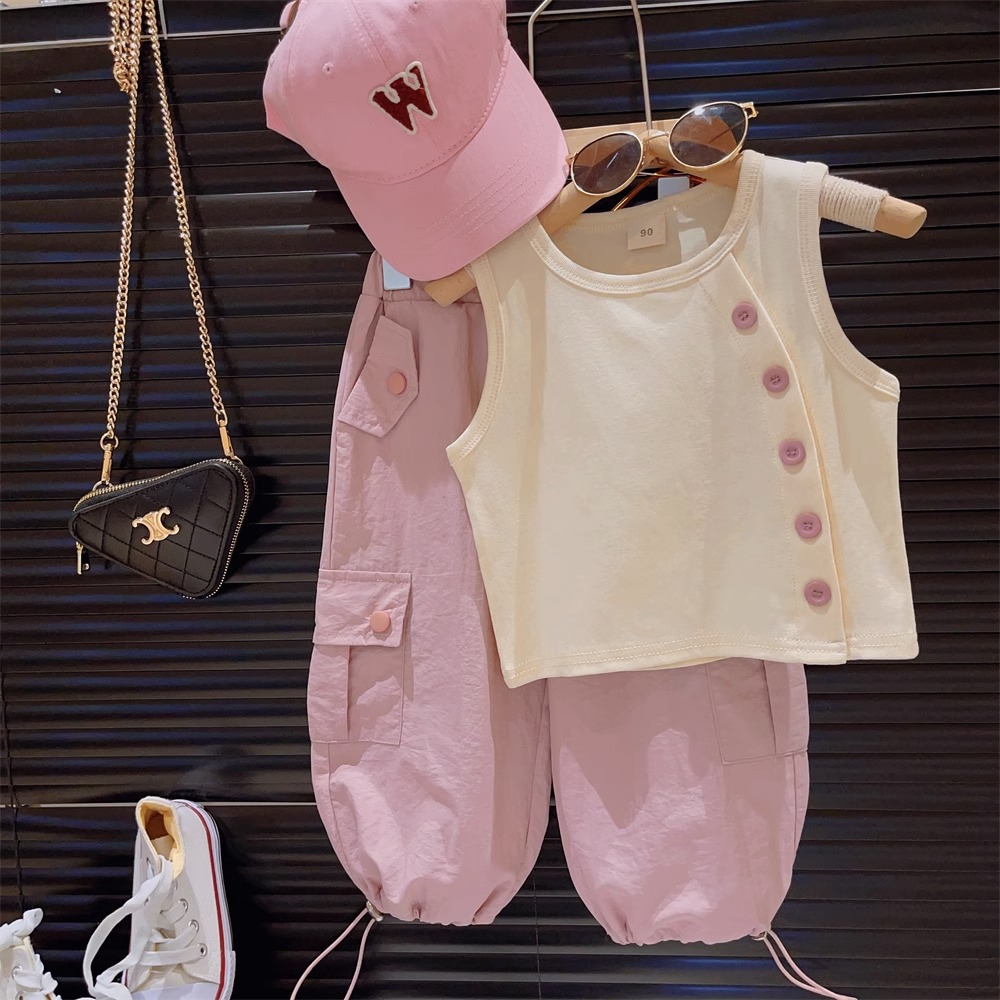 소녀 세트 2024 여름 불규칙 경사 버클 탄성 조끼 서양식 작업 바지 투피스 세트 95163