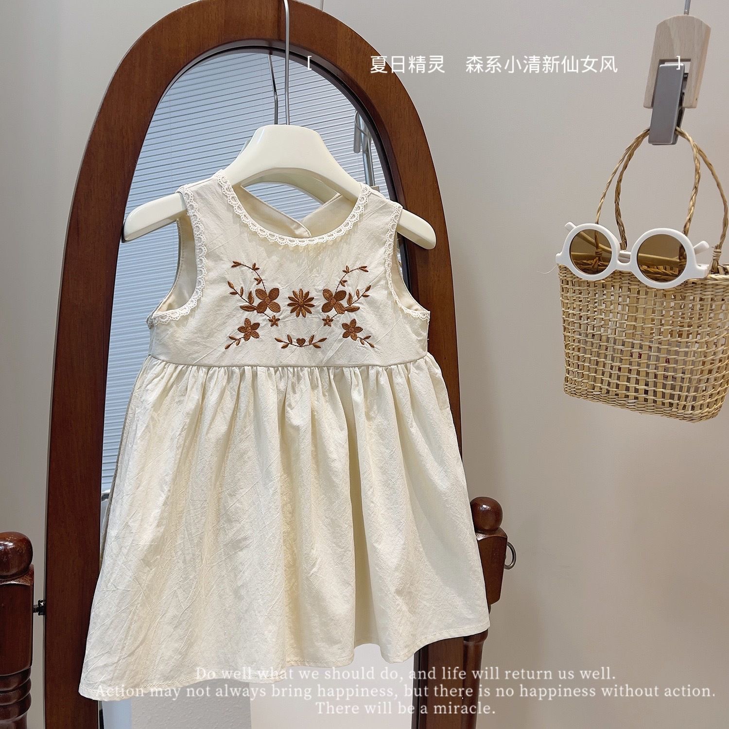 2023 소녀의 면 백 중공 스트랩 원피스 여름 새로운 대비 색상 자수 아기의 목가적 스타일 원피스 유행