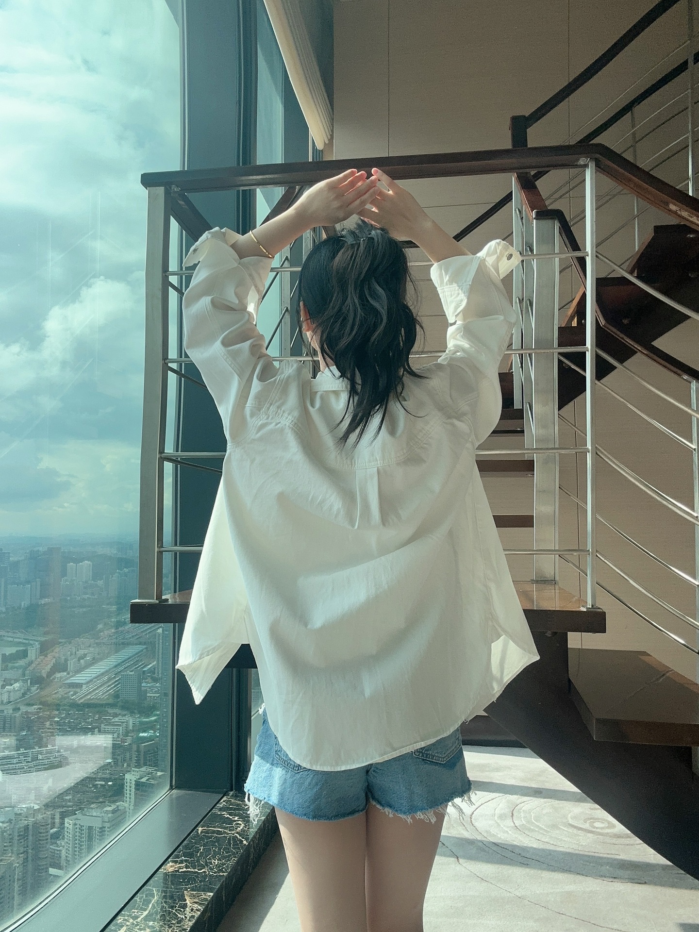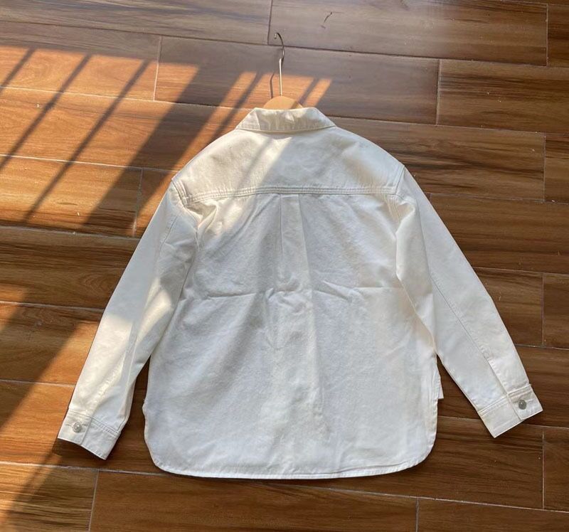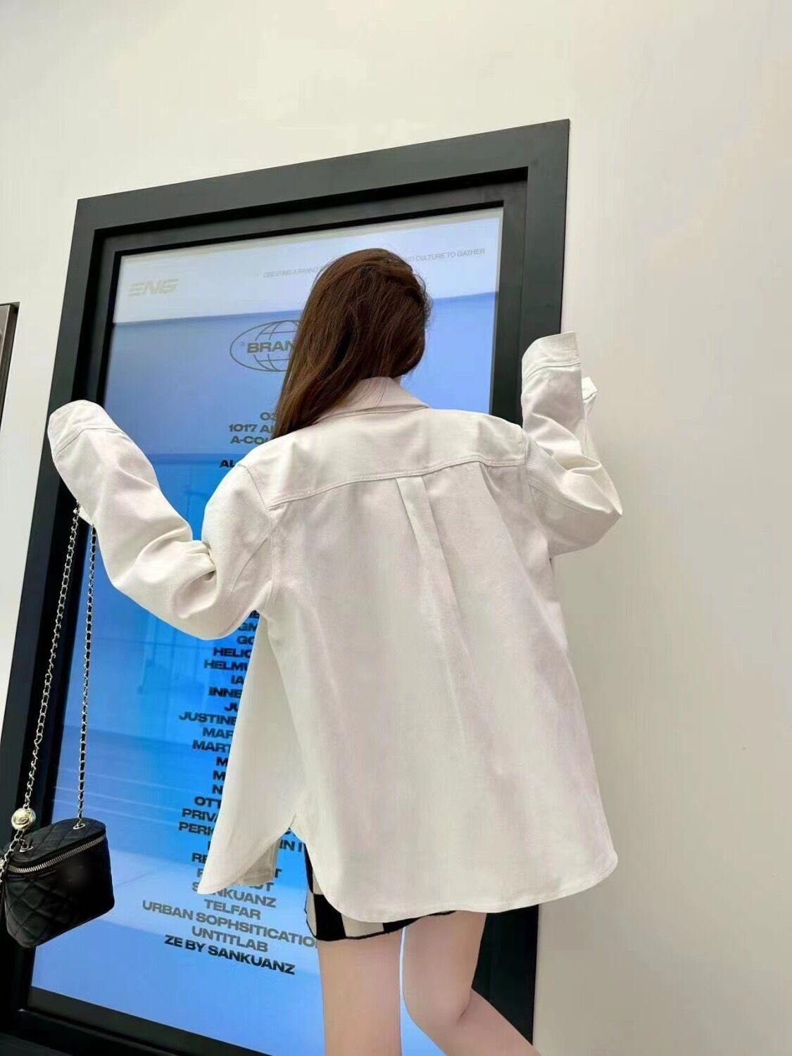 【클리어런스 특가】클래식 스타일의 가죽 배색 로고 디자인, 활용도 높은 화이트 데님 셔츠 여성용