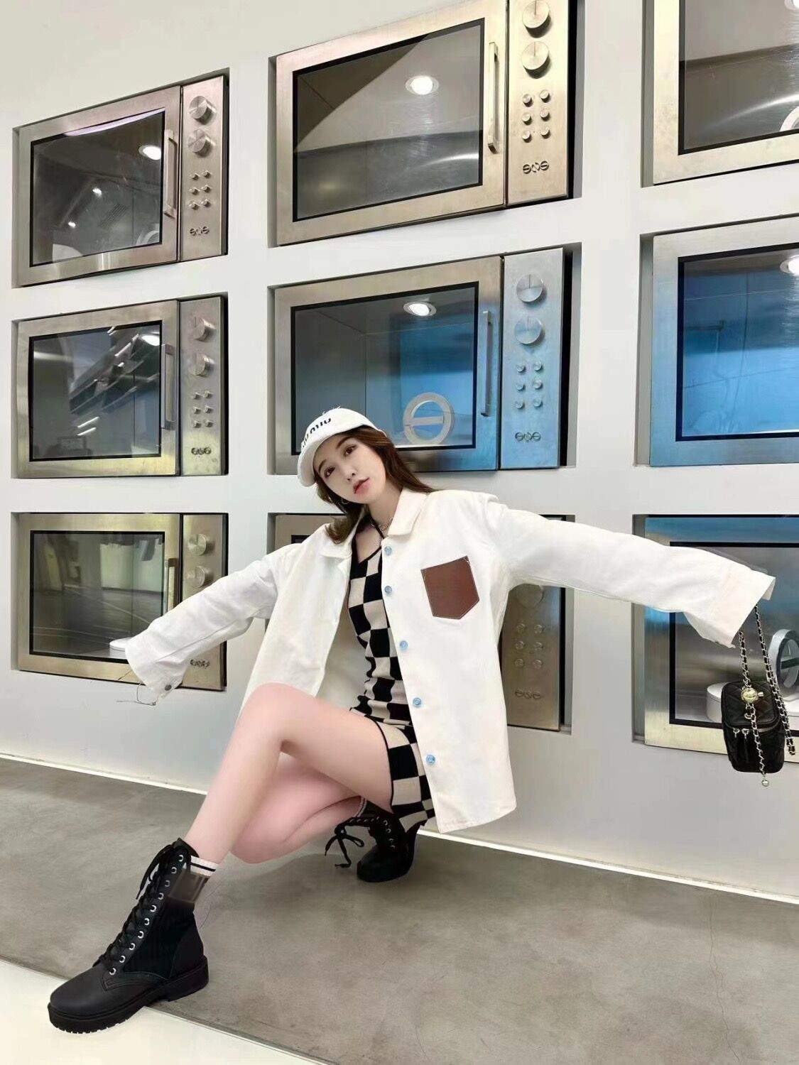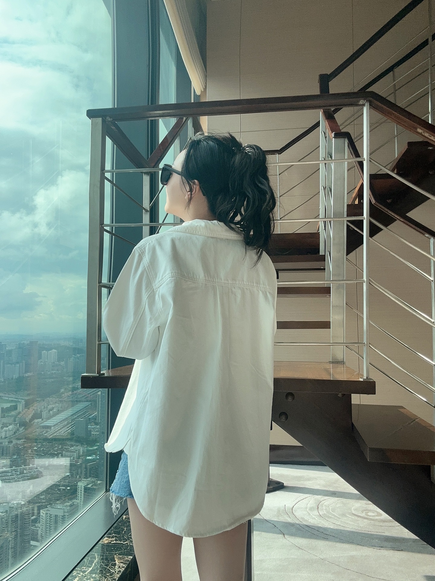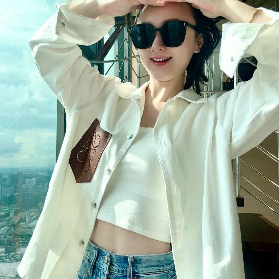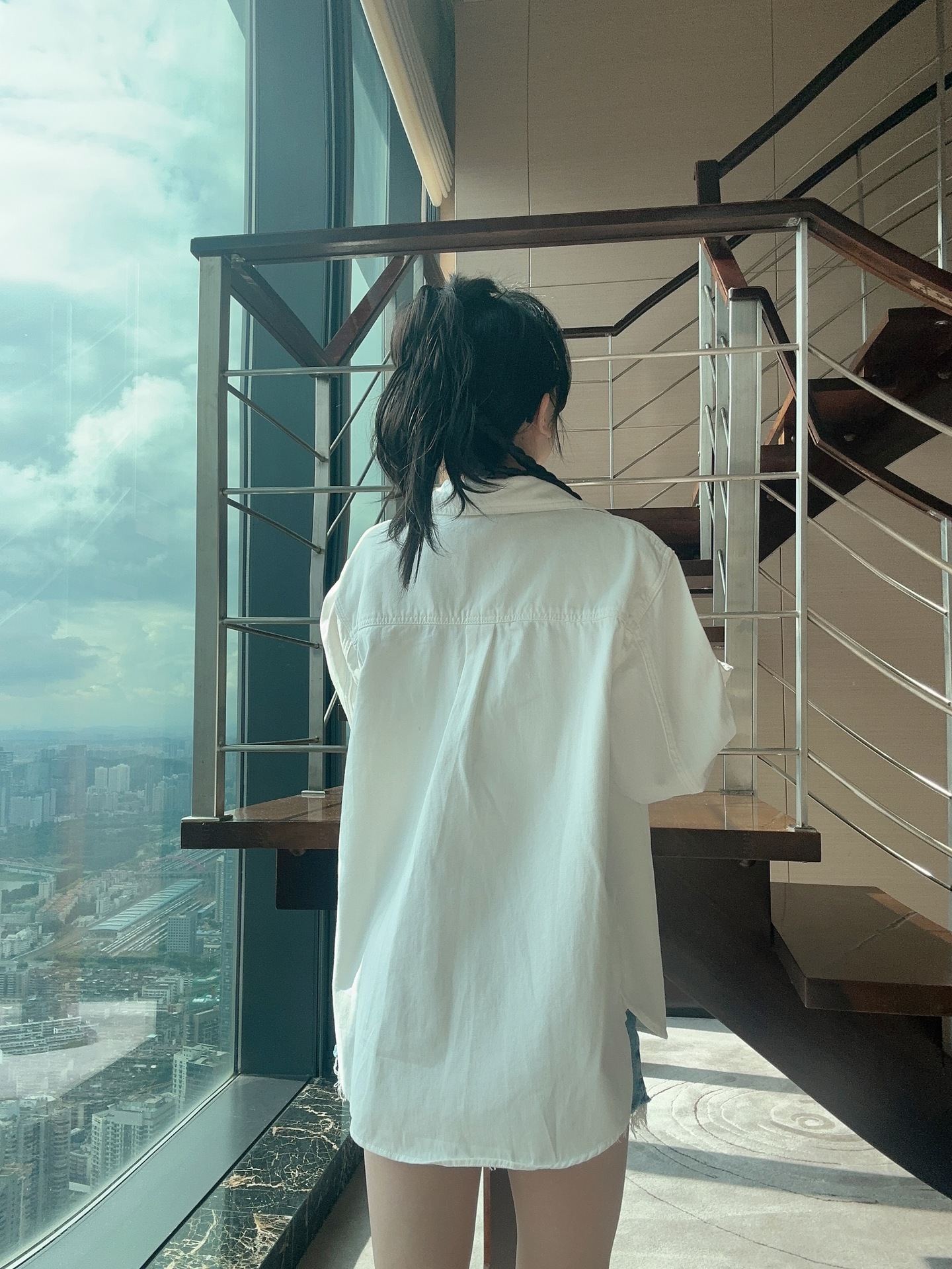 【클리어런스 특가】클래식 스타일의 가죽 배색 로고 디자인, 활용도 높은 화이트 데님 셔츠 여성용