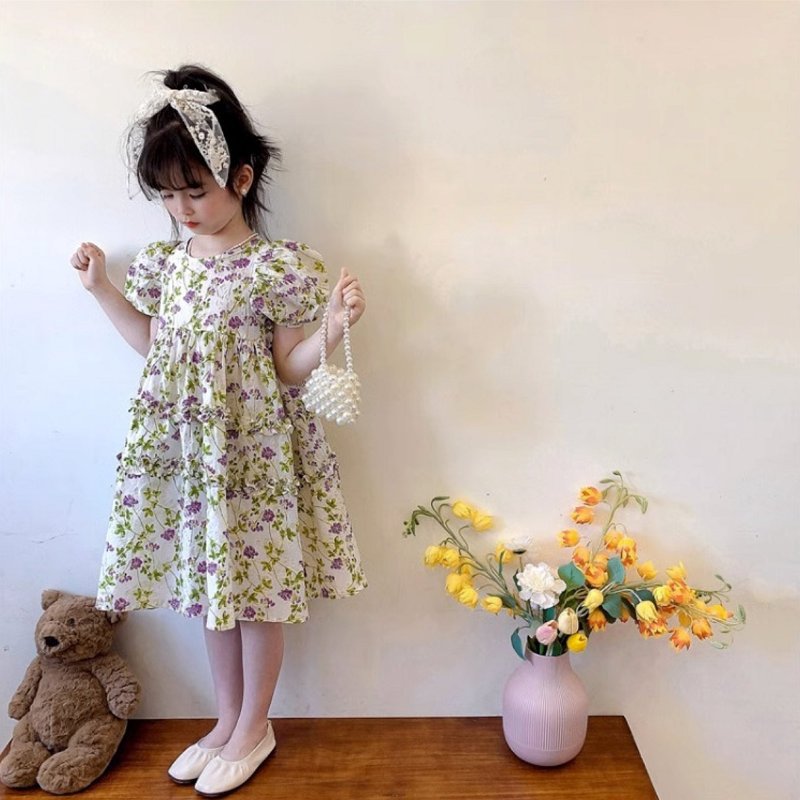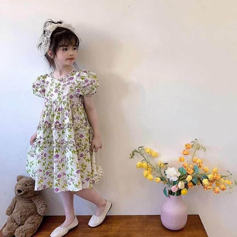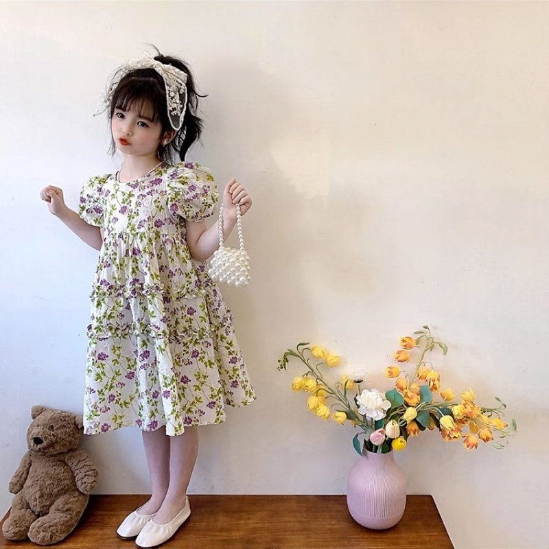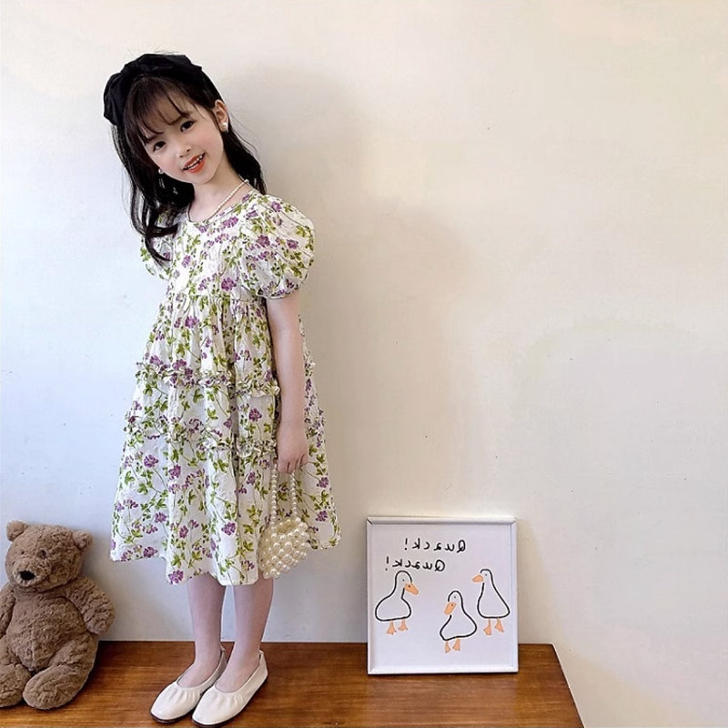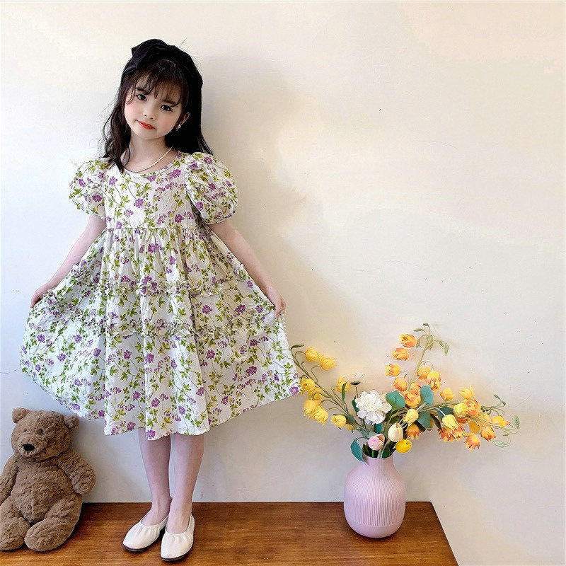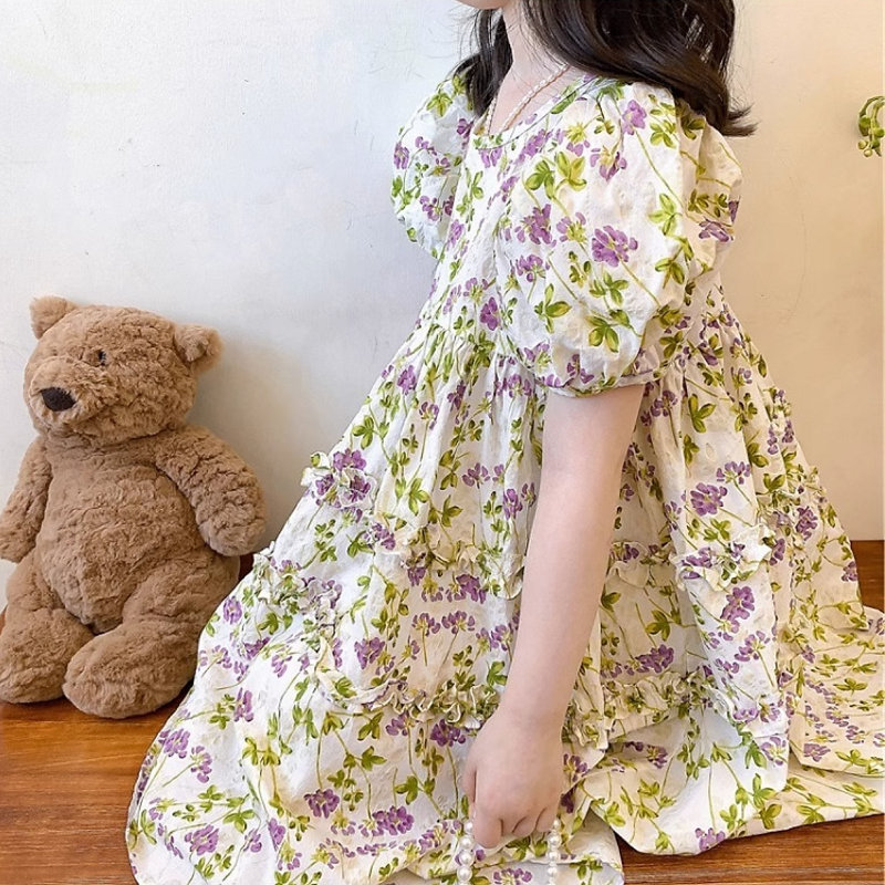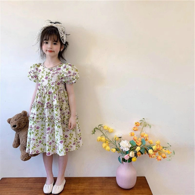 소녀의 원피스 꽃 크루넥 짧은 소매 원피스 공주 원피스 23 여름 새로운 대외 무역 3-8 세 아동복스토어 가기