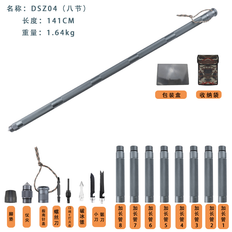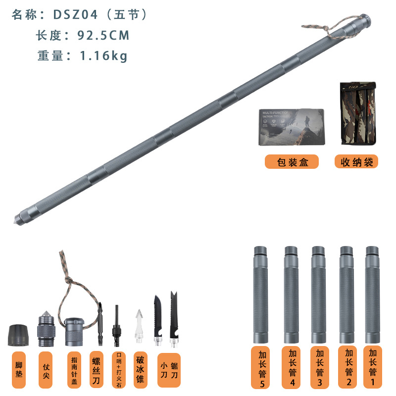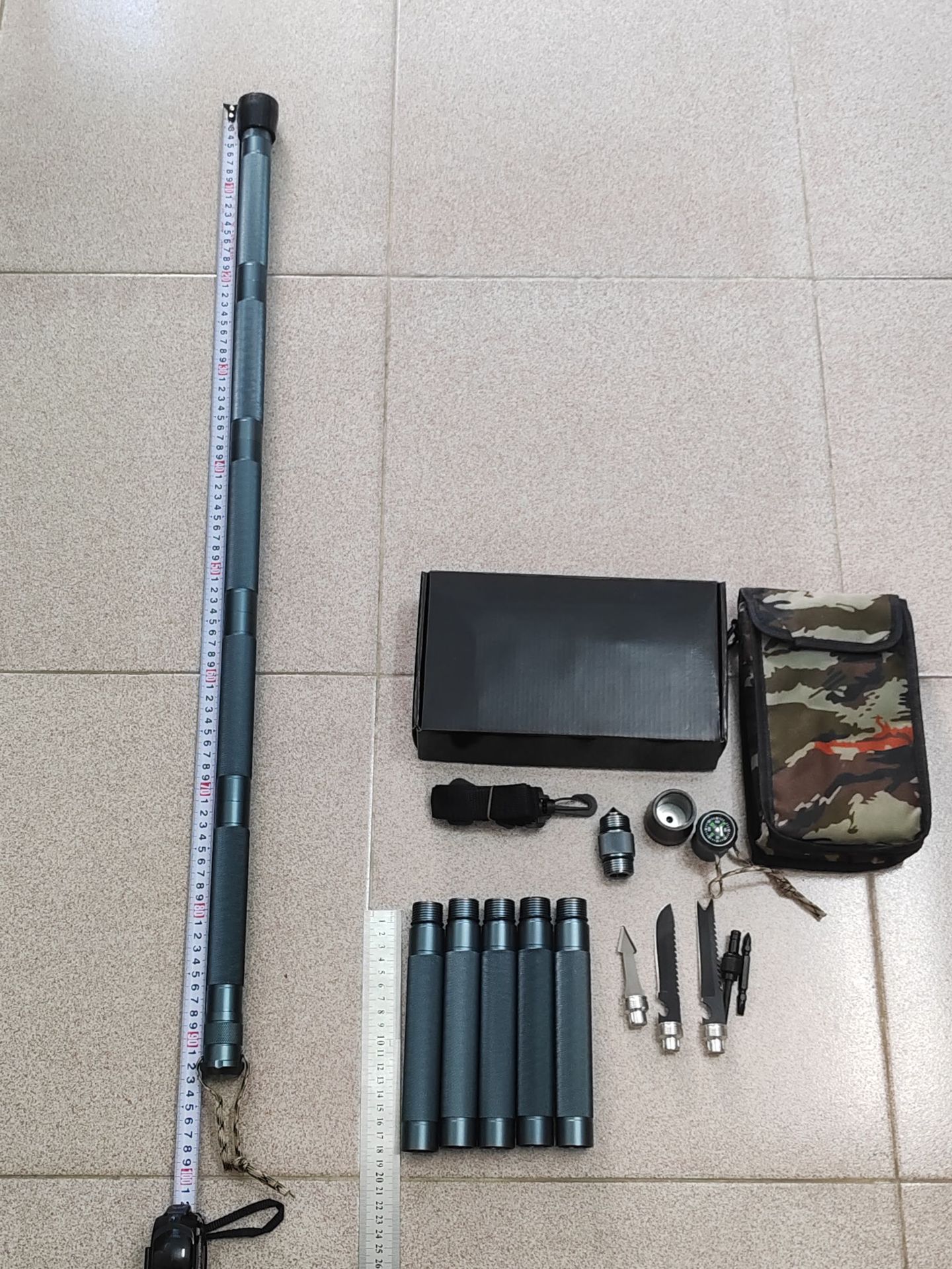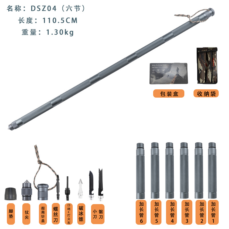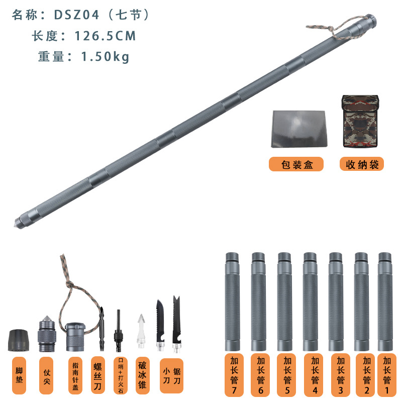 产品清单: 杆*5,仗尖*1,多功能小刀*1 鱼叉*1 ,铝合金口哨打火石*1,破冰锤*1, 指南针尾部*1 军绿色尾绳*1 中性彩盒*1