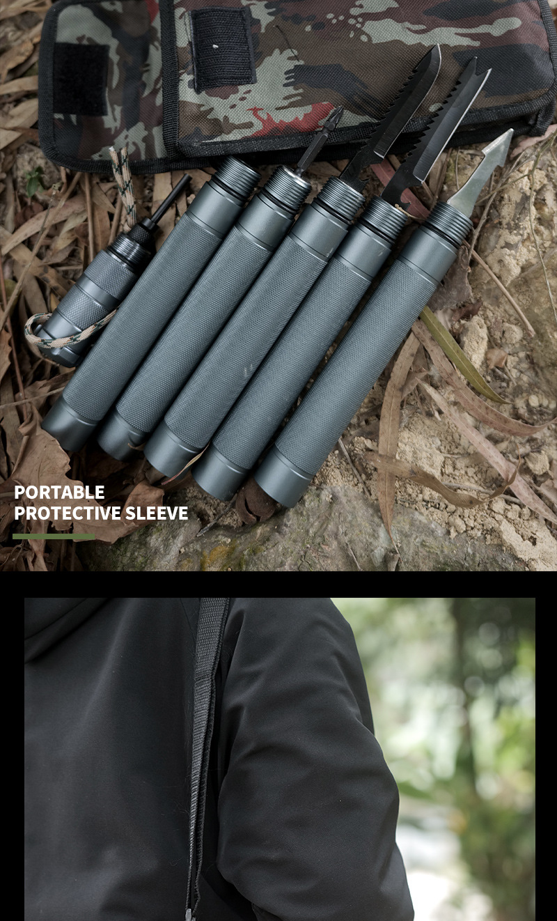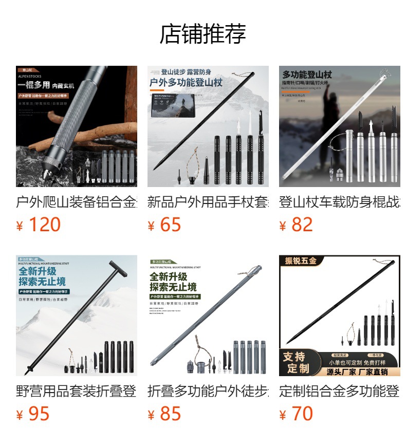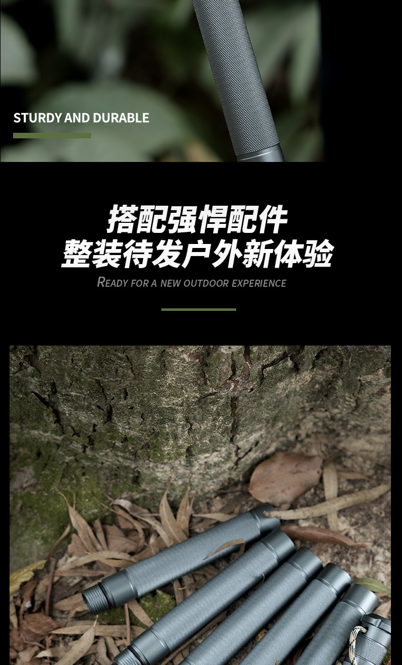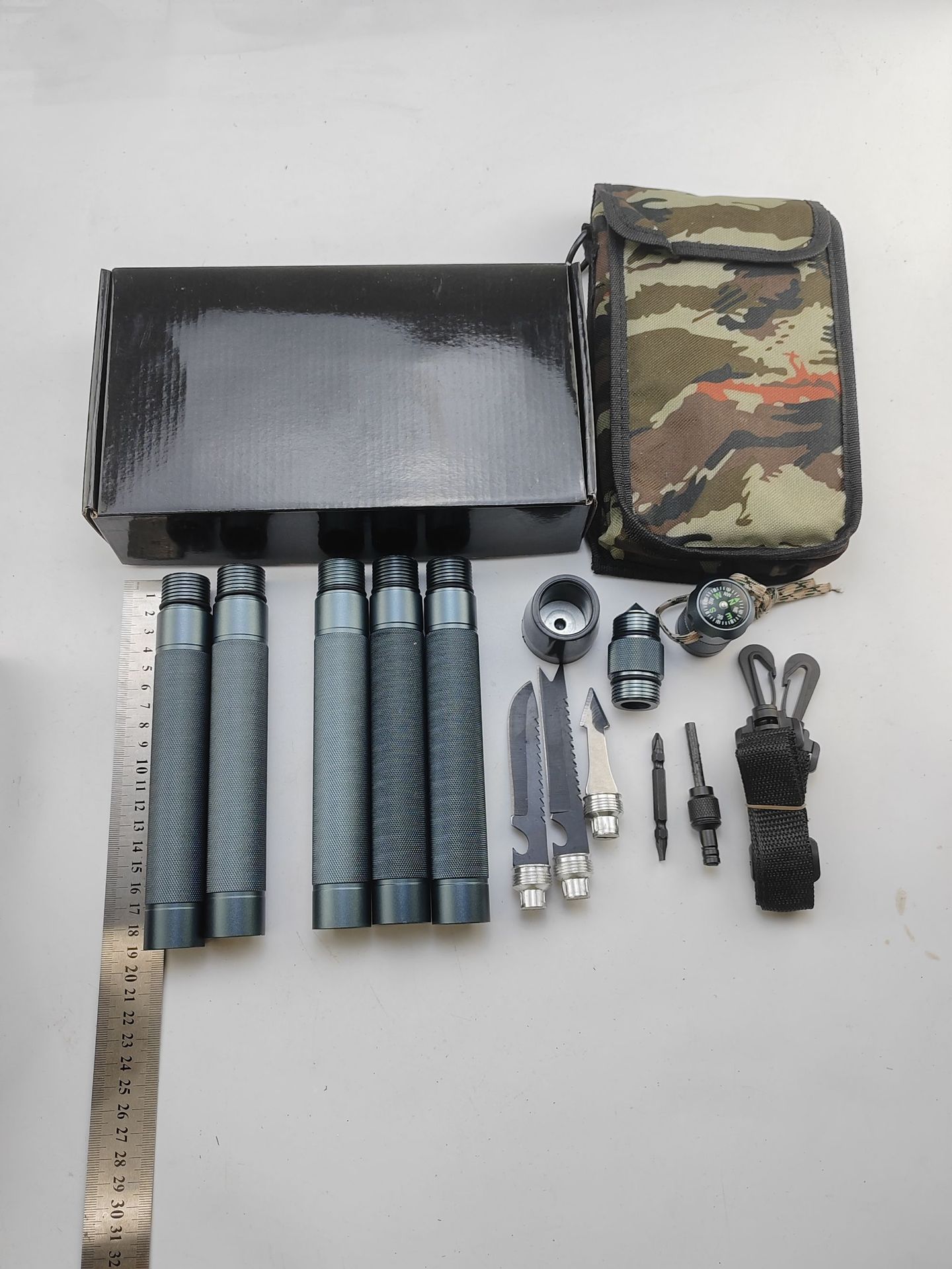 产品清单: 杆*5,仗尖*1,多功能小刀*1 鱼叉*1 ,铝合金口哨打火石*1,破冰锤*1, 指南针尾部*1 军绿色尾绳*1 中性彩盒*1