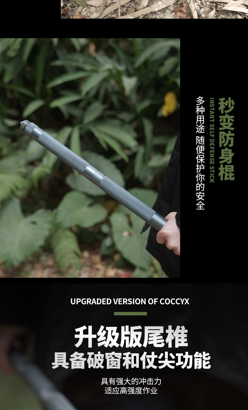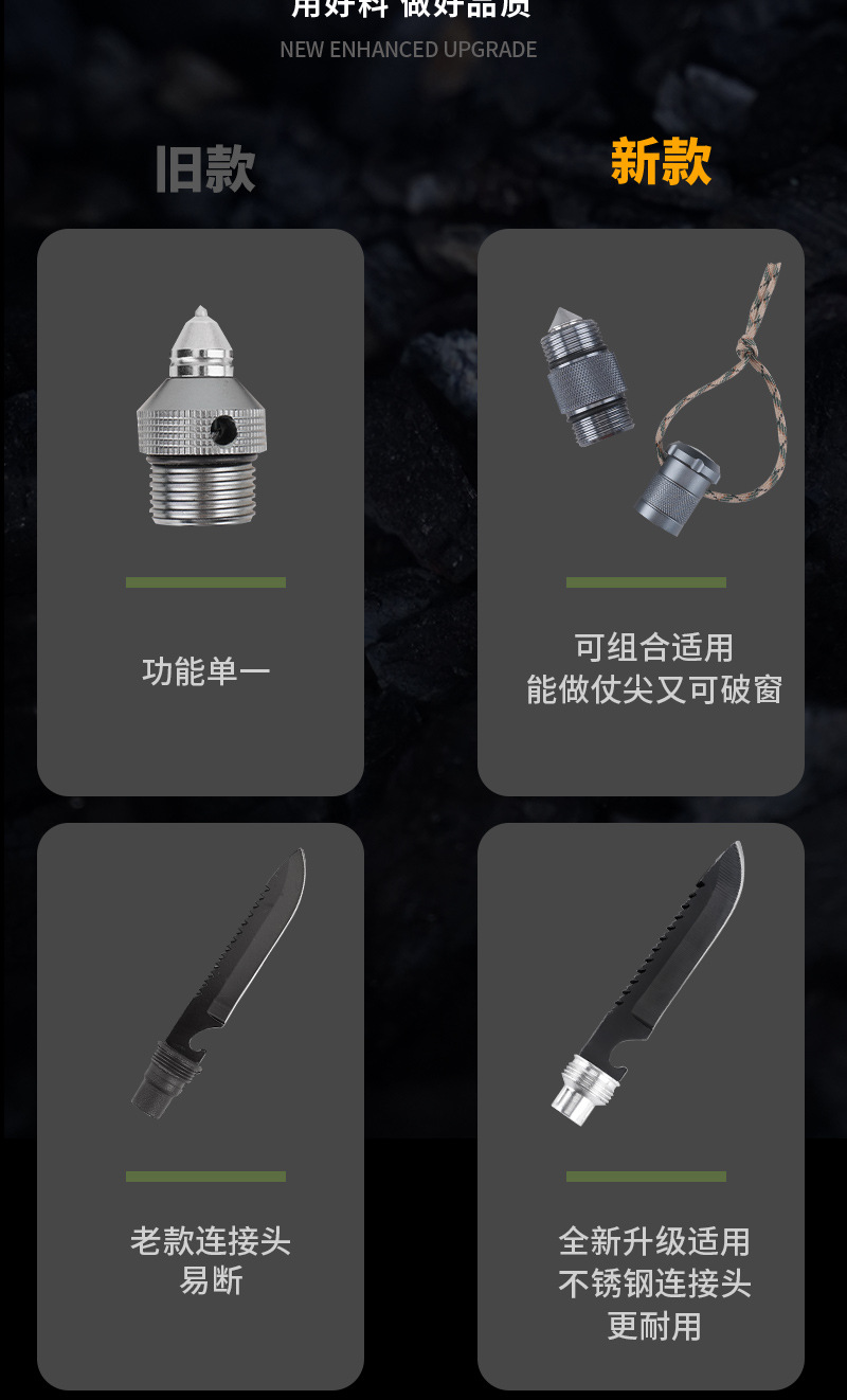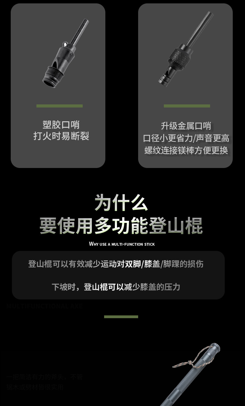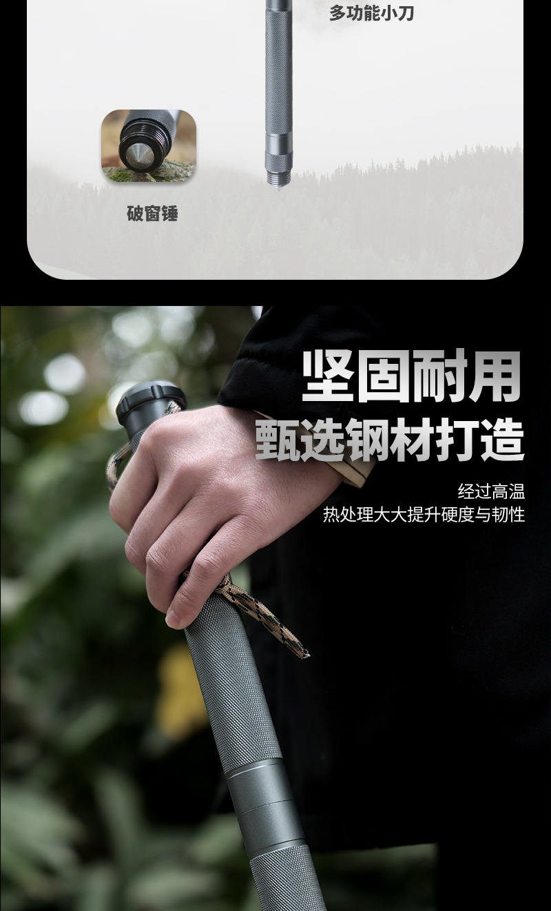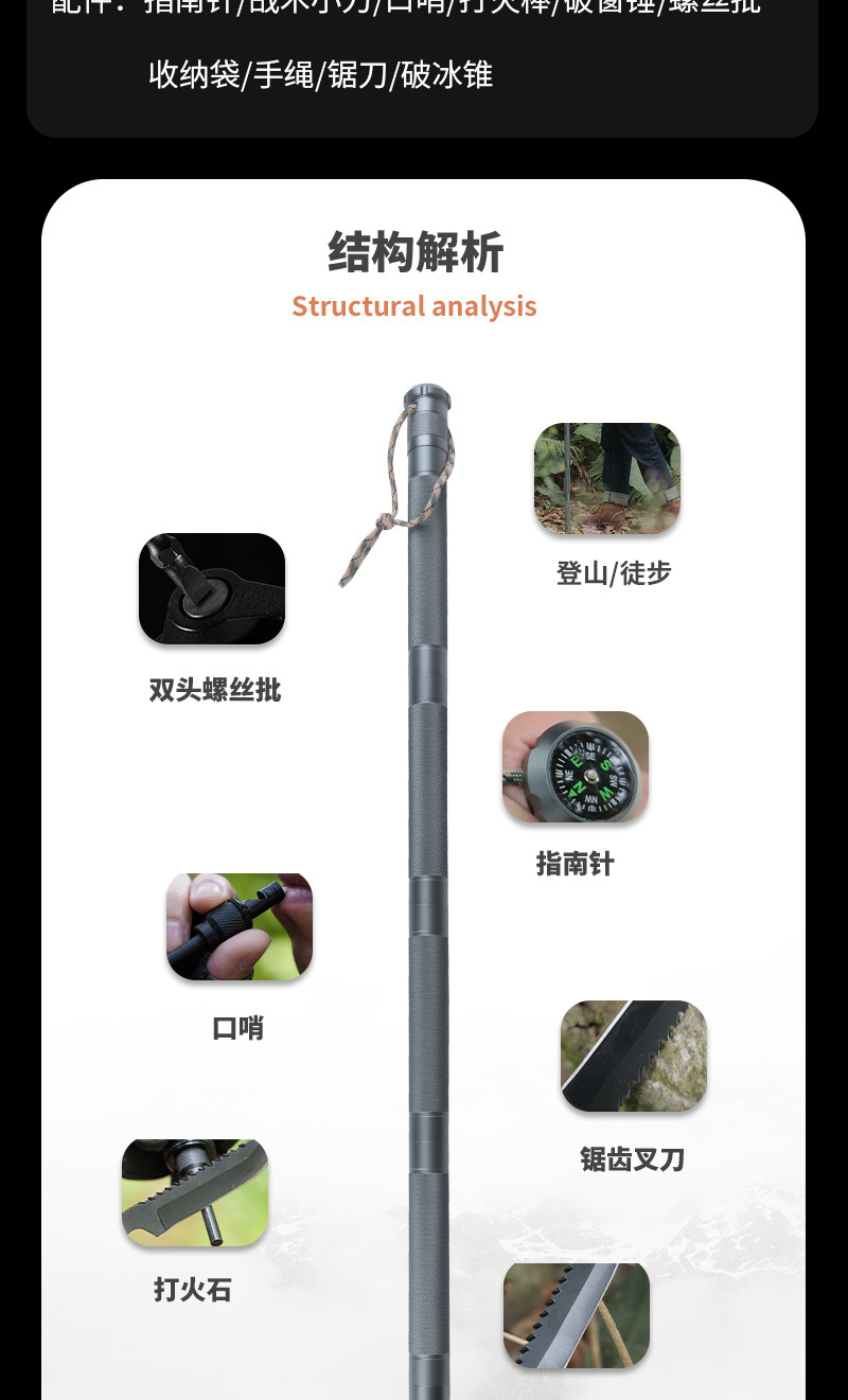 功能介绍: 叉鱼 割 刺 锯 破 撬 切 打火 口哨 防身棍 开瓶器 割绳 防身 求救口哨 指南针