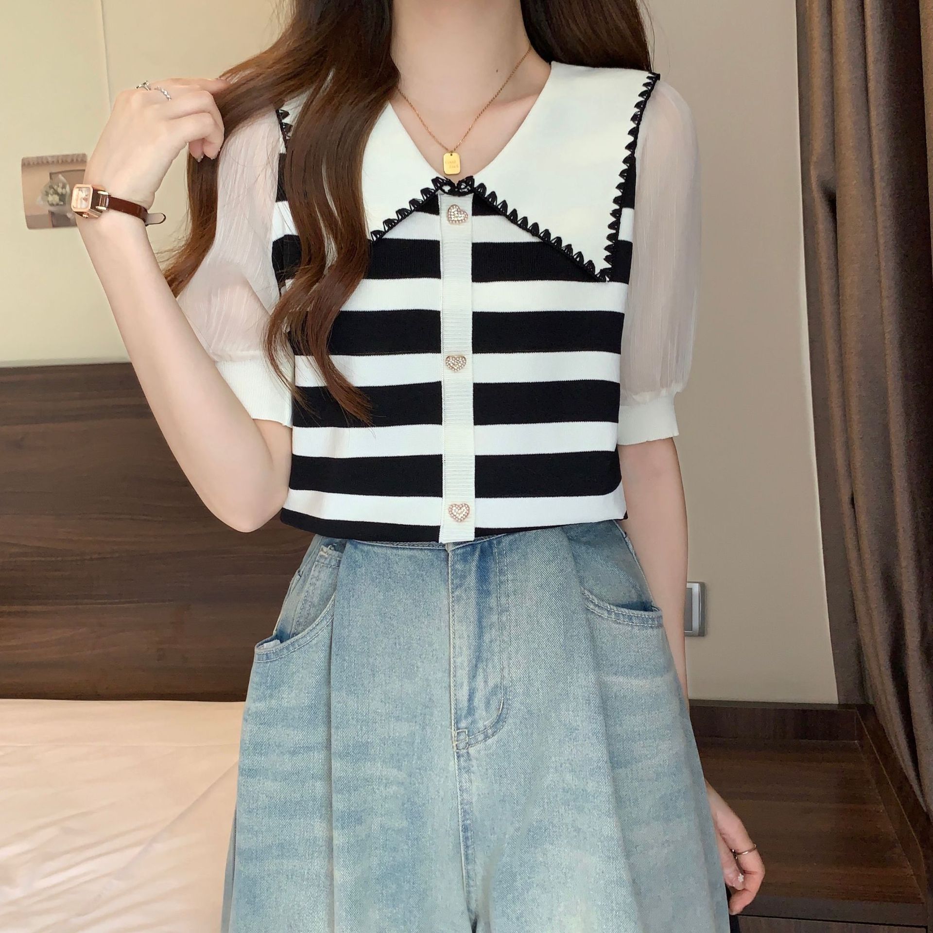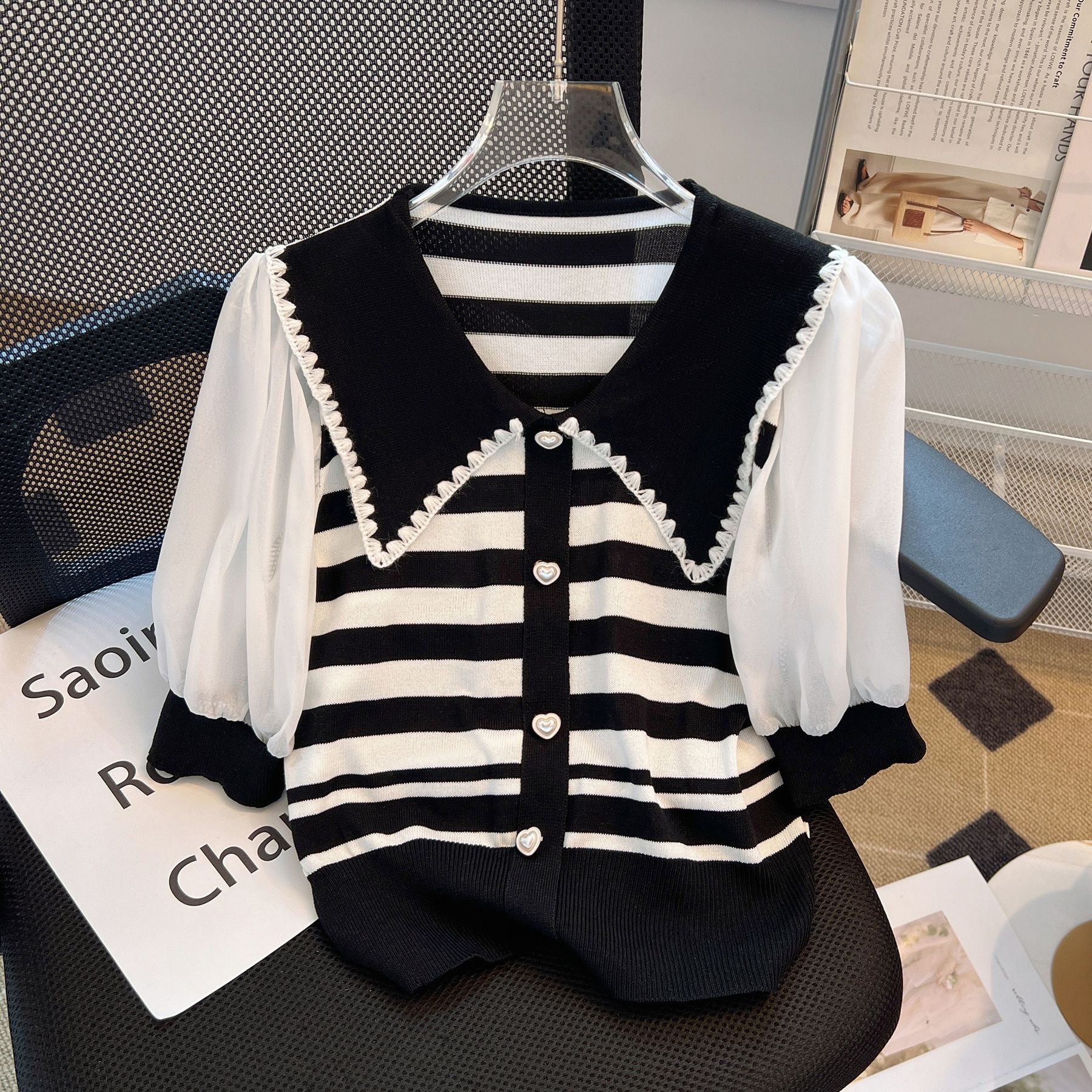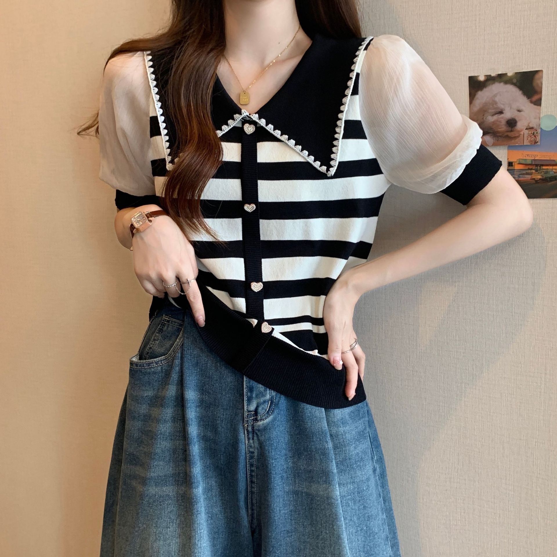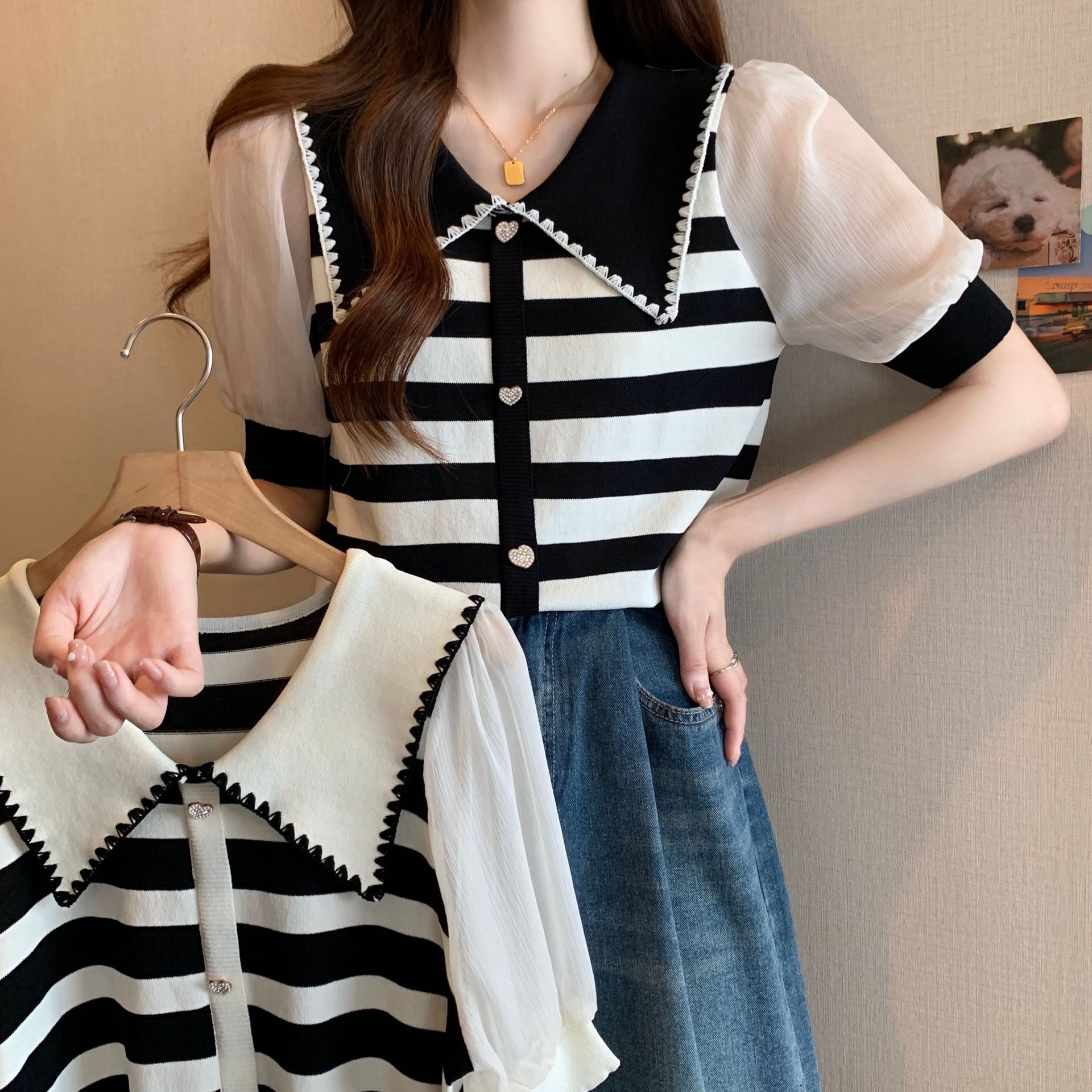 프렌치 컬러 대비 스트라이프 쉬폰 스티칭 퍼프 슬리브 바늘 여성용 여름 패션 달콤한 나이 감소 인형 칼라 반소매 탑