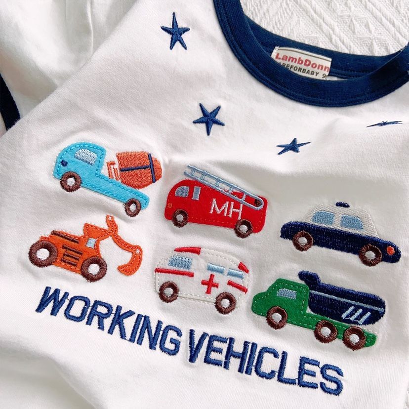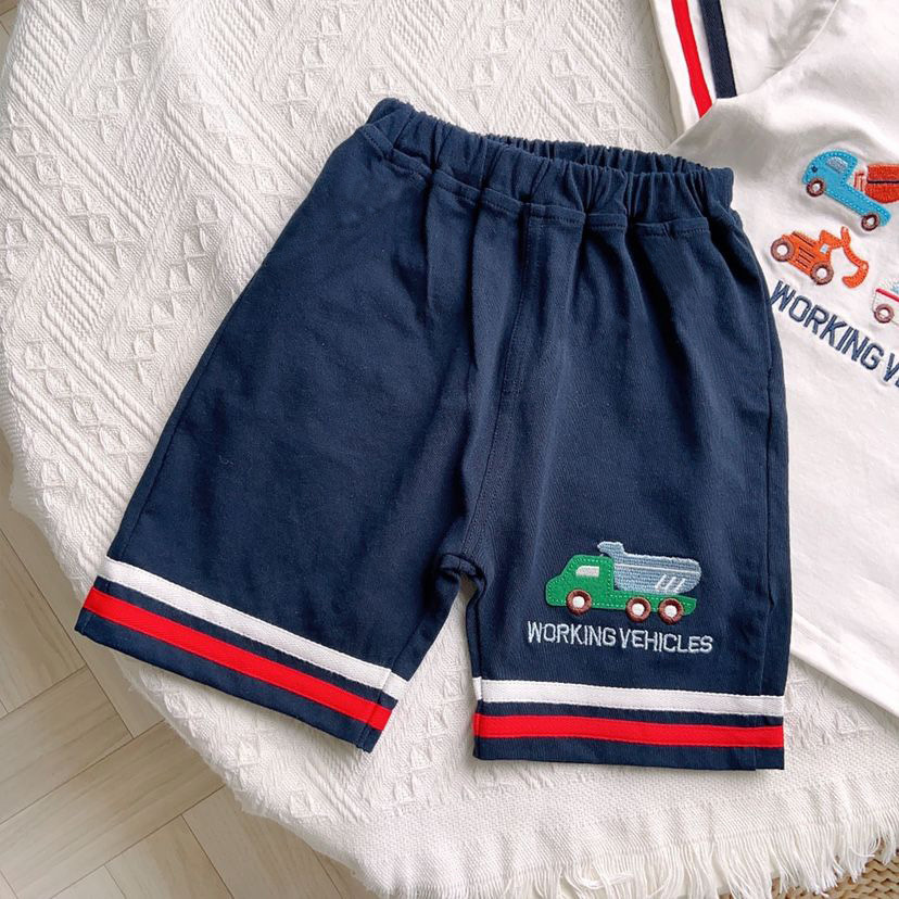 아동복 2023 새로운 어린이 일본 자수 공학 차량 패턴 반팔 반바지 세련된 스포츠 투피스 트렌디스토어 가기