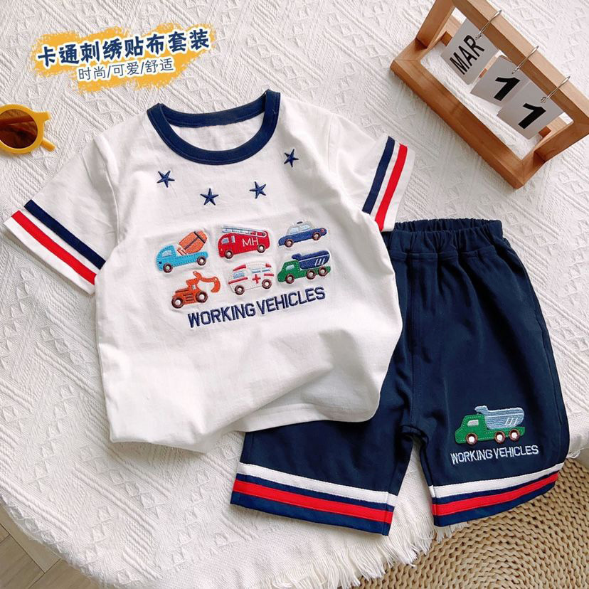 아동복 2023 새로운 어린이 일본 자수 공학 차량 패턴 반팔 반바지 세련된 스포츠 투피스 트렌디