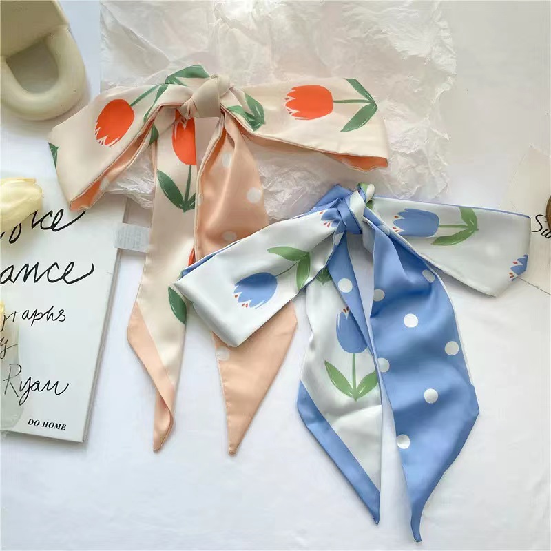 블루 튤립 좁은 긴 실크 스카프 여성용 헤어 밴드 꼰 헤어 리본 타이 포장 헤어 리본 스카프 여성