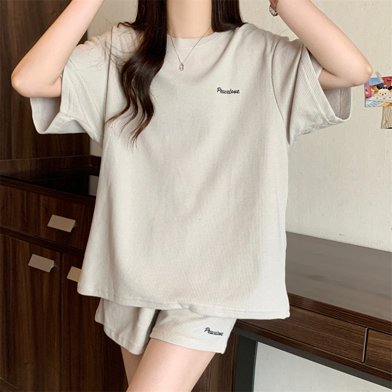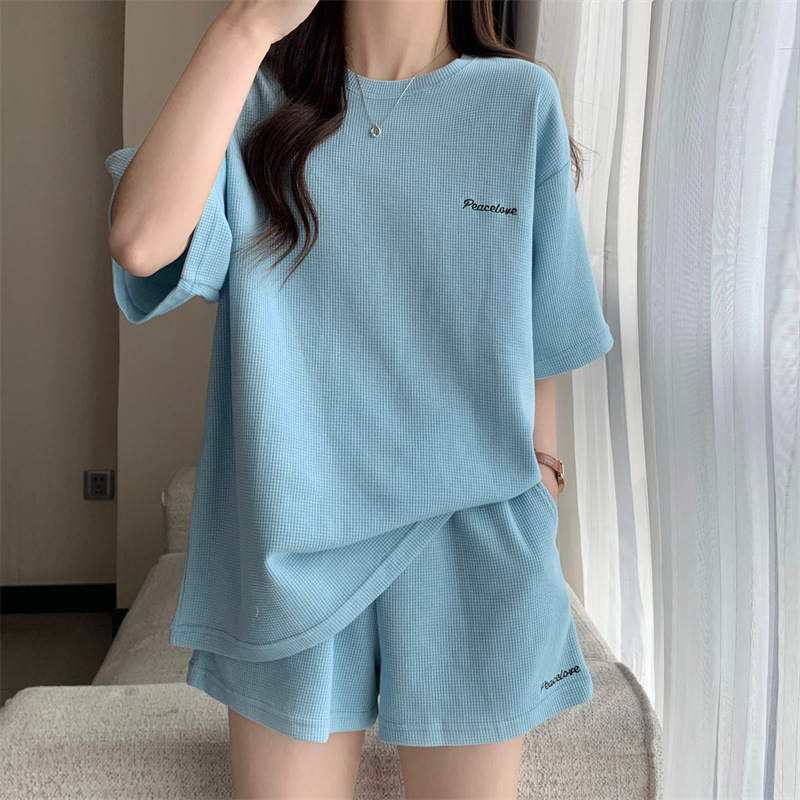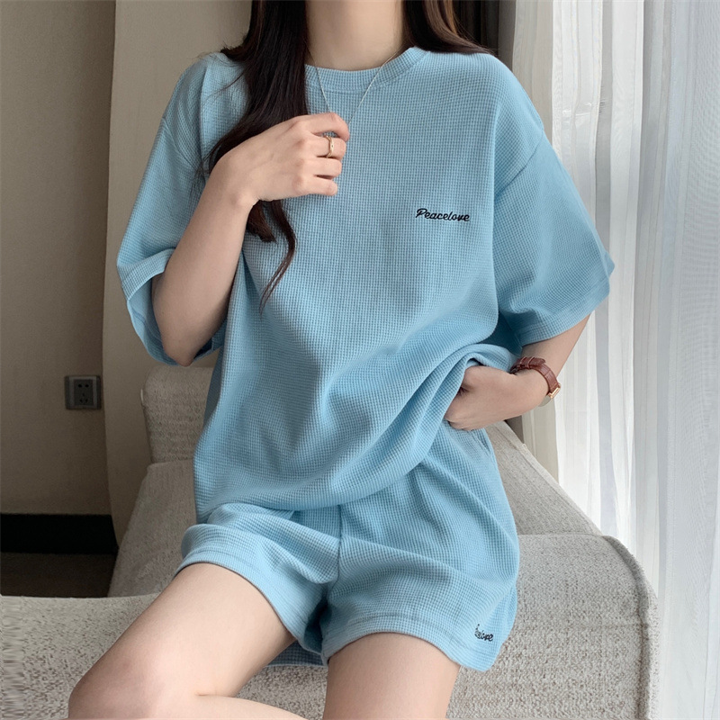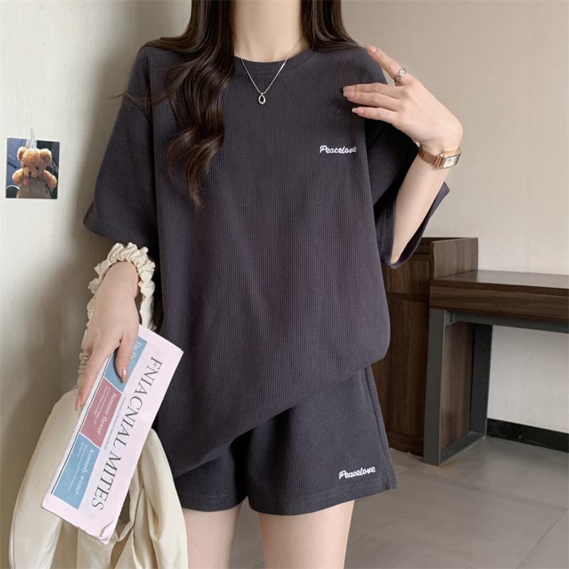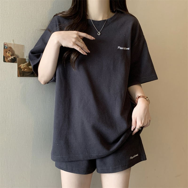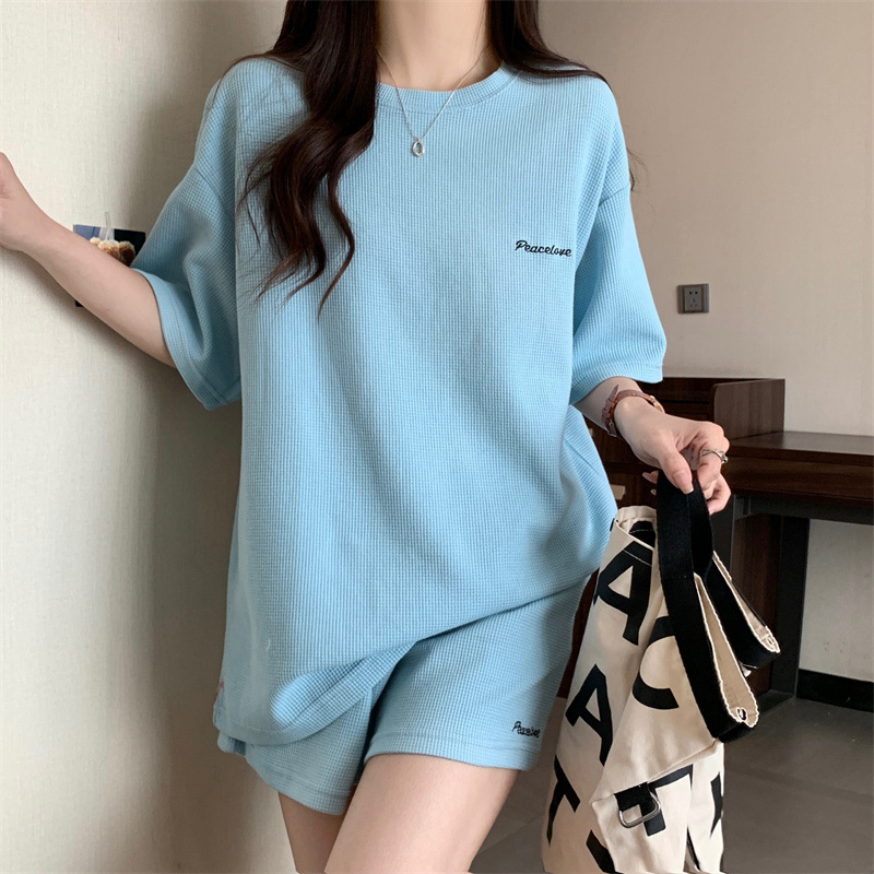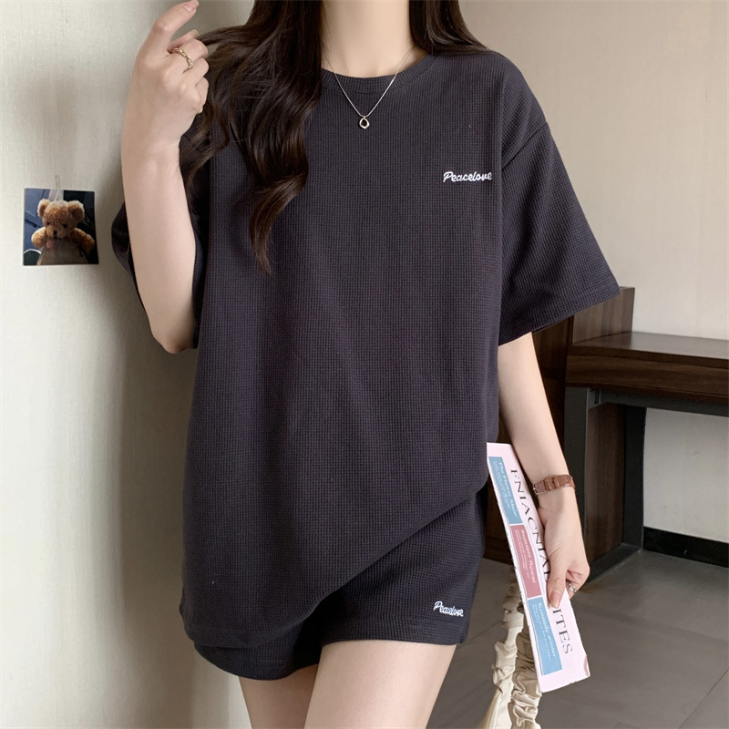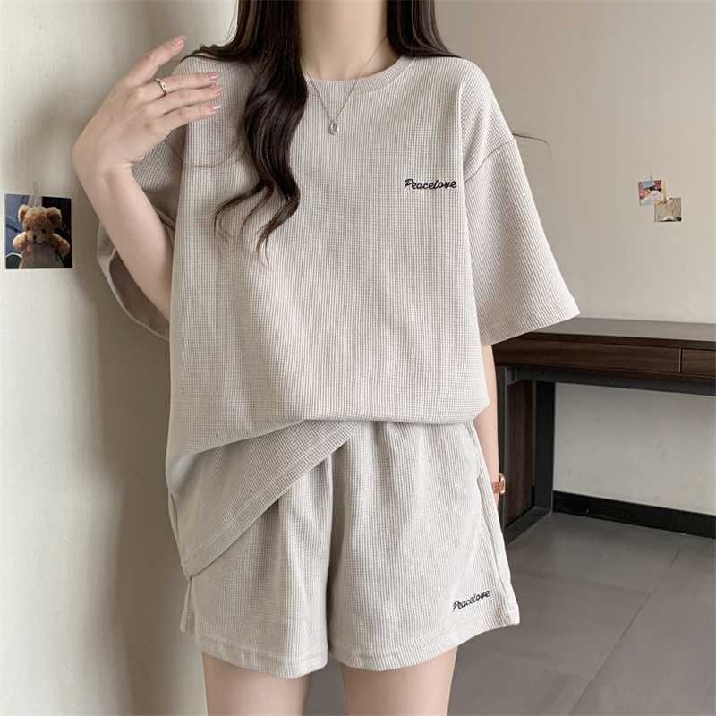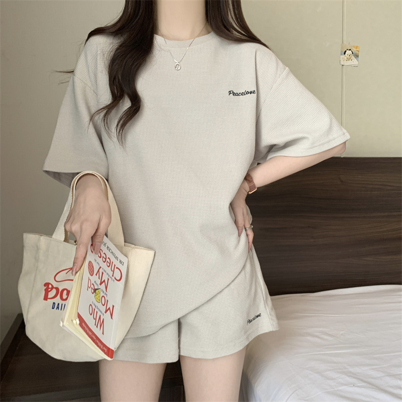 리얼 샷 와플 세트 여자의 여름 느슨한 반팔 반바지 소금 달콤한 캐주얼 스포츠 자수 2 피스 세트