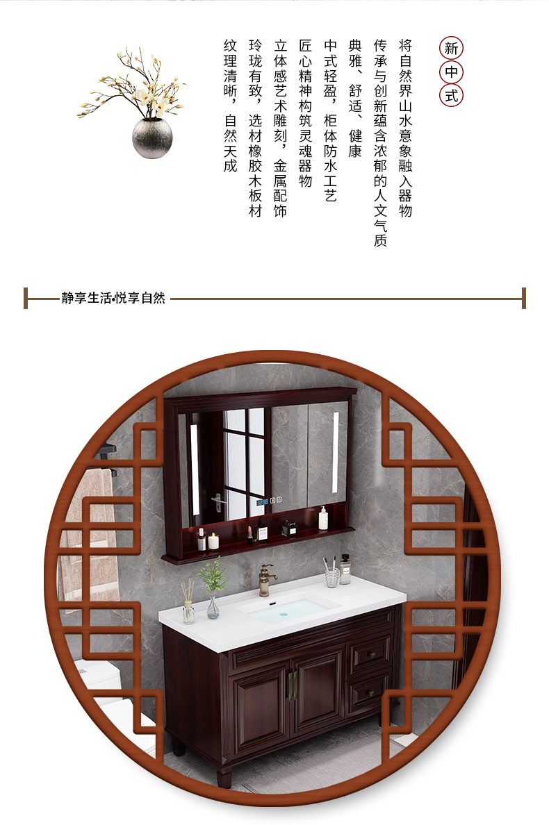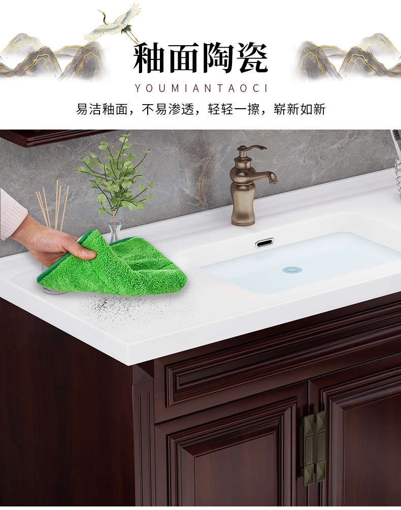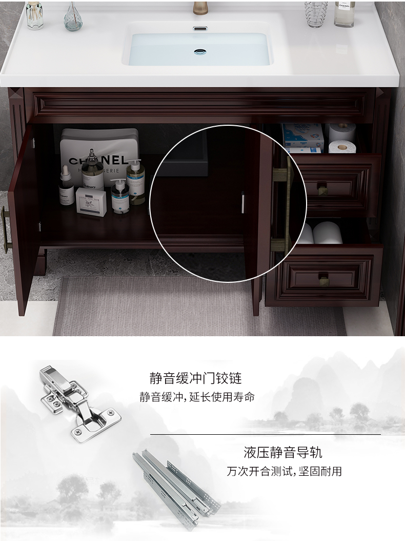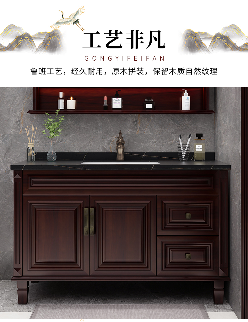 현대 새로운 중국 스타일 락 보드 욕실 캐비닛 오크 통합 세라믹 분지 욕실 단단한 나무 바닥 세척 및 세면 테이블 분지스토어 가기