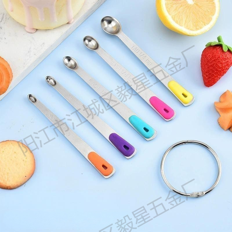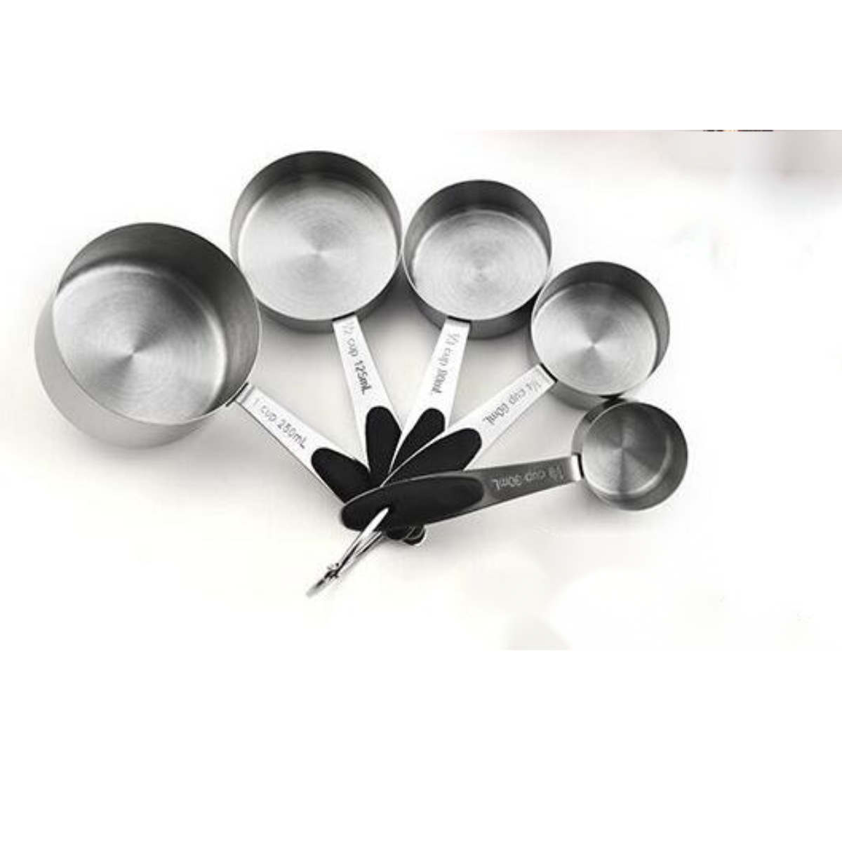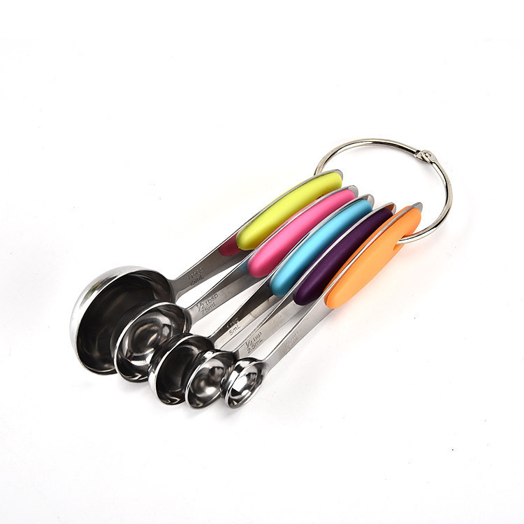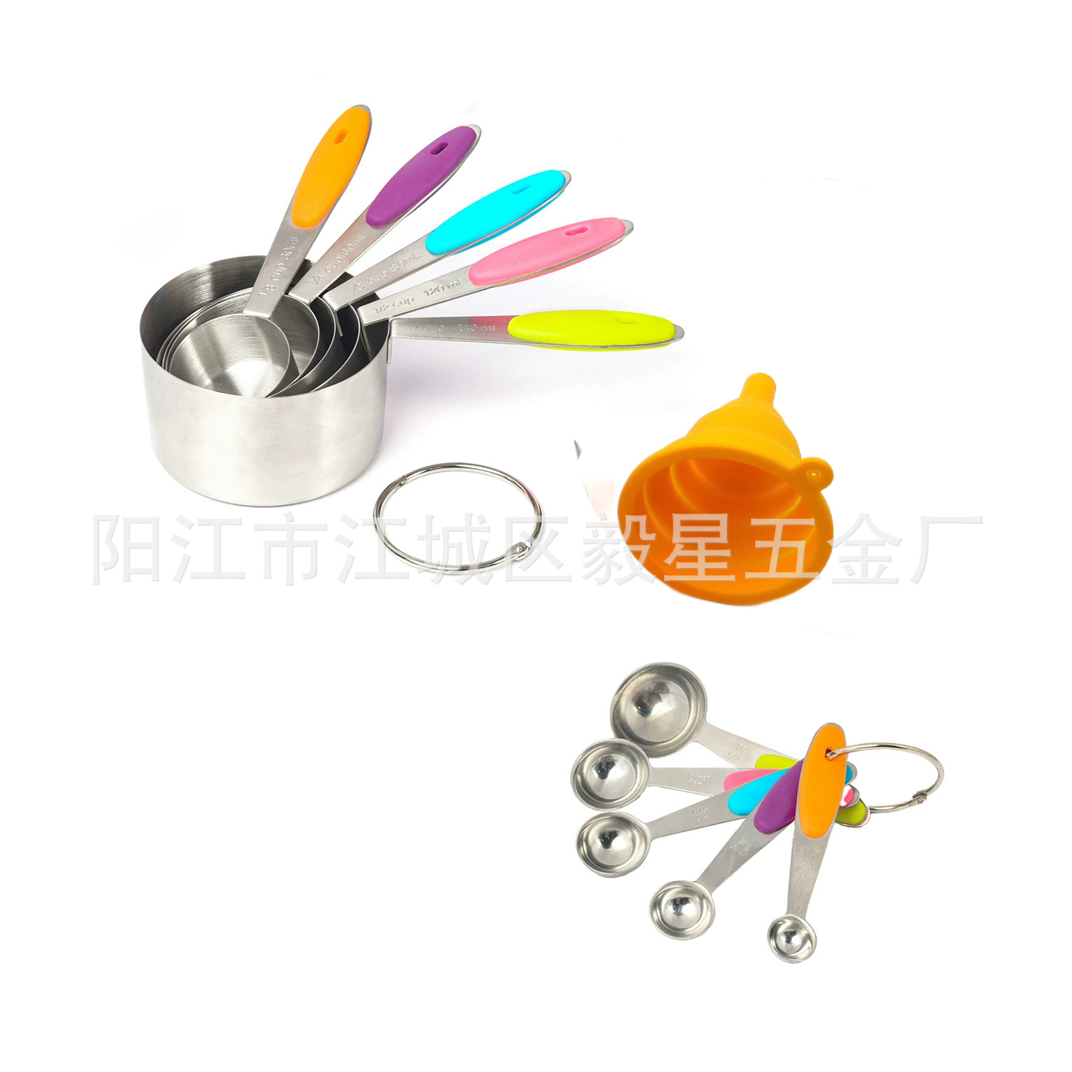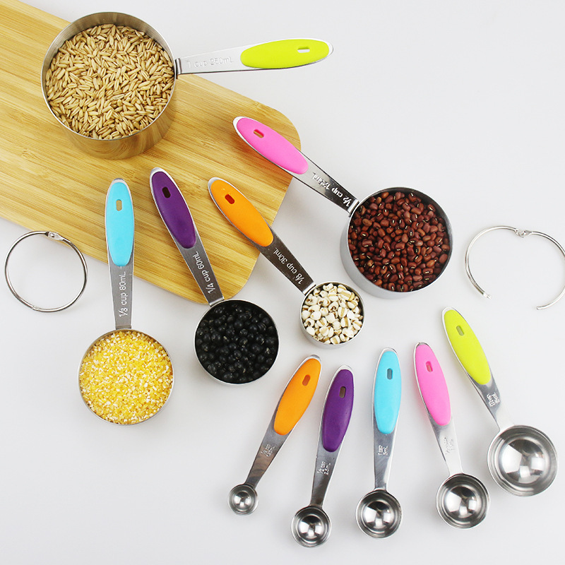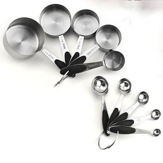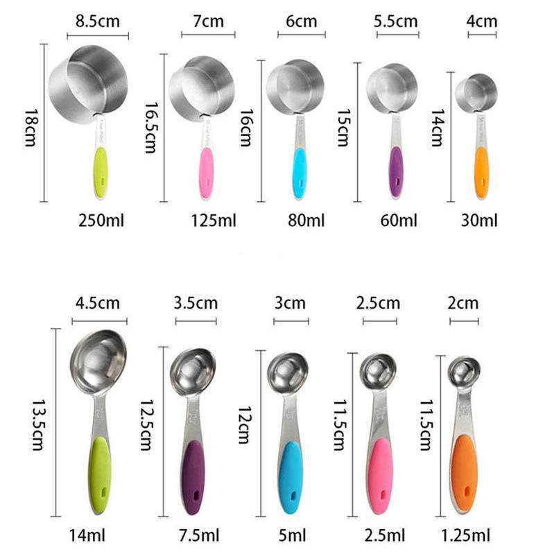부드러운 실리콘 손잡이가 있는 가정용 주방 용품용 스테인레스 스틸 계량 컵과 스푼 10종 네스팅 메탈 세트