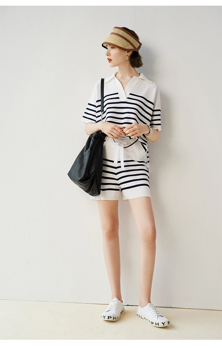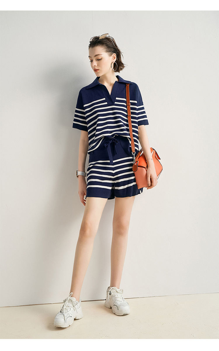 스트라이프 니트 셔츠 아이스 실크 세트 2021 새로운 여성 디자인 센스 여름 캐주얼 패션 와이드 레그 반바지 투피스 세트스토어 가기