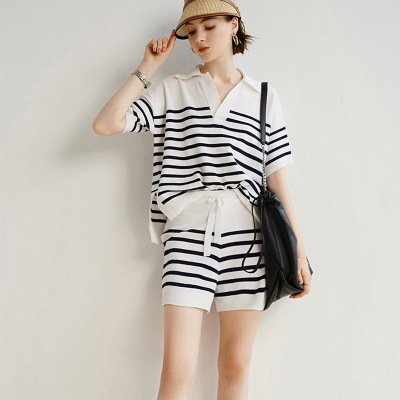 스트라이프 니트 셔츠 아이스 실크 세트 2021 새로운 여성 디자인 센스 여름 캐주얼 패션 와이드 레그 반바지 투피스 세트