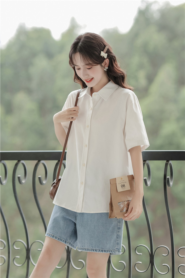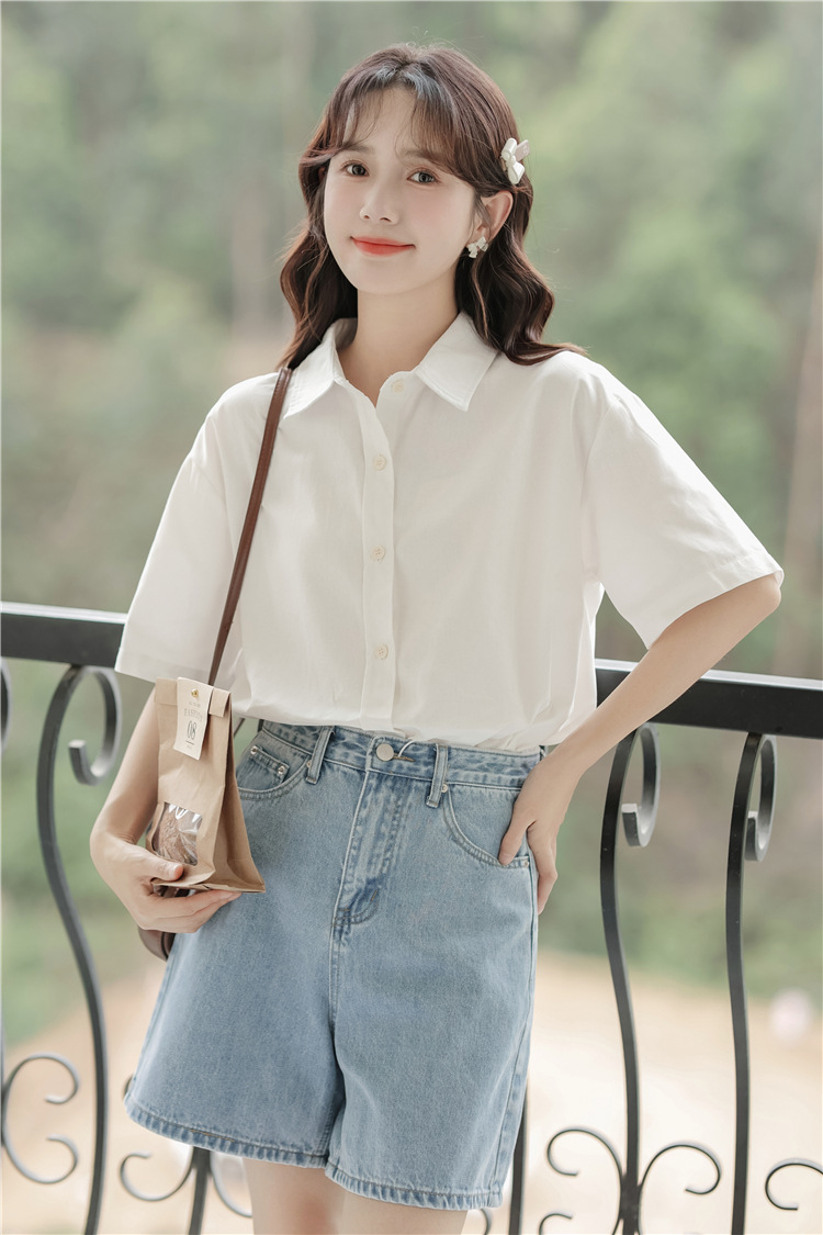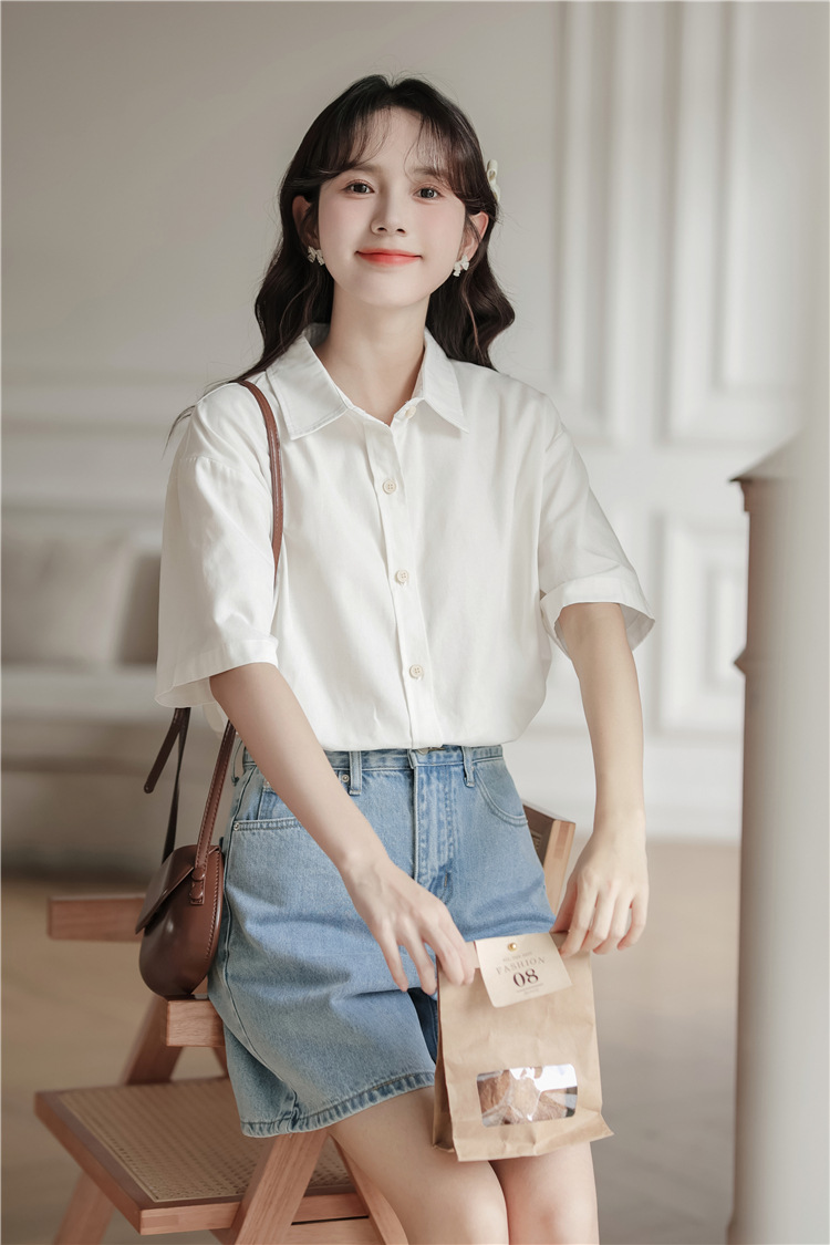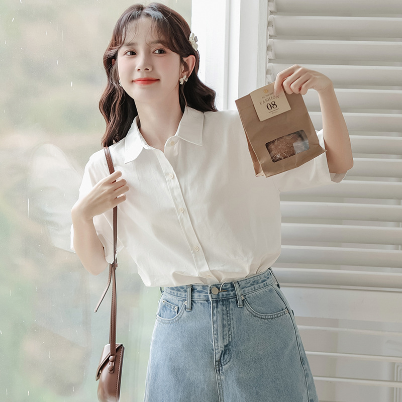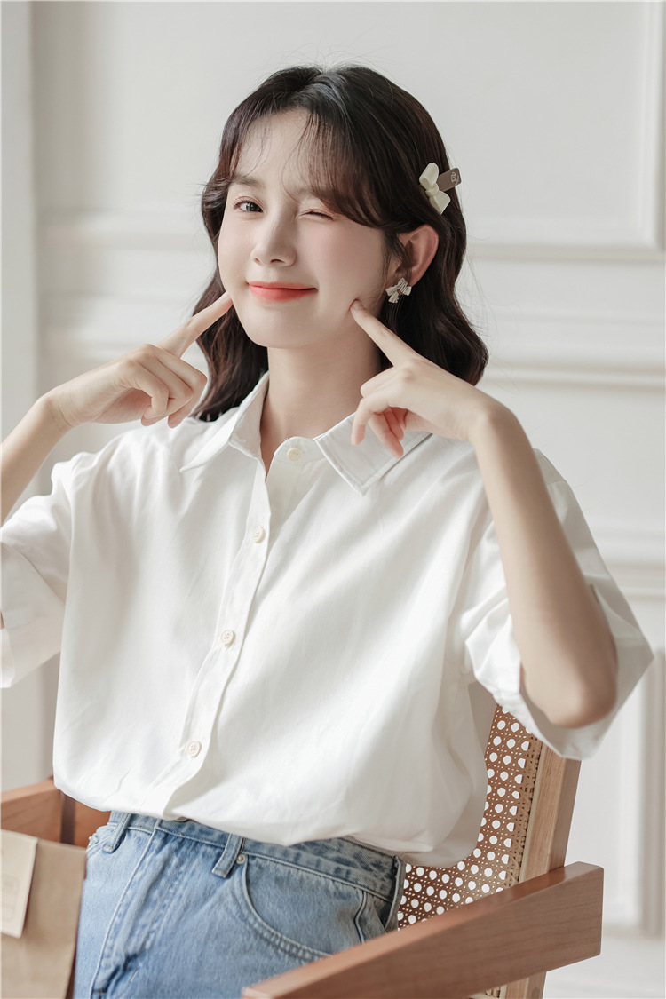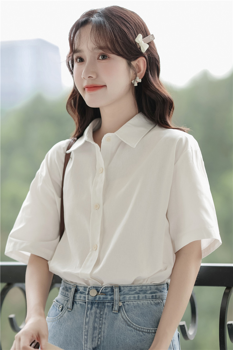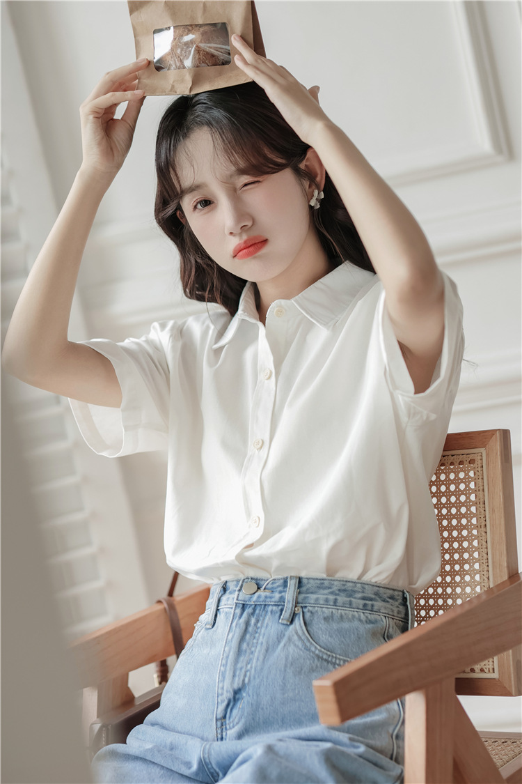 반팔 화이트 셔츠 여성용 2023 여름 새로운 한국 스타일 심플 라펠 루즈한 슬리밍 만능 학생 셔츠스토어 가기