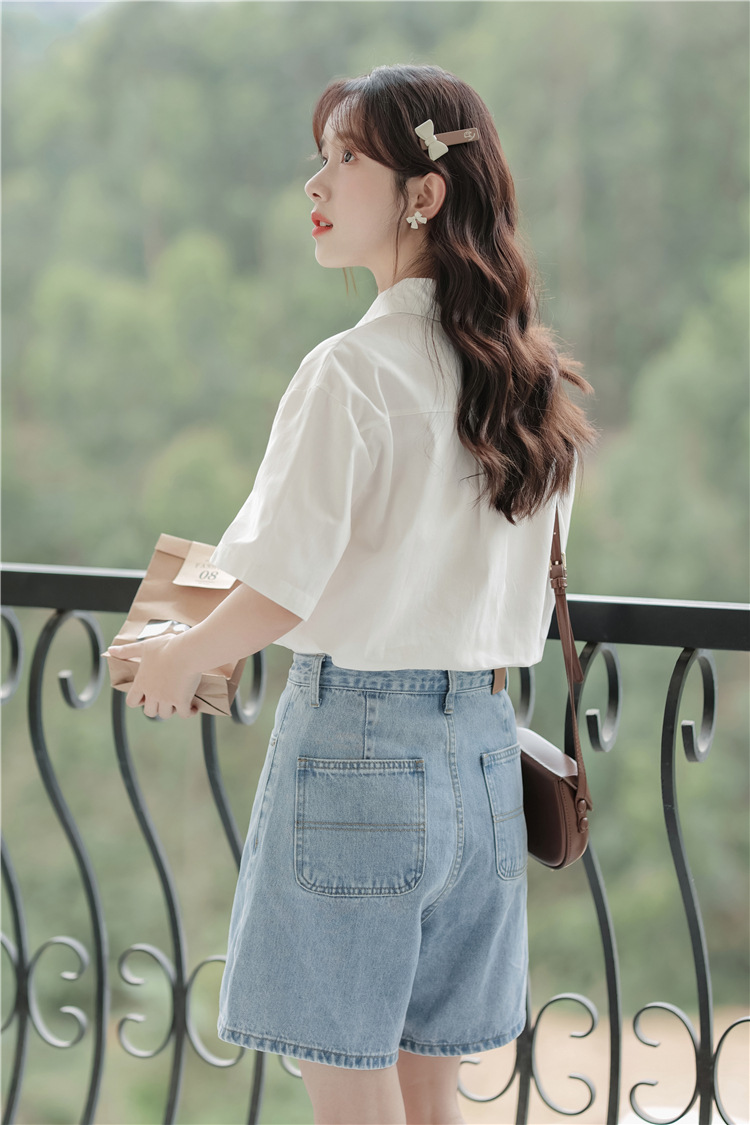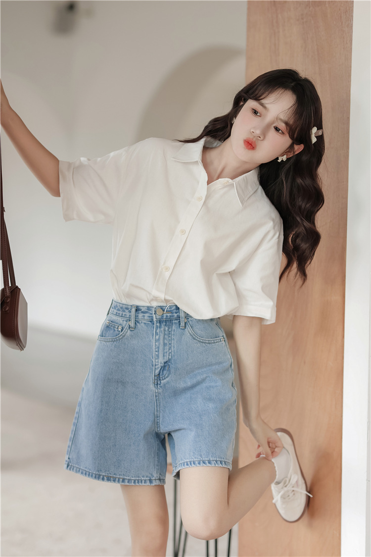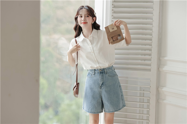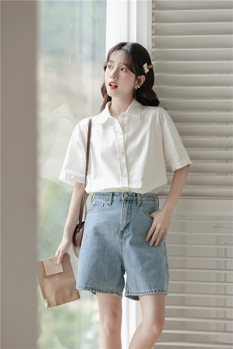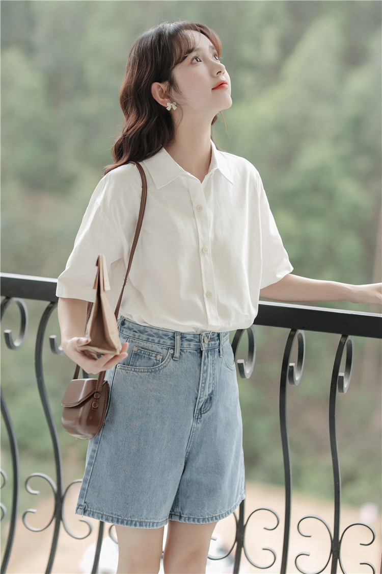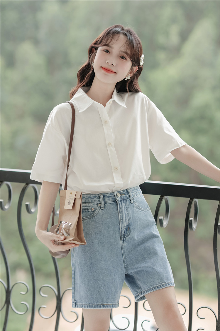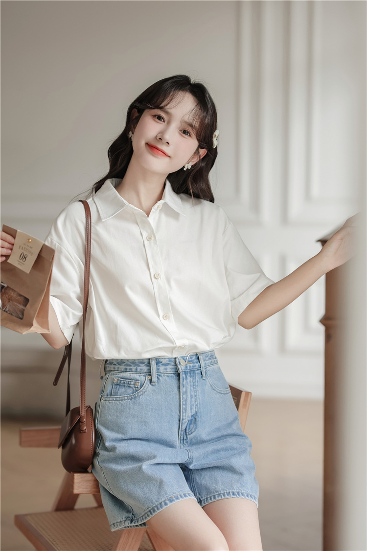 반팔 화이트 셔츠 여성용 2023 여름 새로운 한국 스타일 심플 라펠 루즈한 슬리밍 만능 학생 셔츠스토어 가기