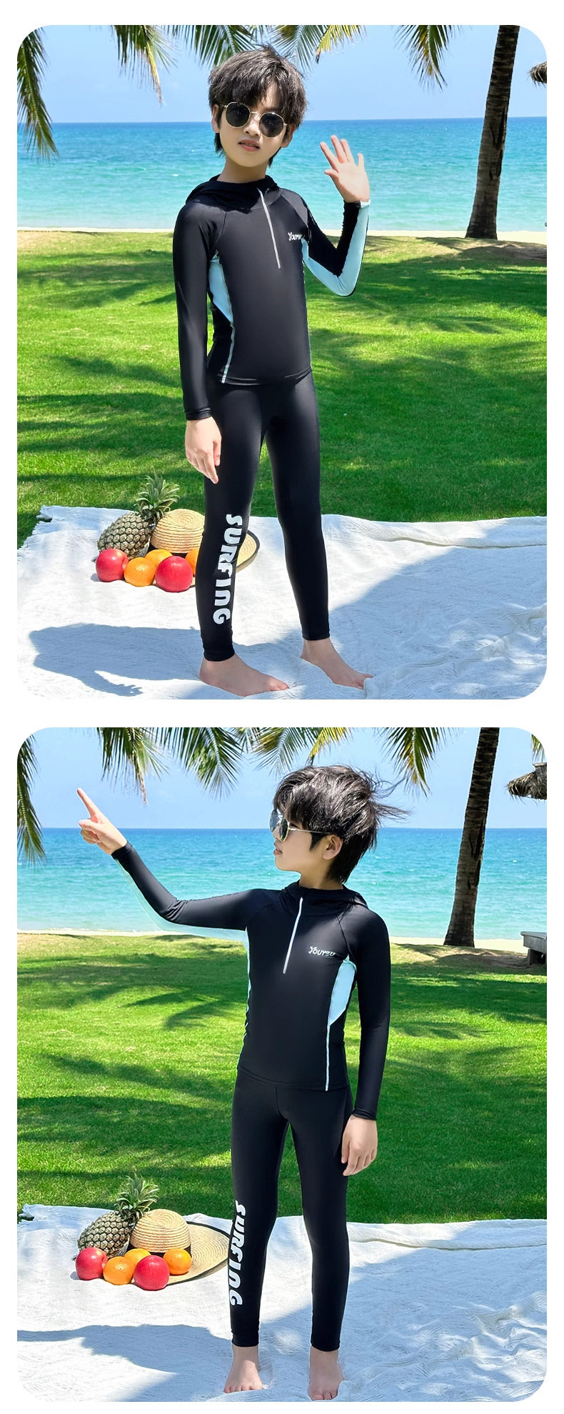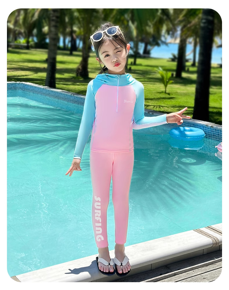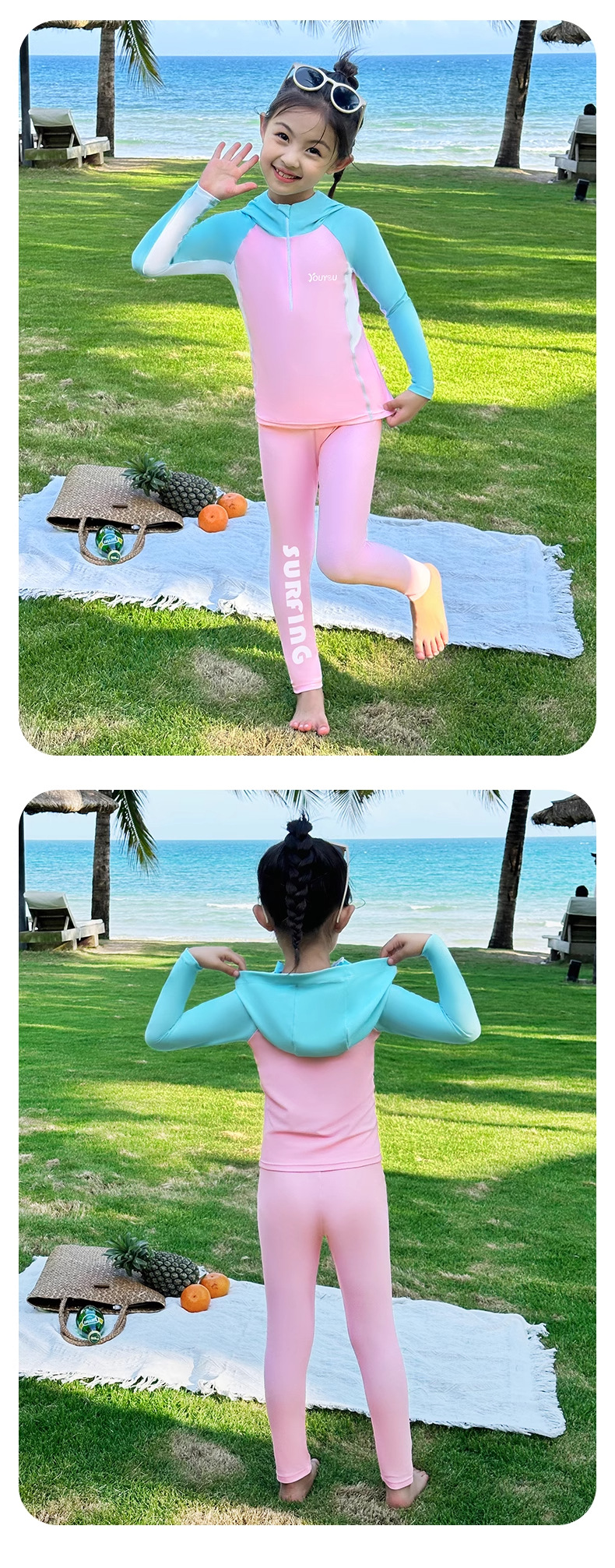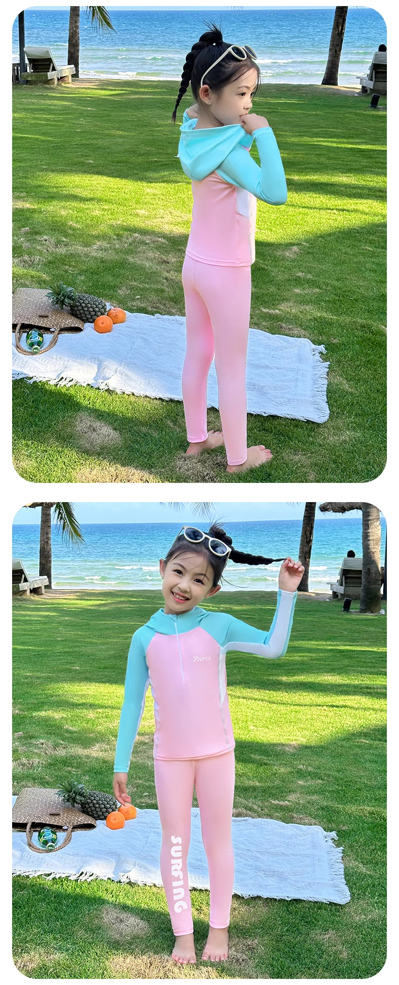 어린이 수영복 여성용 스플릿 투피스 긴팔 바지 컬러 매칭 소형, 중형 및 대형 어린이 자외선 차단 라운드 넥 보수적 인 온천 수영복스토어 가기