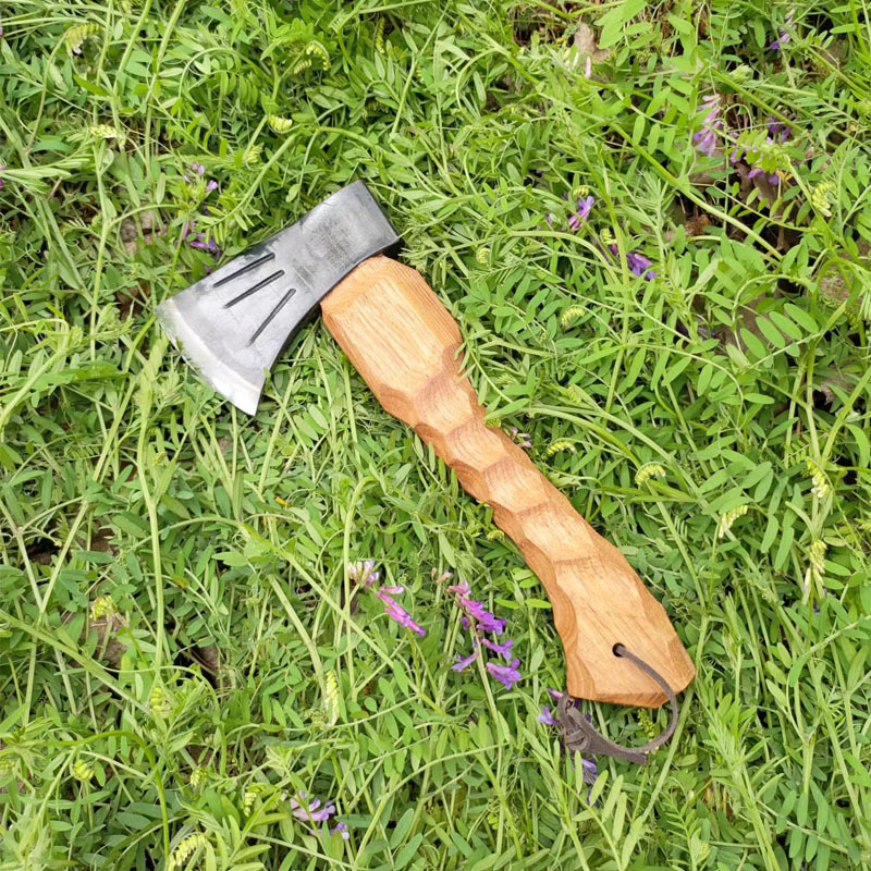 手柄材质采用北美山核桃木,柄身凌型设计个性实足由工匠人工雕刻而成。斧头锰钢锻打热处理后硬度可达55-58度。斧柄全长290mm,韧长79mm总重640undefined