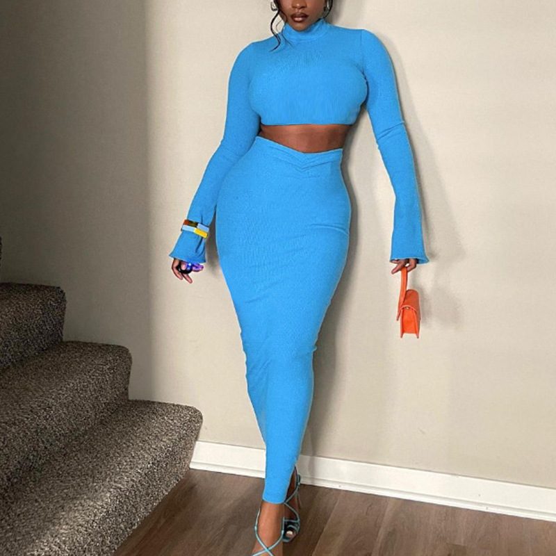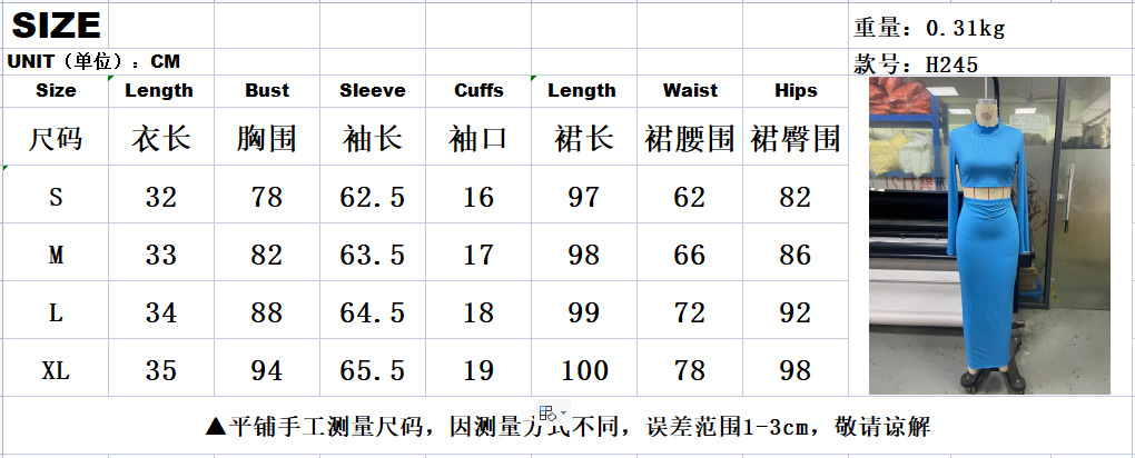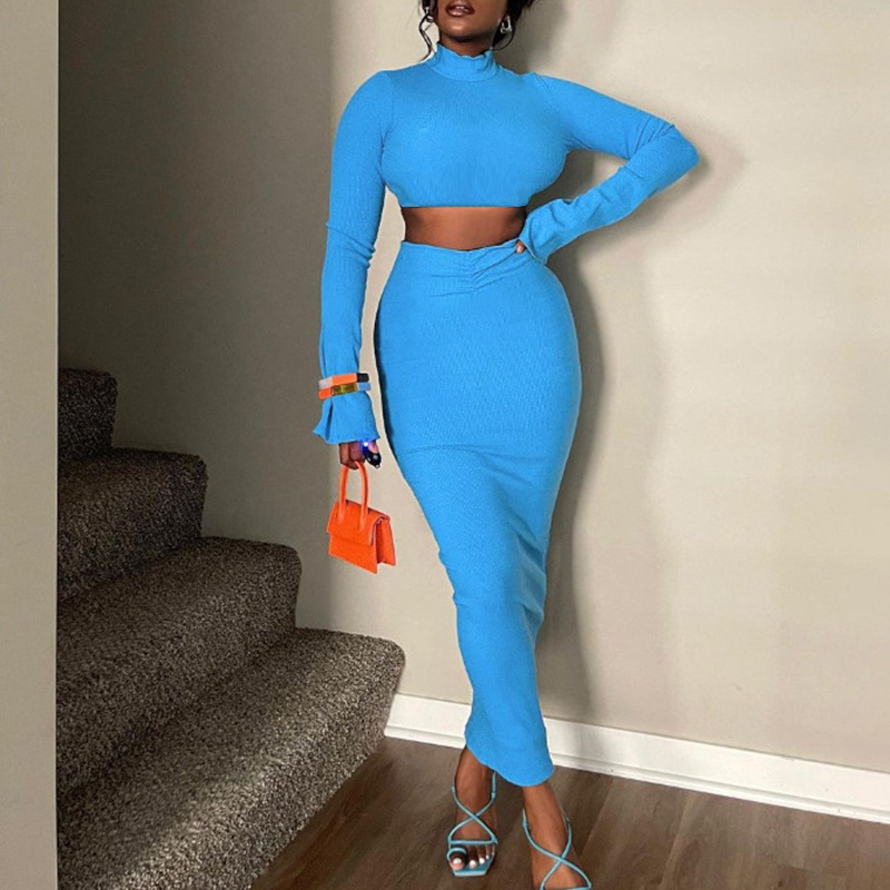 유럽과 미국 크로스 보더 2023 여름 새로운 여자의 우아한 세트 단색 배꼽 뿔 소매 최고 주름 긴 원피스