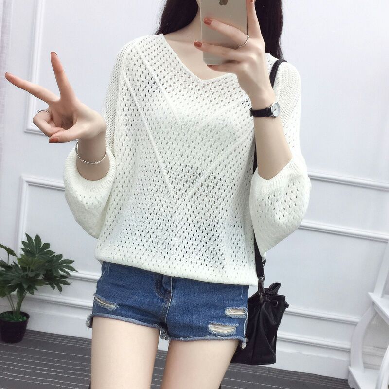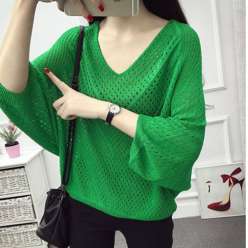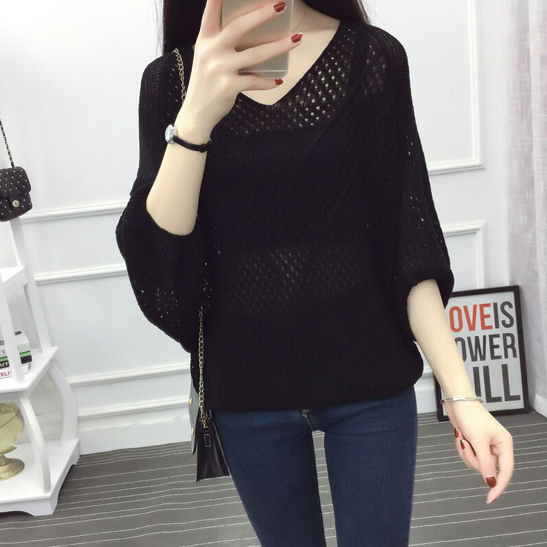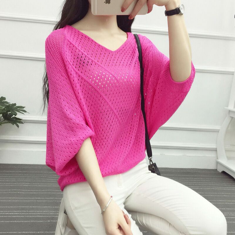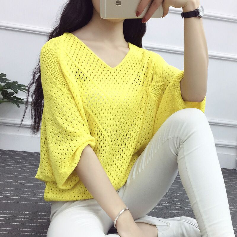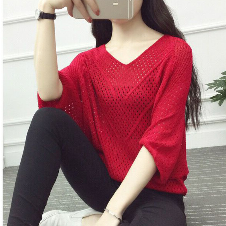 봄 여름 얇은 브이넥 풀오버 니트 여성 상의 2025년 7부 소매 레이스 스웨터 여성 루즈핏 배트 셔츠스토어 가기