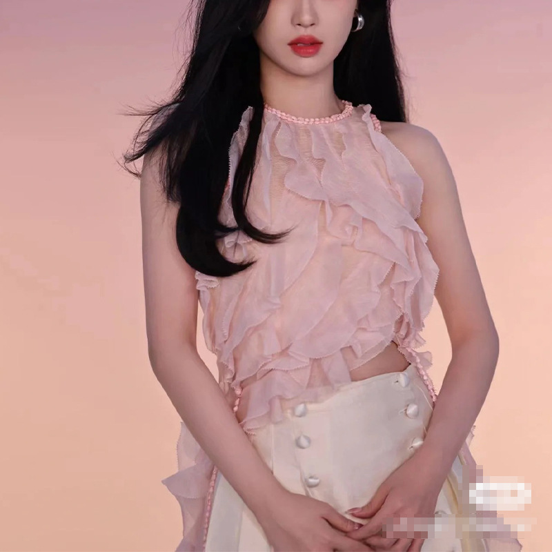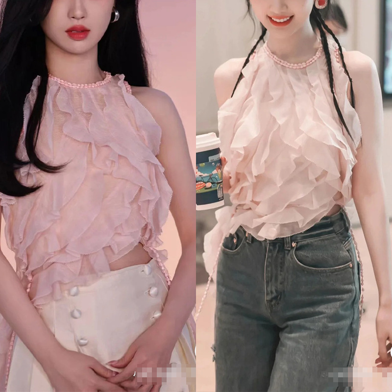 Yu Xinxin 마오 Xiaotong의 핑크 러플 넥 트레일링 탑 여성용 여름 헬로 토요일 셔츠스토어 가기
