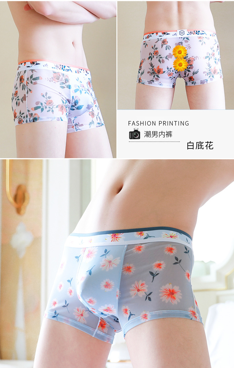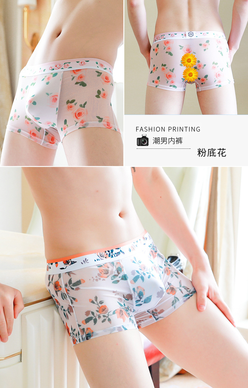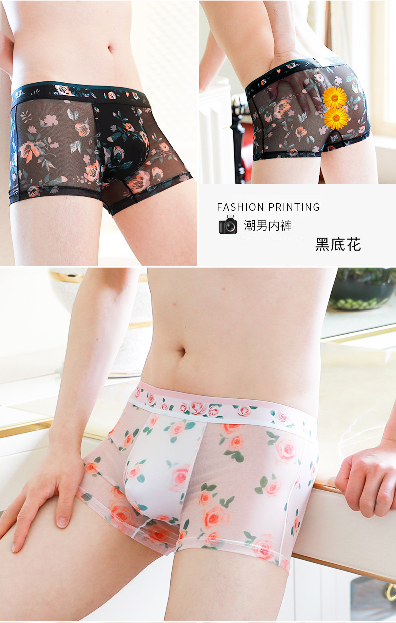 여름 얇은 남성 속옷 메쉬 투명 복서 섹시 통기성 인쇄 복서 반바지 헤드 허리 도매스토어 가기
