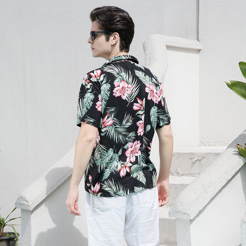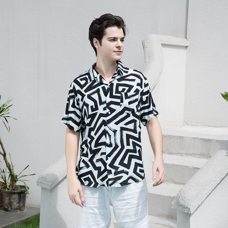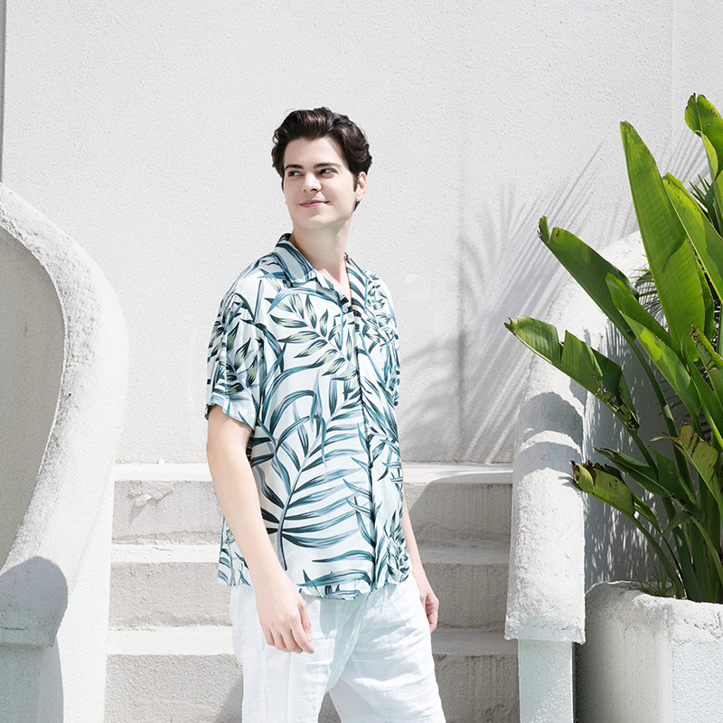 크로스 보더 남성용 하와이안 셔츠 유럽과 미국 레이온 인쇄 대외 무역 비치 셔츠 카디건 반팔 티셔츠 트렌디 한 디자인