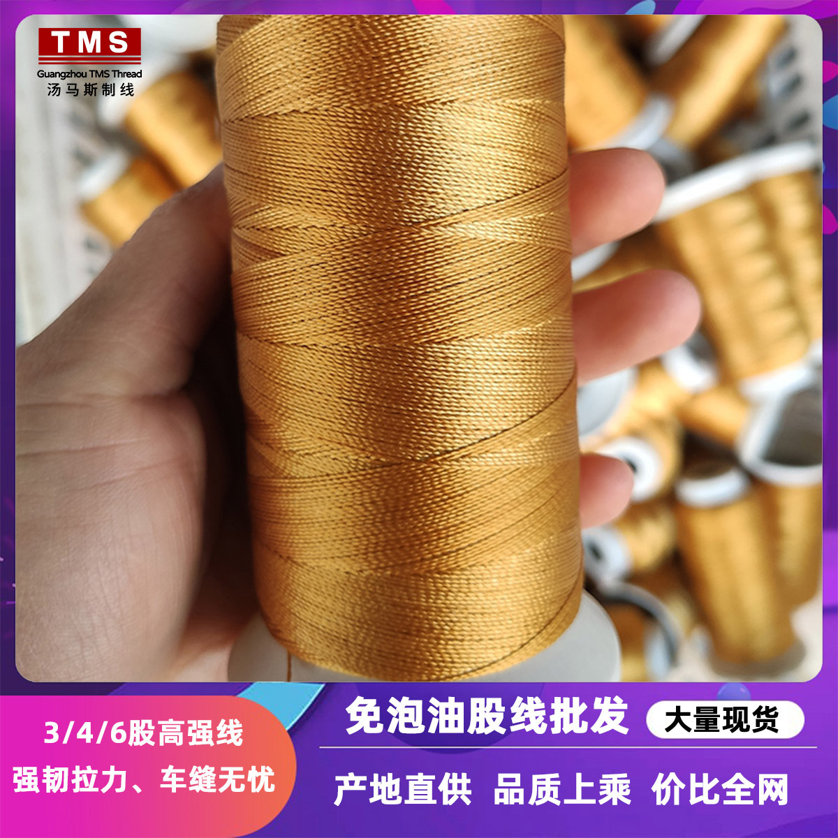 高强线:又叫特多龙线、涤纶线,是由连续涤纶高强低伸长丝捻合而成,耐温130度,色泽亮丽, 拉力高,低延伸率,无弹性,广泛使用于日常家居生活用品上,如:家具床具、服装鞋帽、皮具手袋、服饰玩具等制品的缝纫上。。