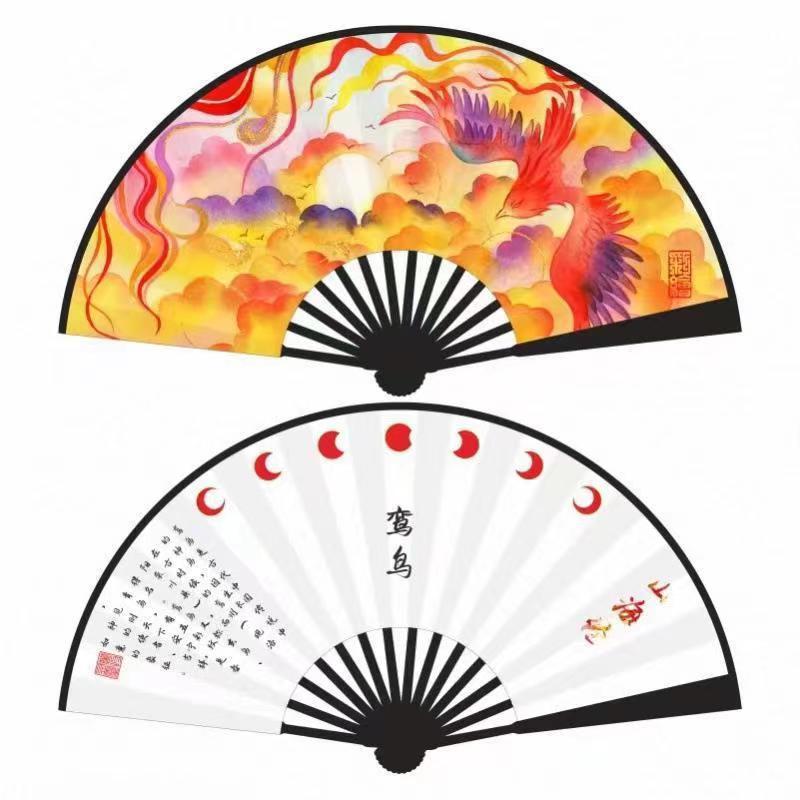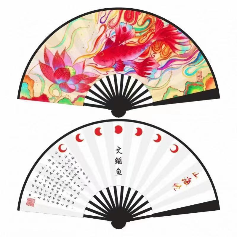 여름의 앤틱 대나무 뼈 양면 실크 천 접는 부채 10 인치 블랙 로드 전국 조수 바람 빈 비문 중국 고전 대나무 부채스토어 가기